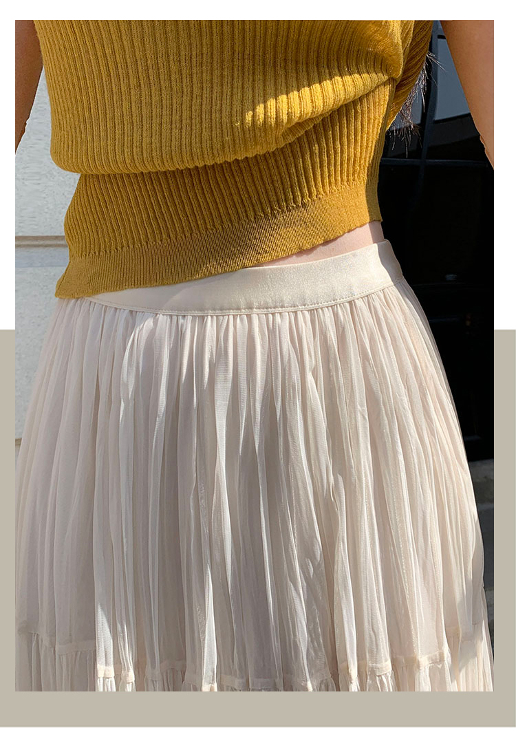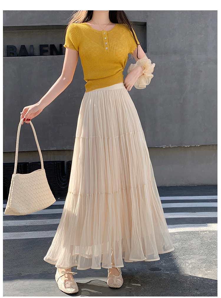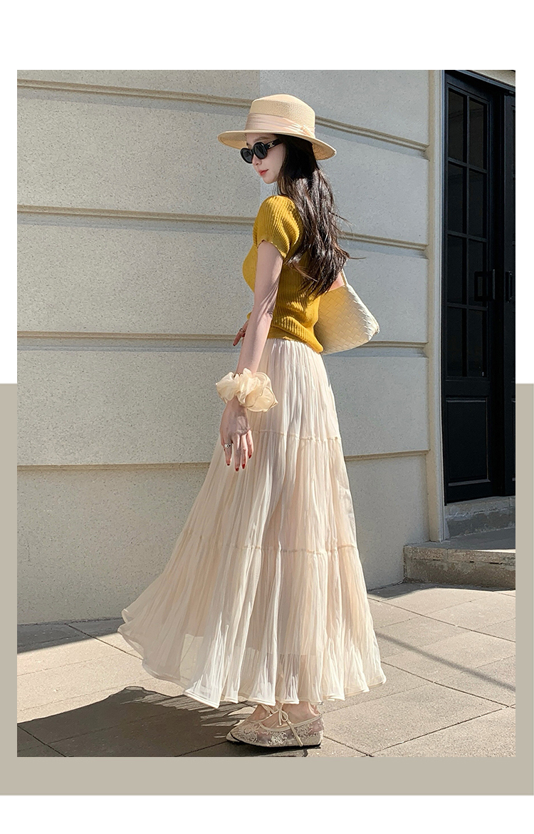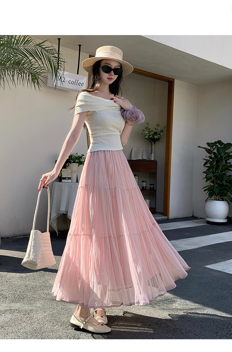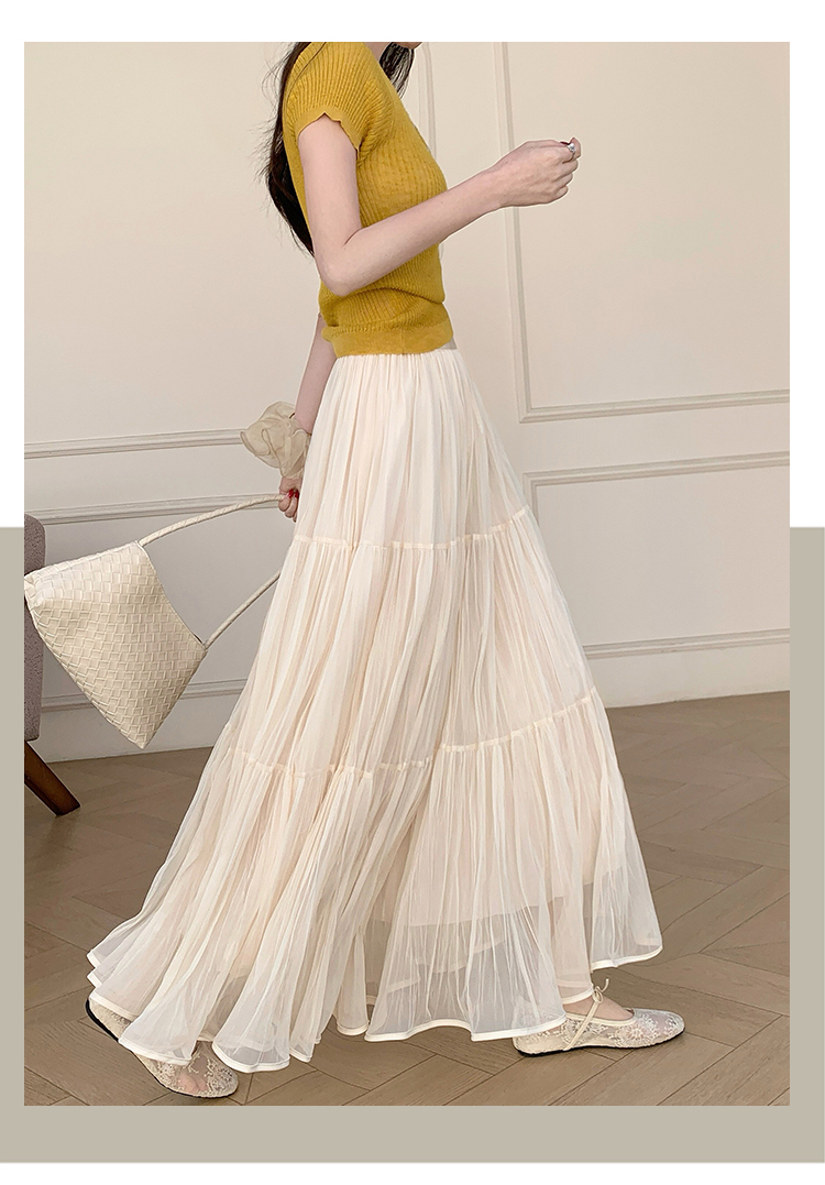 슈퍼 요정 망사 한 마디 플리츠 롱 스커트 여성 2026 봄 여름 새로운 휴가 바람 슬림해 보이는 표지 십자가 단색 반신 스커트