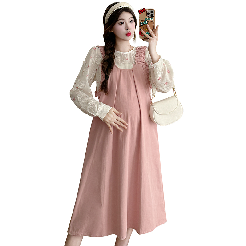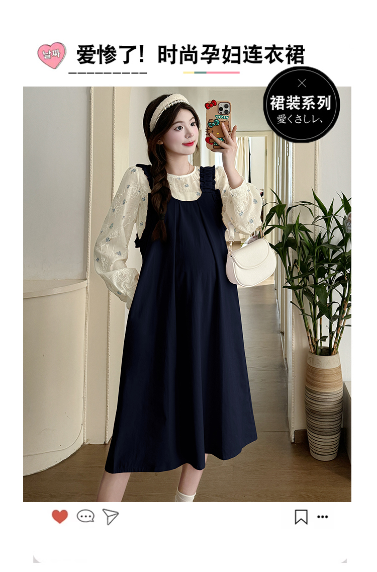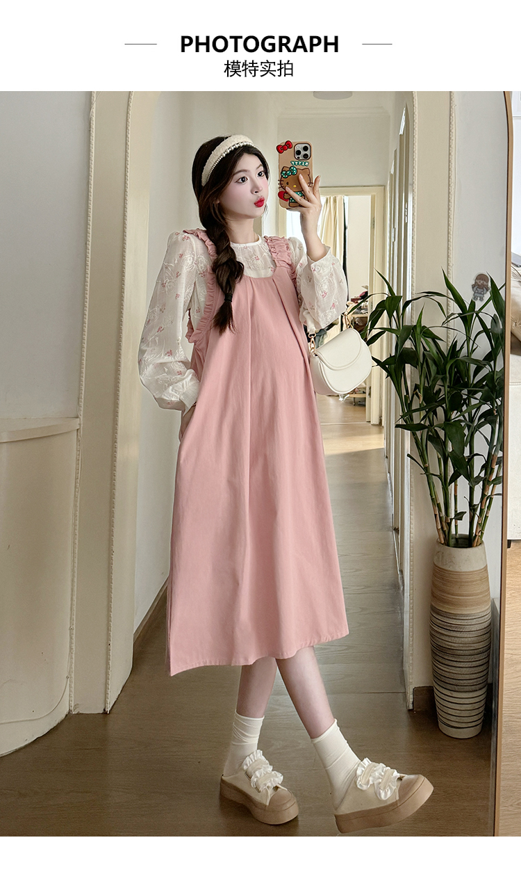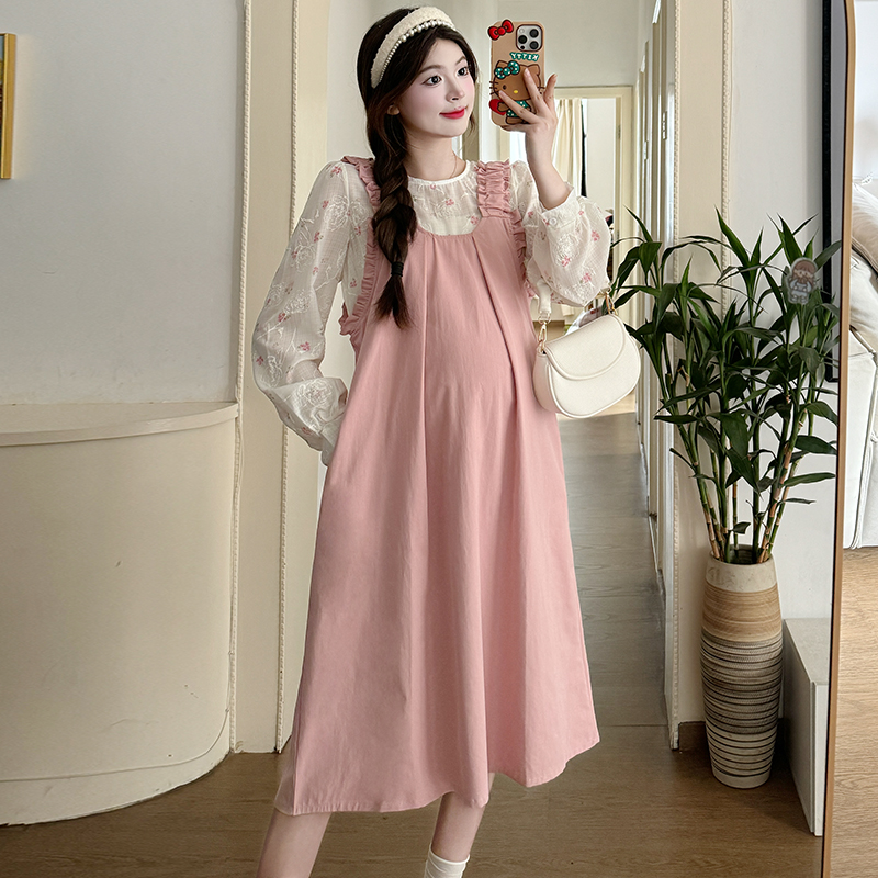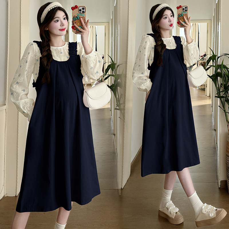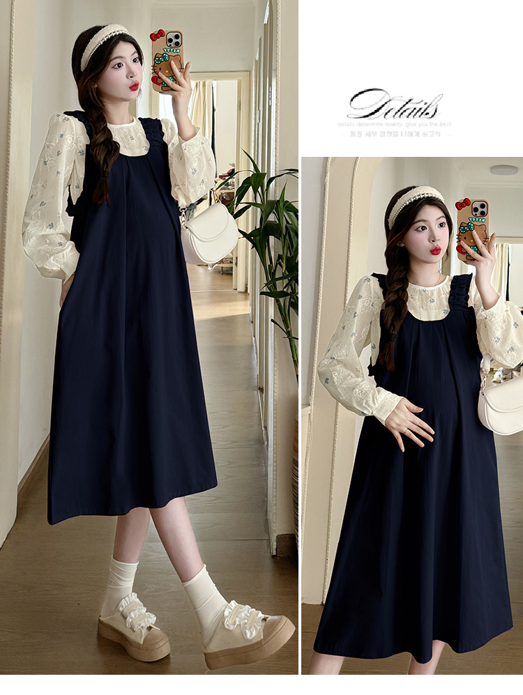 실사 2026 봄 루즈핏 라운드 넥 긴팔 셔츠 경기 멜빵 스커트 한국 스타일 투피스 세트 임산부 드레스