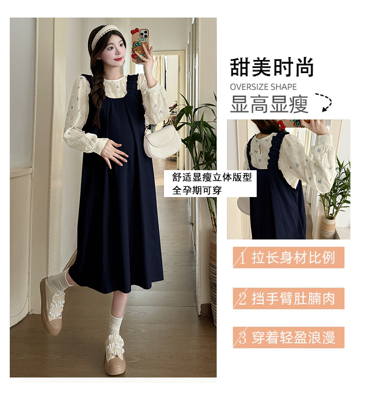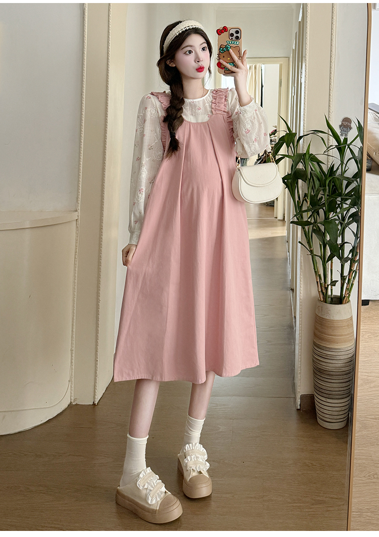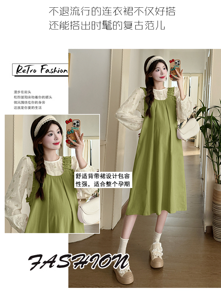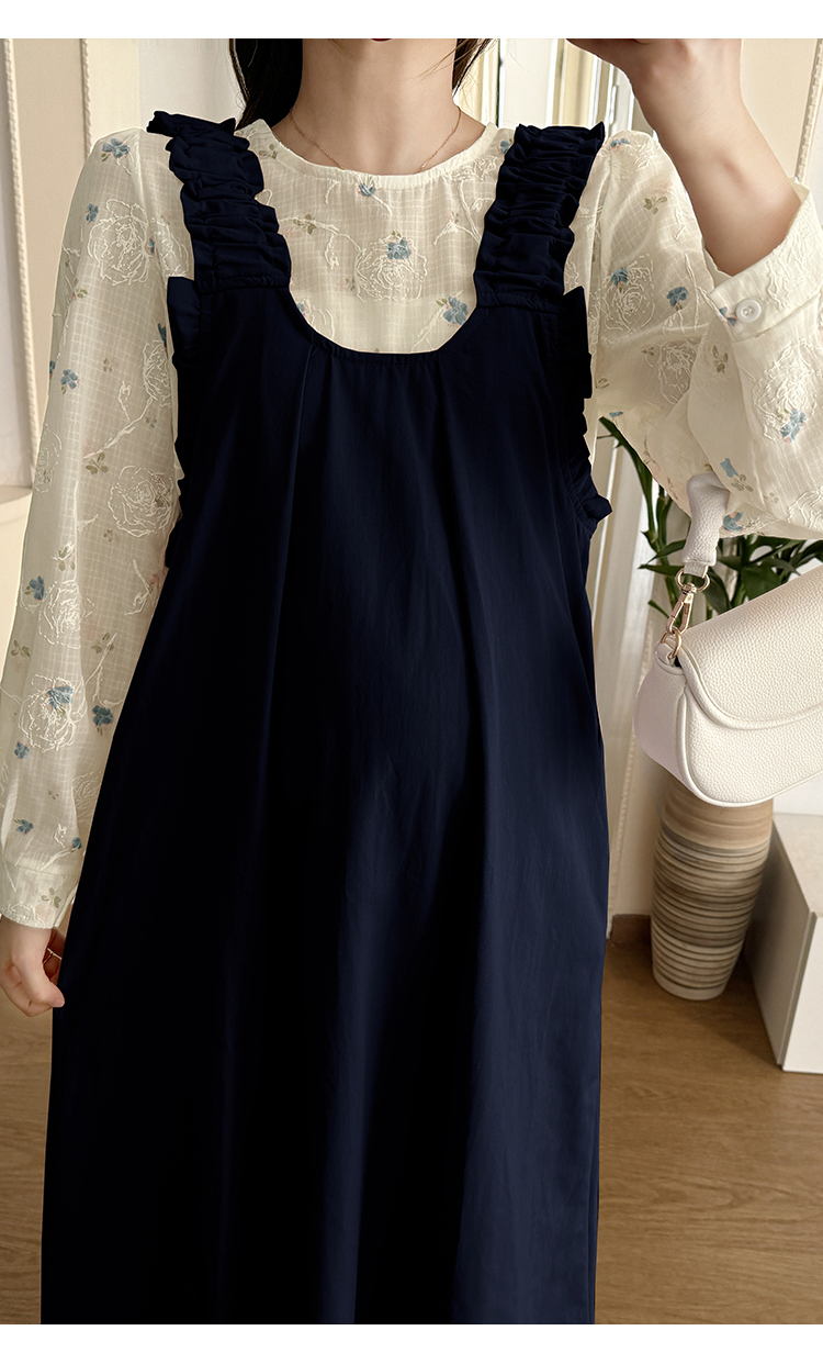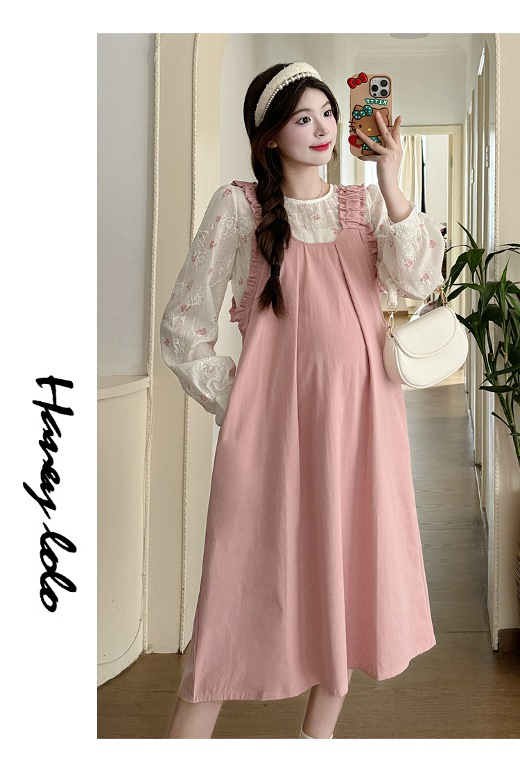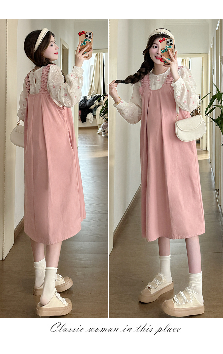 실사 2026 봄 루즈핏 라운드 넥 긴팔 셔츠 경기 멜빵 스커트 한국 스타일 투피스 세트 임산부 드레스