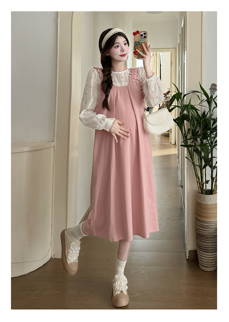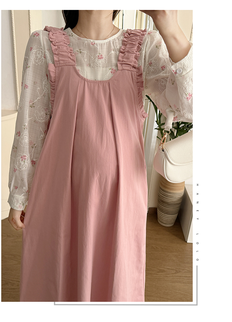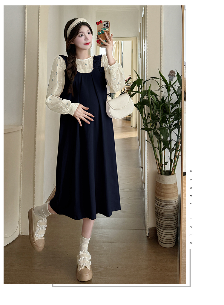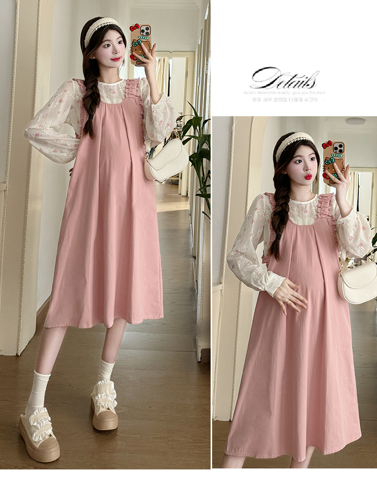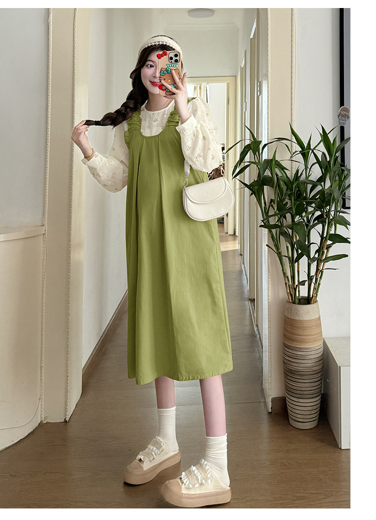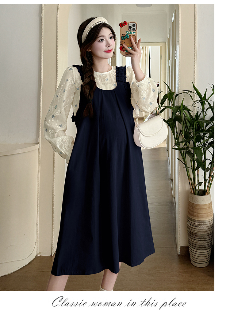 실사 2026 봄 루즈핏 라운드 넥 긴팔 셔츠 경기 멜빵 스커트 한국 스타일 투피스 세트 임산부 드레스