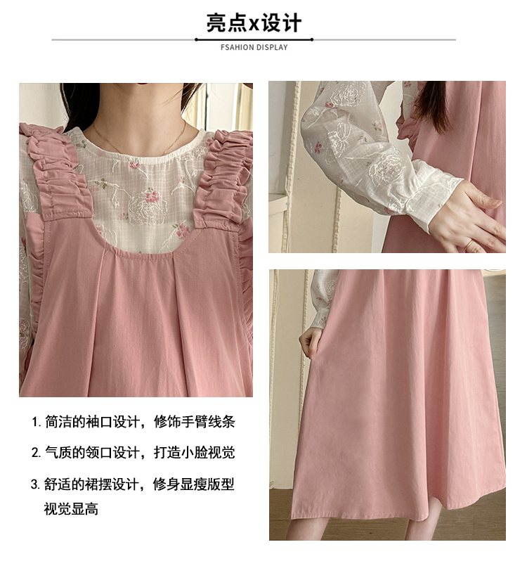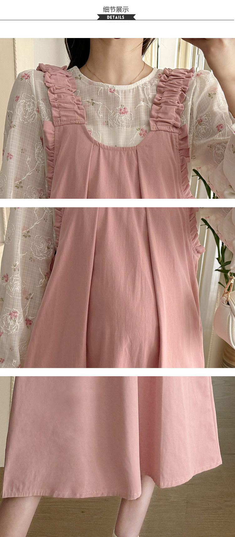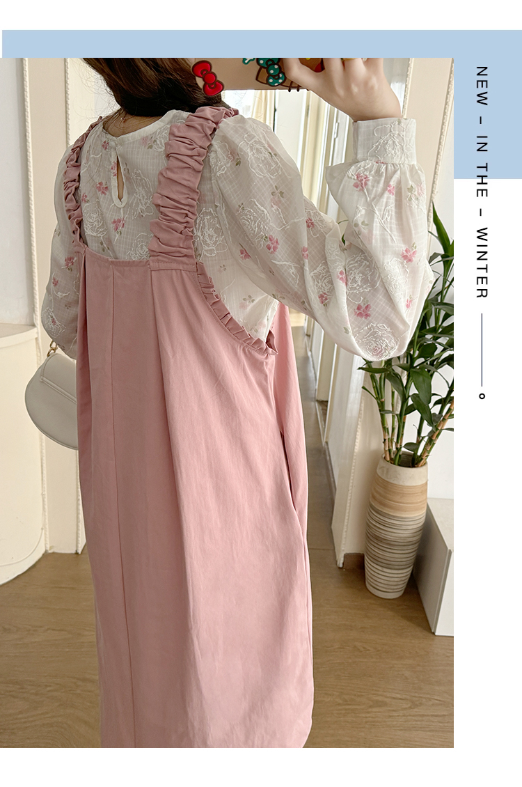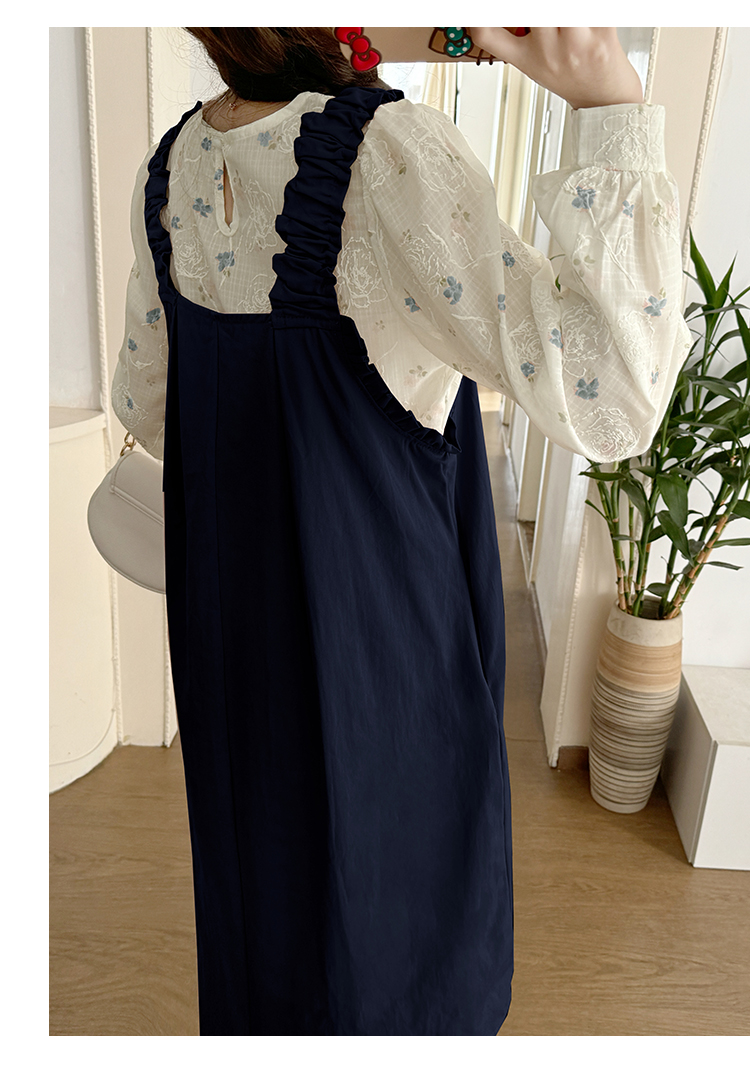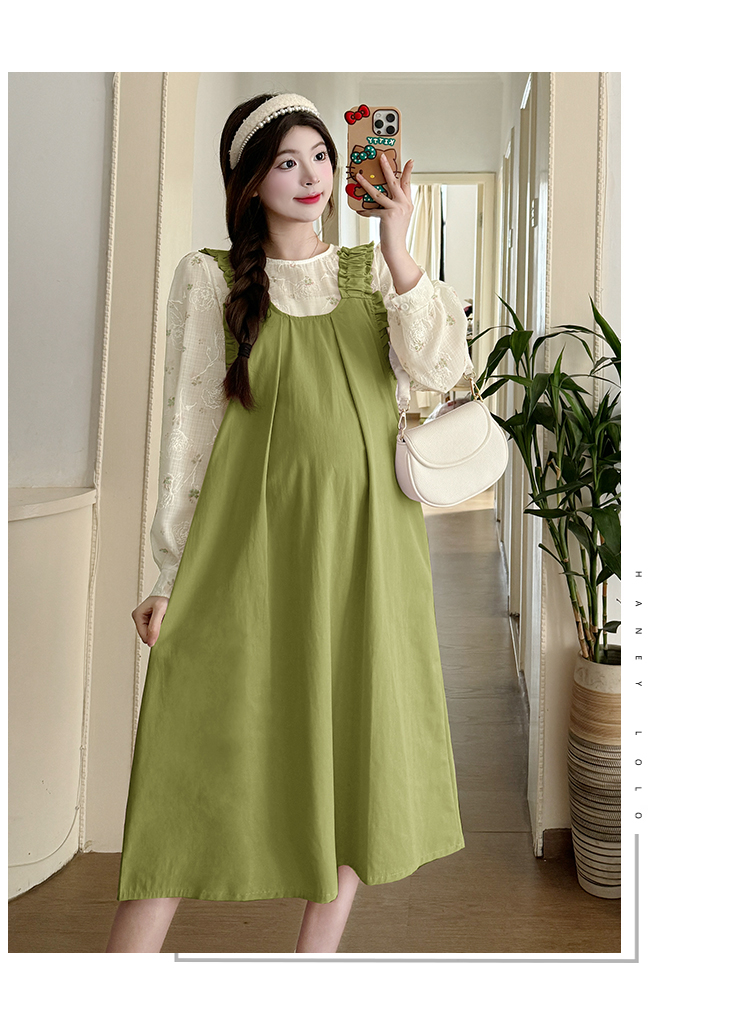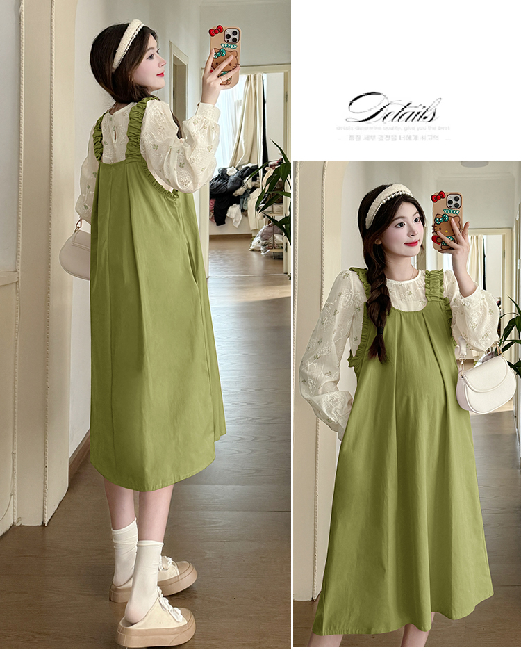 실사 2026 봄 루즈핏 라운드 넥 긴팔 셔츠 경기 멜빵 스커트 한국 스타일 투피스 세트 임산부 드레스