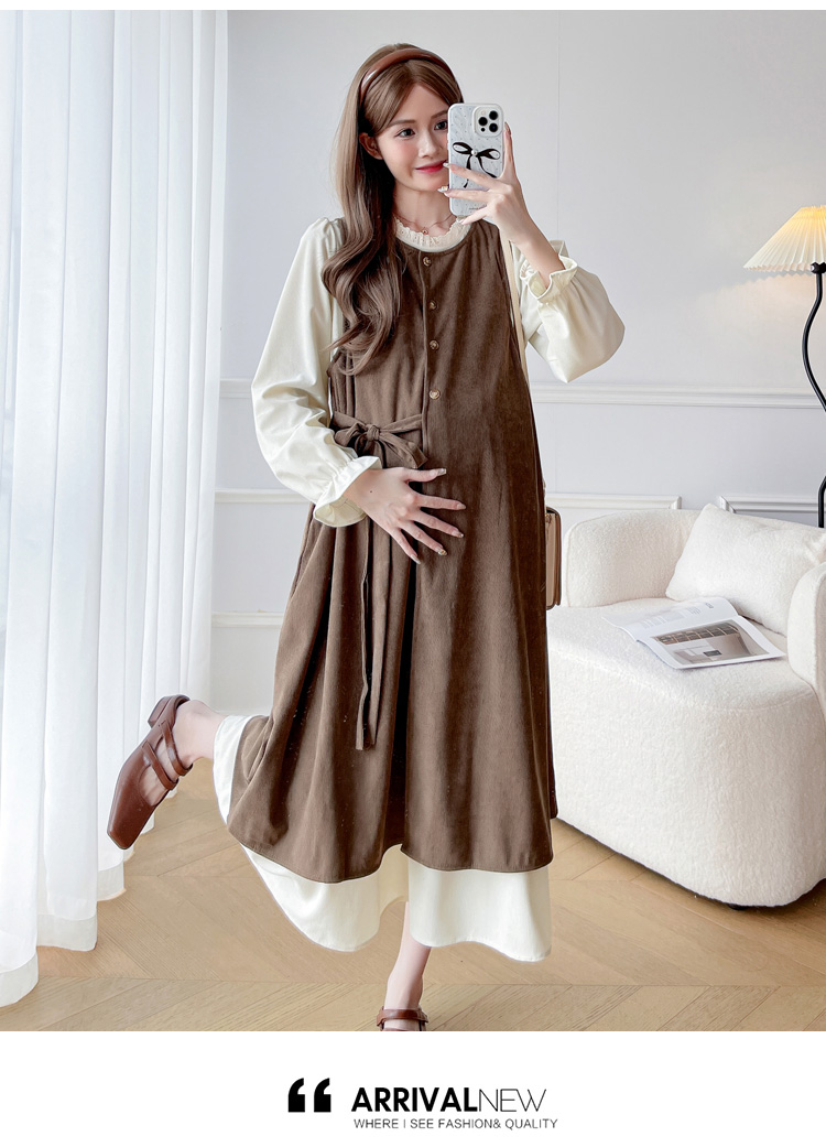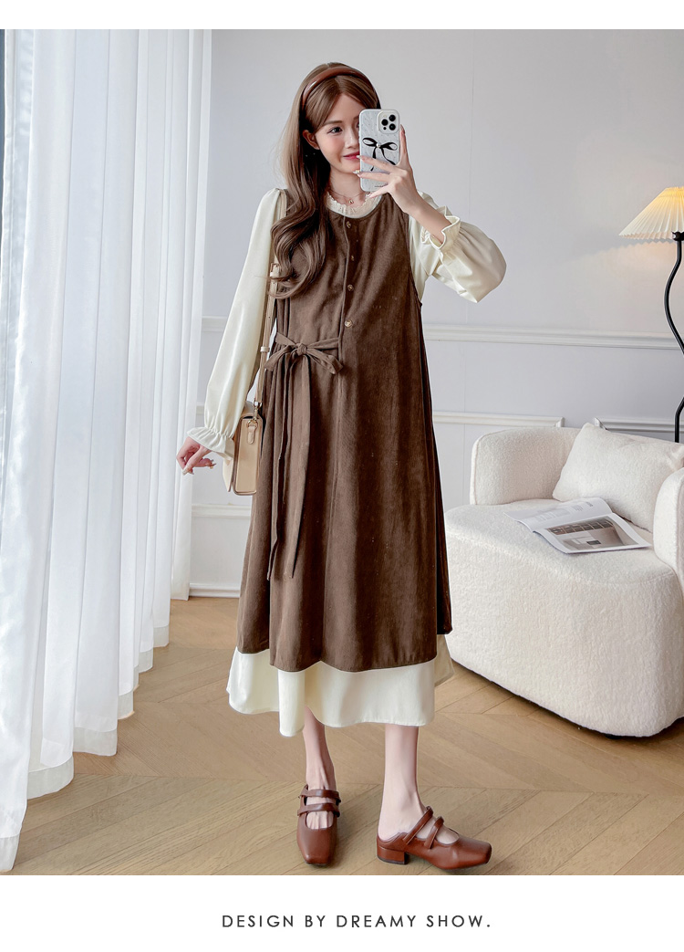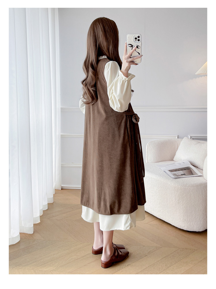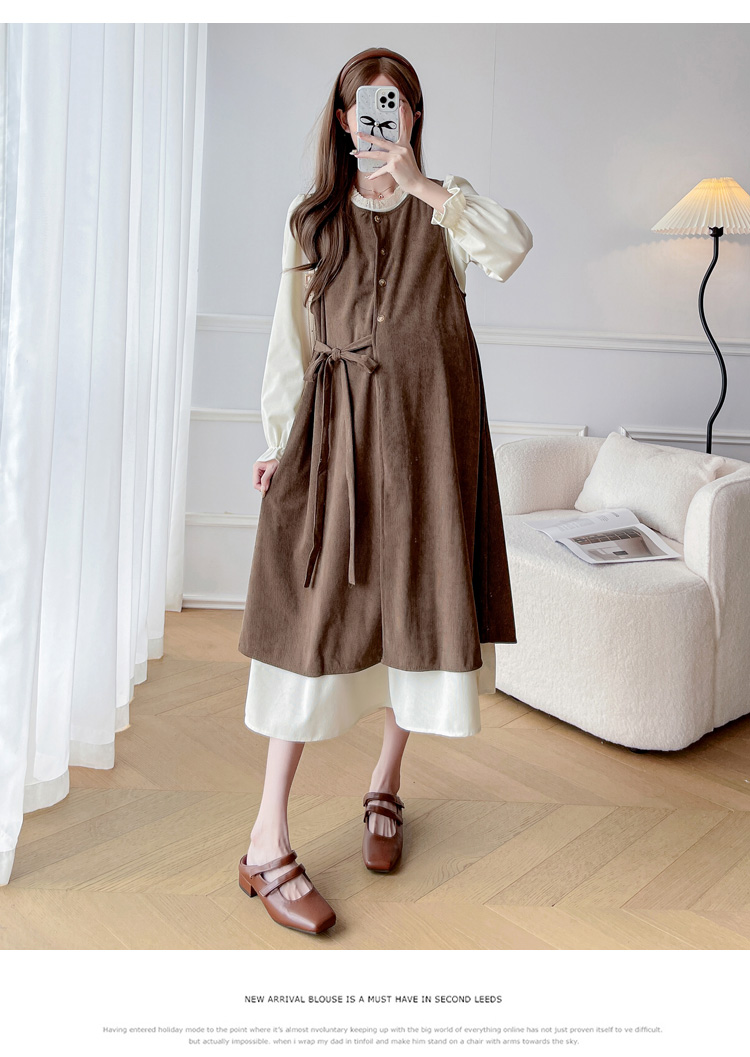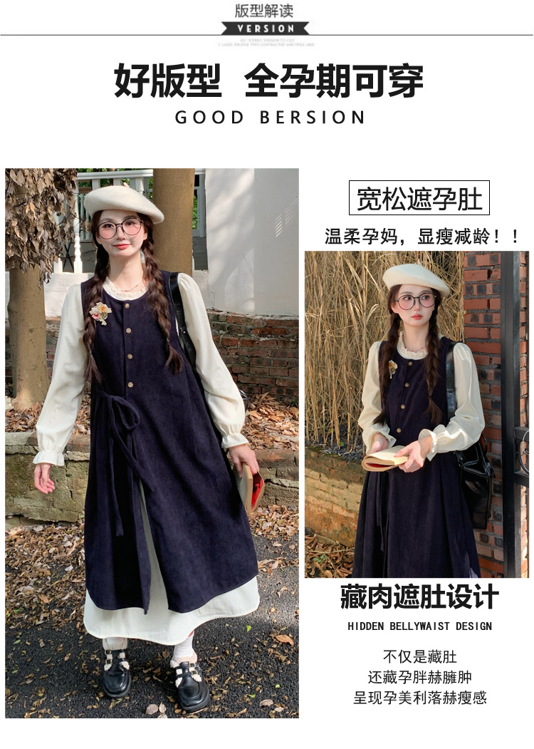 실사 한 부서 스택 착용 조끼 원피스 임산부 가을 새로운 디자인 센스 레이스업 루즈핏 슬림해 보이는 A라인 스커트