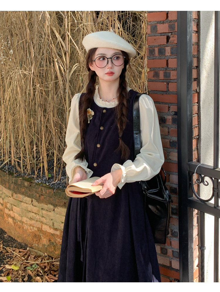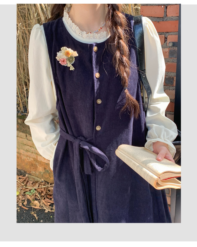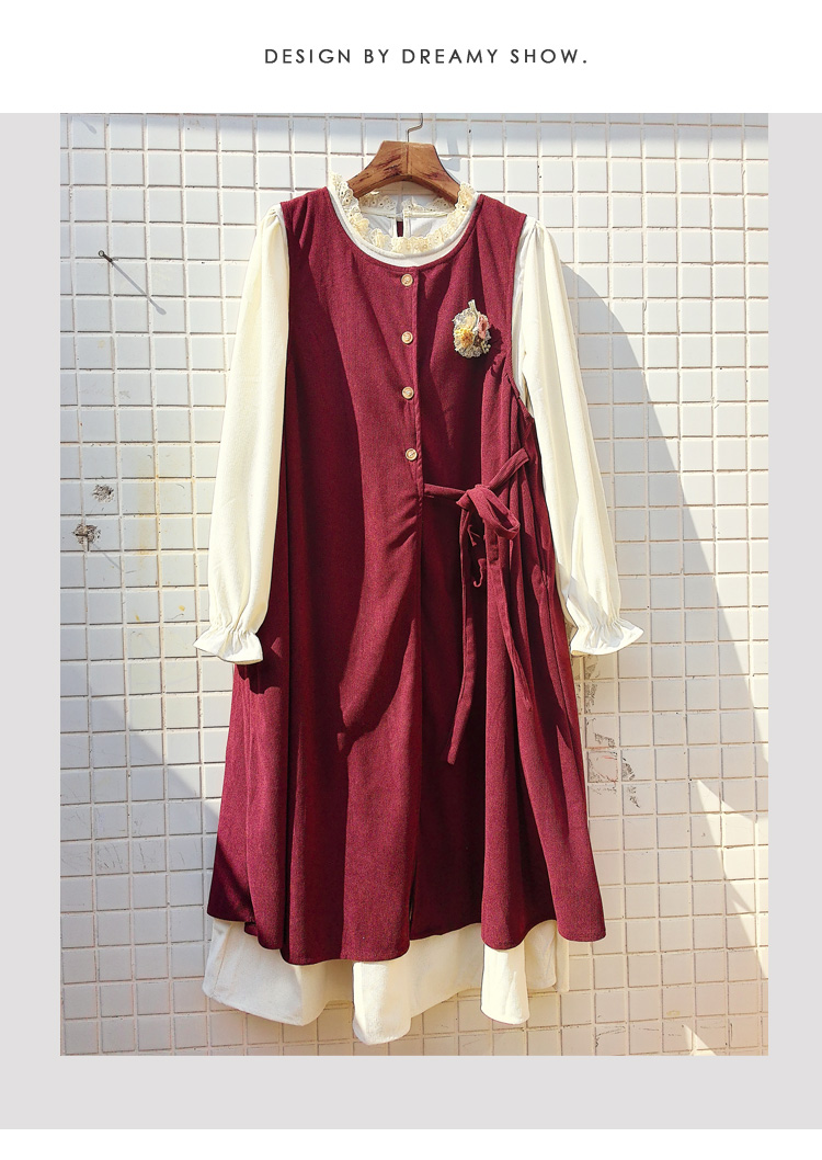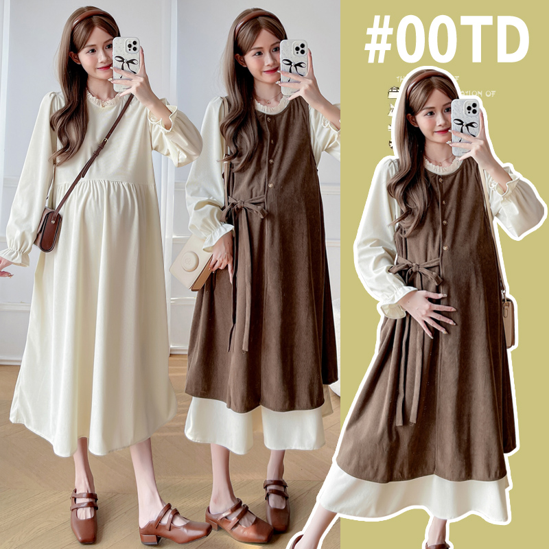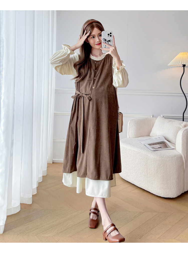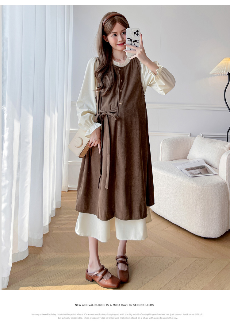 실사 한 부서 스택 착용 조끼 원피스 임산부 가을 새로운 디자인 센스 레이스업 루즈핏 슬림해 보이는 A라인 스커트