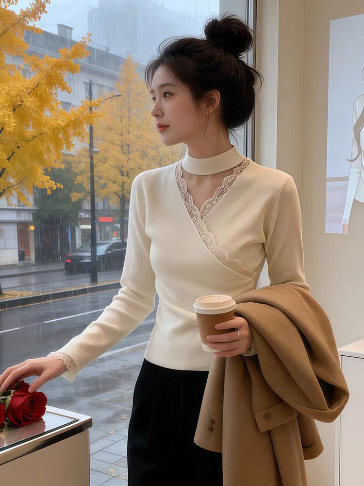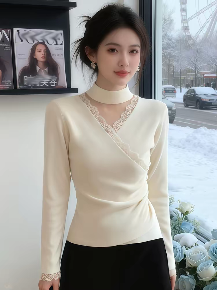 2026 조기 봄 새로운 행침 목 칼라 긴팔 레이스 조각 십자가 네클라인 기본 셔츠 몸매 가꾸기 슬림해 보이는 여성 셔츠