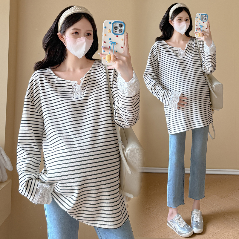 실사 2026 봄 새로운 출산 착용 스트라이프 맨위 루즈핏 빅 사이즈 여성 니트 스웨터 레이스 레이스 트렌디