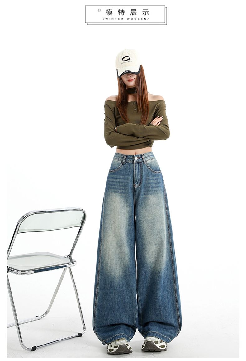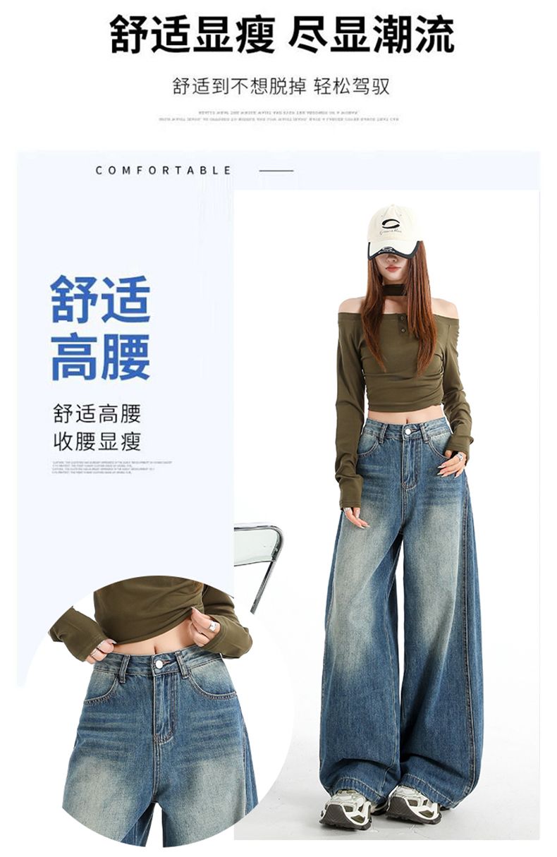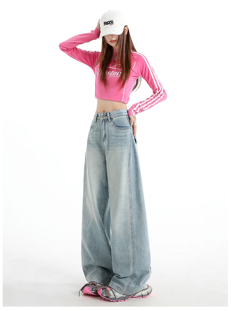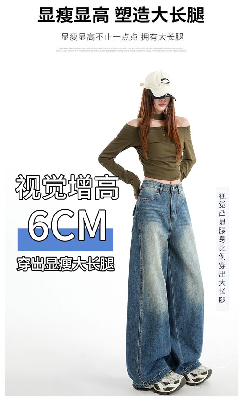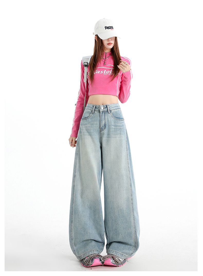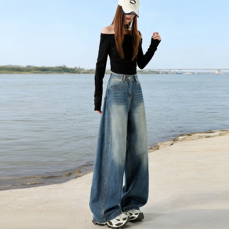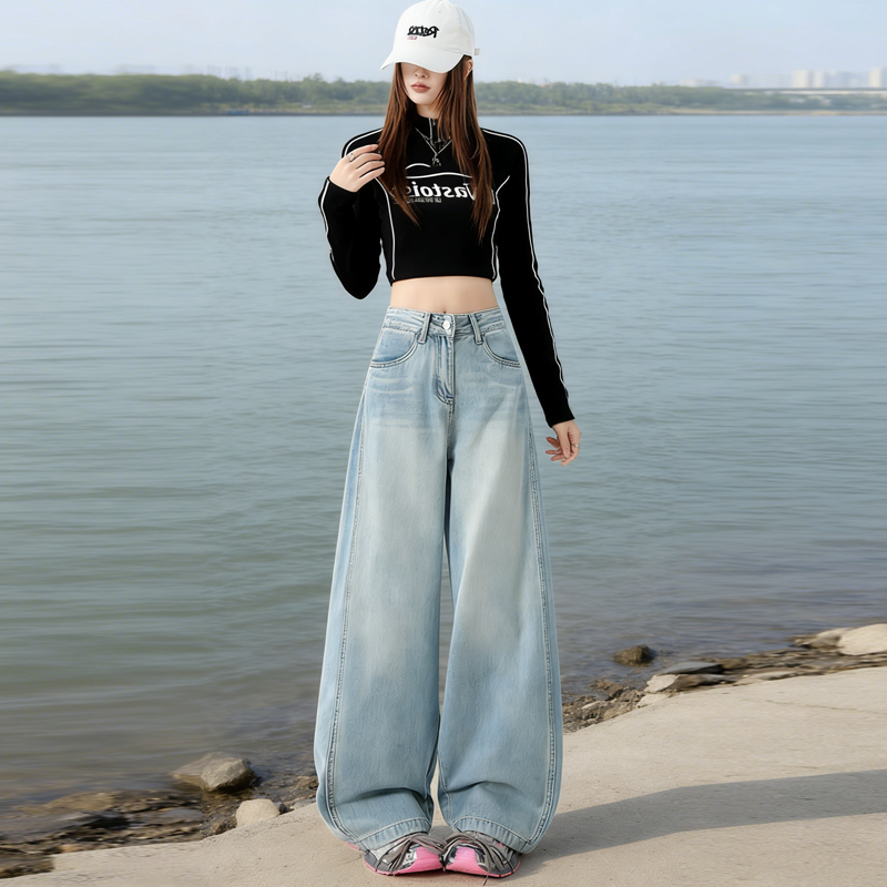 실사 Gypsophila 플래시 훈련 봄 새로운 하이웨이스트 아메리칸 좁은 에디션 스트레이트 넓은 다리 청바지 여성 루즈핏 바닥 청소 바지