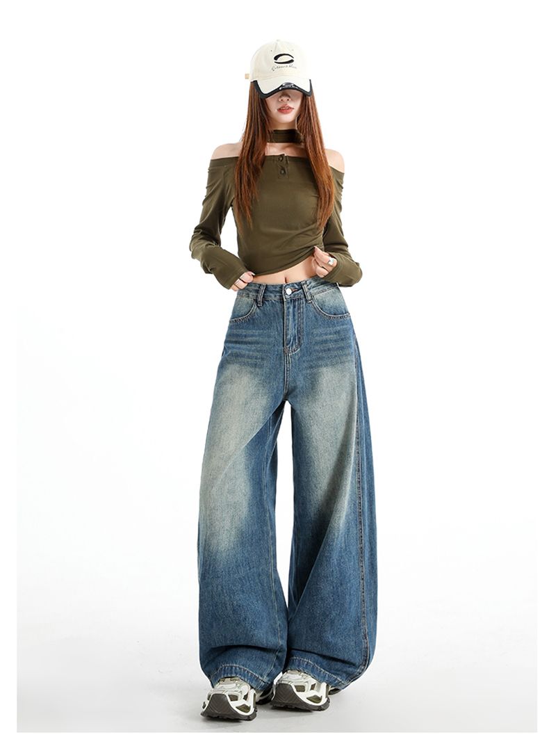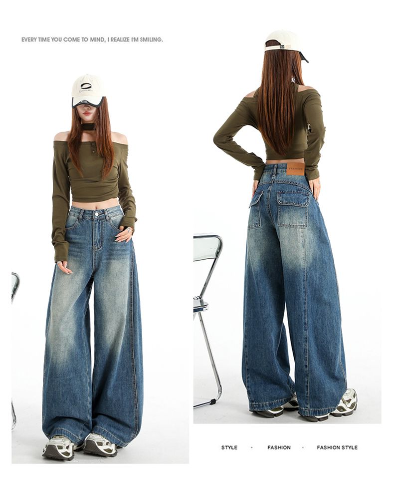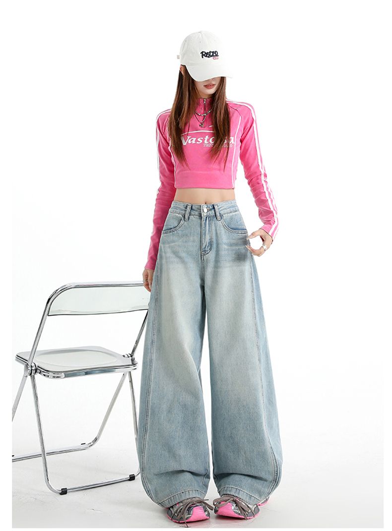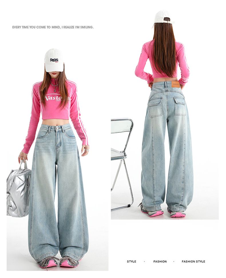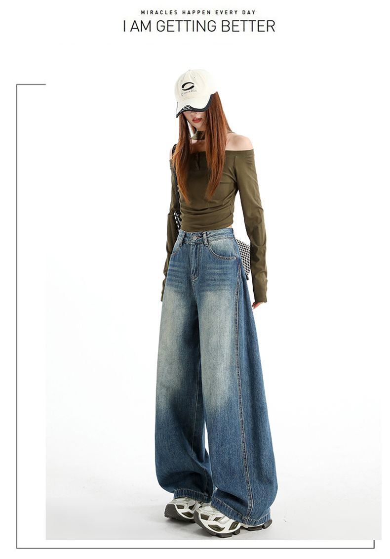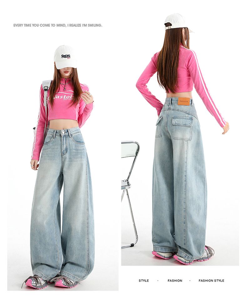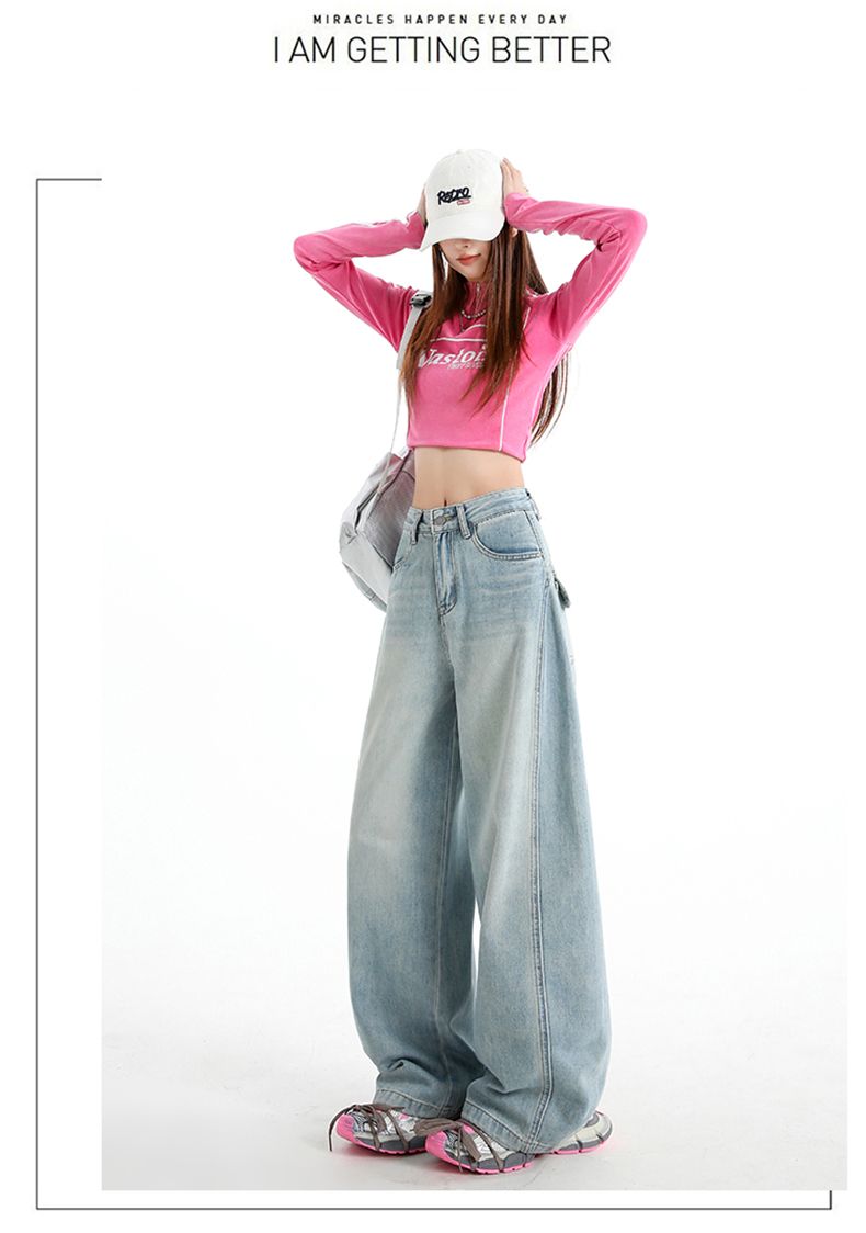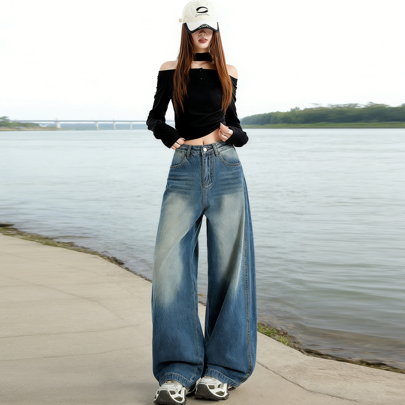 실사 Gypsophila 플래시 훈련 봄 새로운 하이웨이스트 아메리칸 좁은 에디션 스트레이트 넓은 다리 청바지 여성 루즈핏 바닥 청소 바지