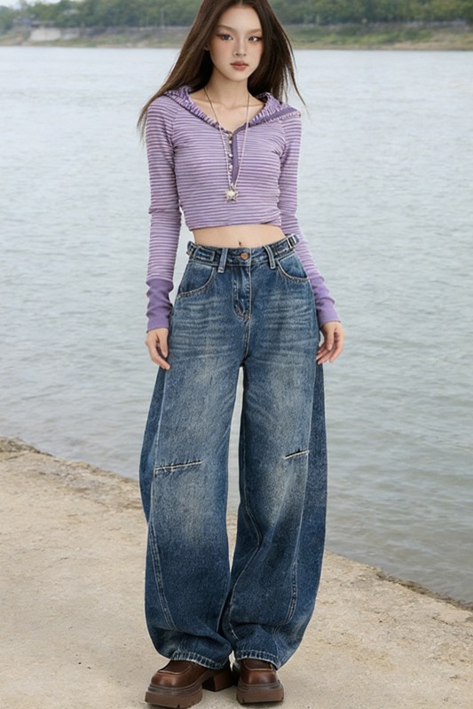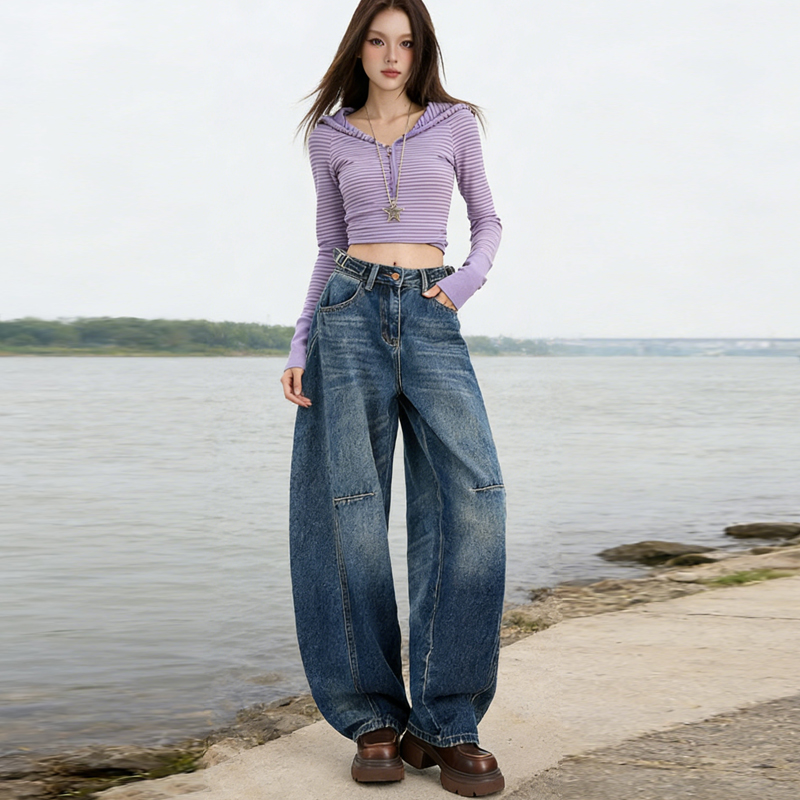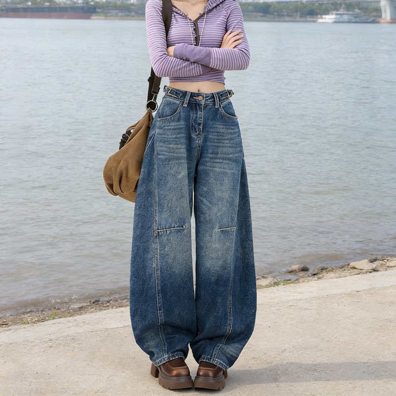 실사 2026 봄 새로운 하늘색 레트로 하이웨이스트 루즈핏 와이드 레그 팬츠 스트레이트 청바지 여성
