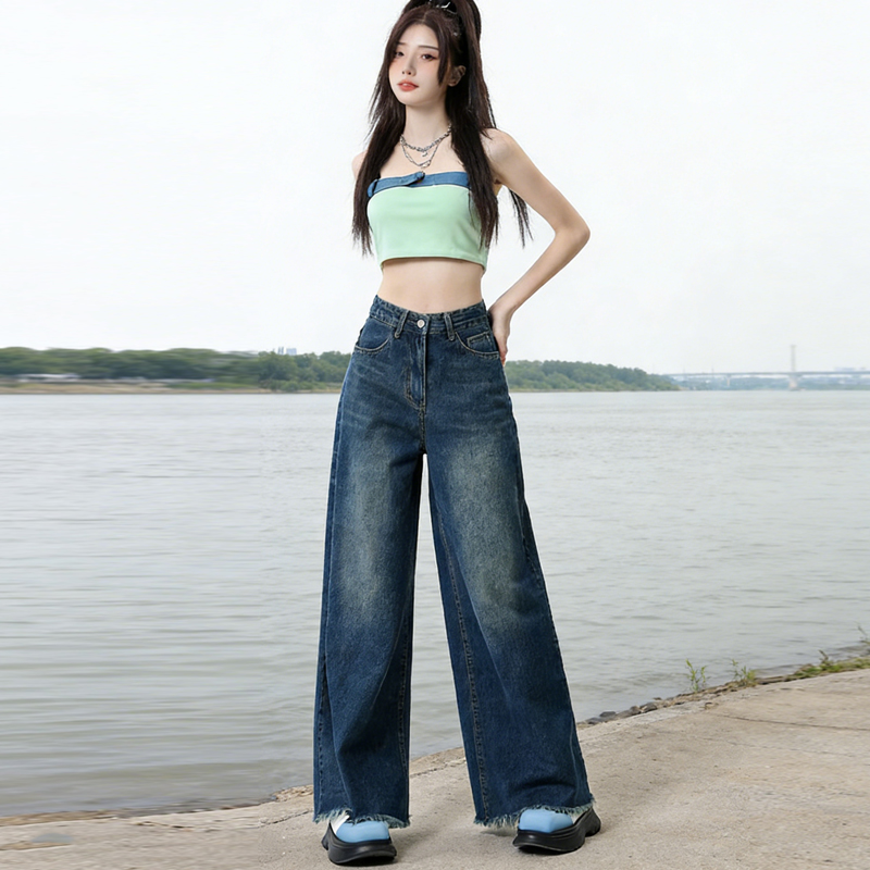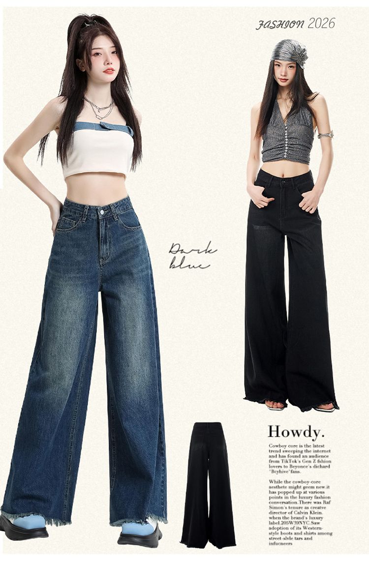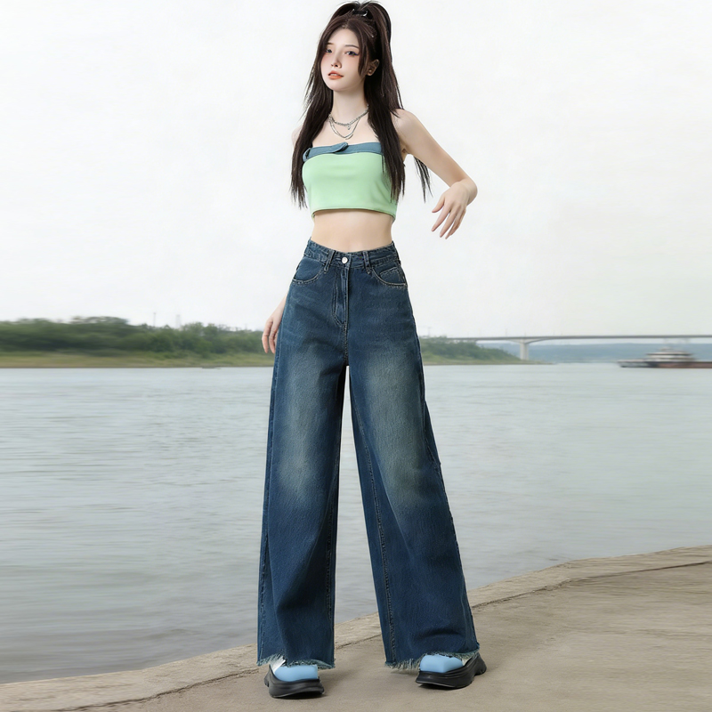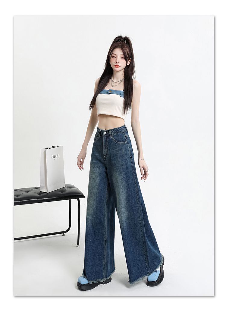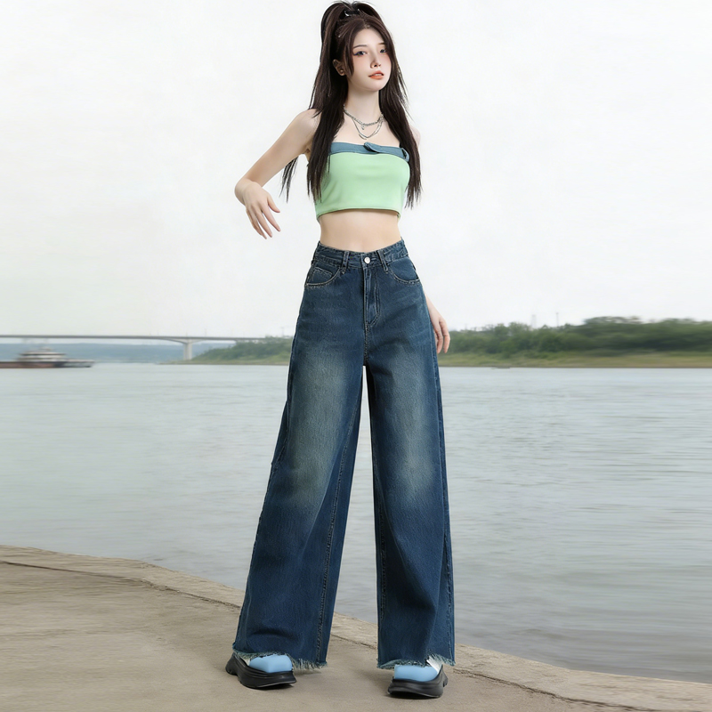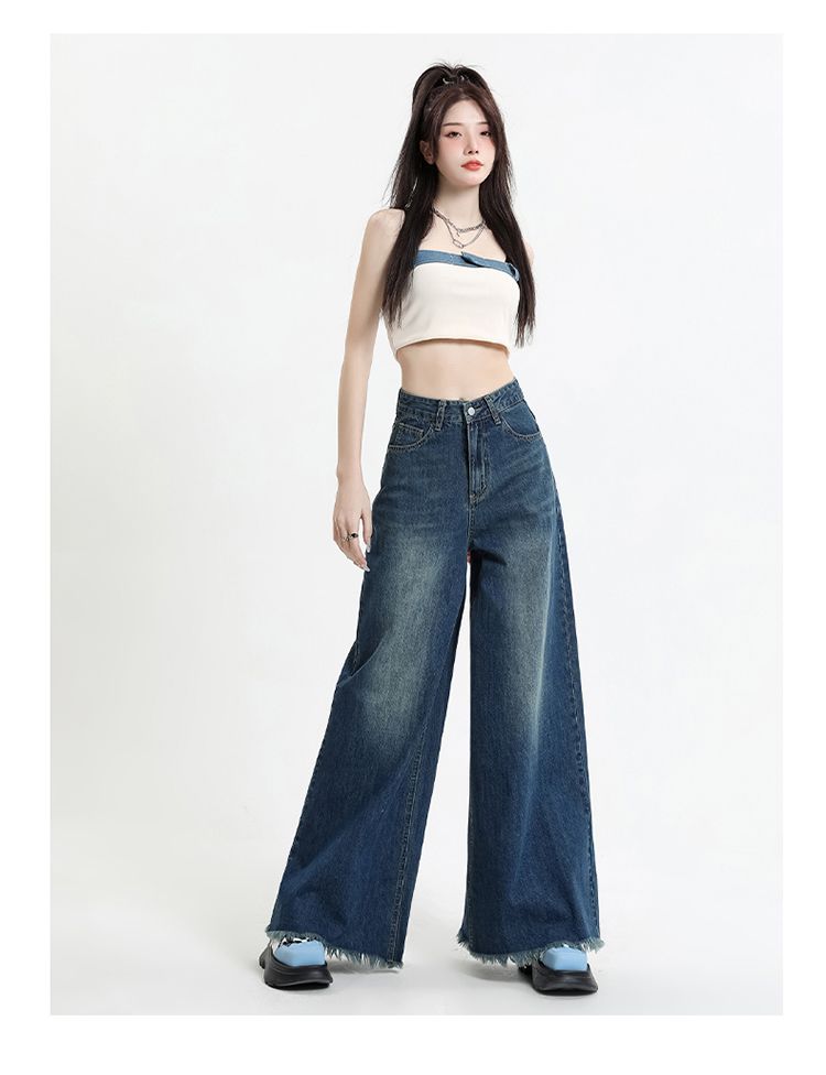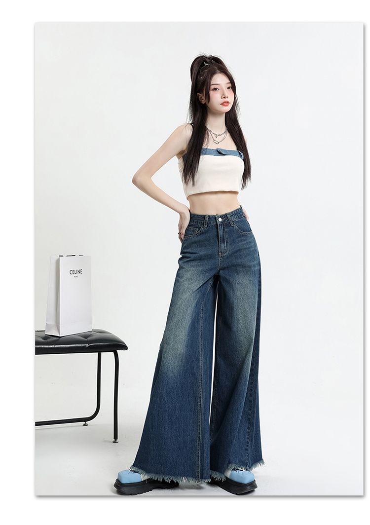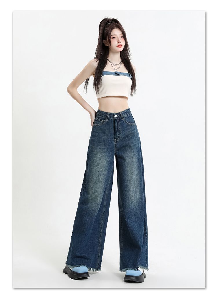 실사 Gypsophila 플래시 훈련 봄 새로운 하이웨이스트 아메리칸 좁은 에디션 스트레이트 넓은 다리 청바지 여성 루즈핏 바닥 청소 바지