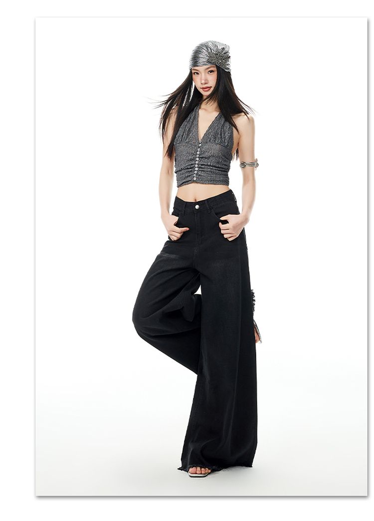 실사 2026 봄 드레스 뜨거운 판매 새로운 여성 의류 핫걸 바람 잡아라. 꽃 공예 와이드 레그 팬츠 찢어진 부분 청바지 여성 트렌디