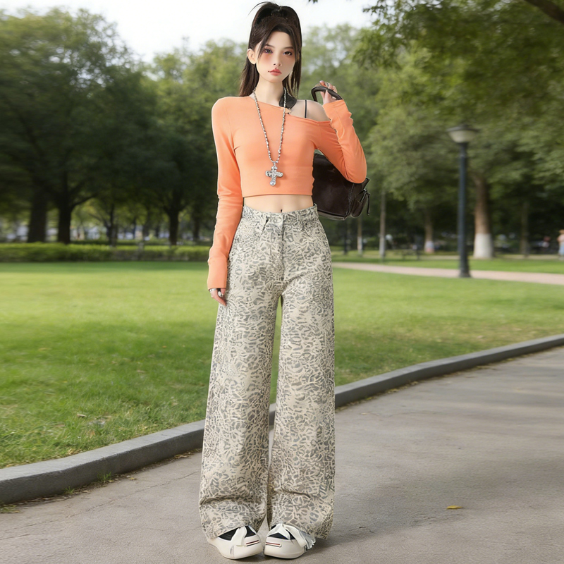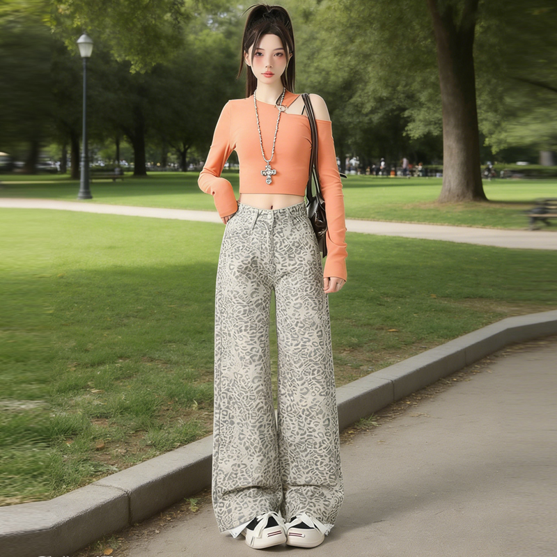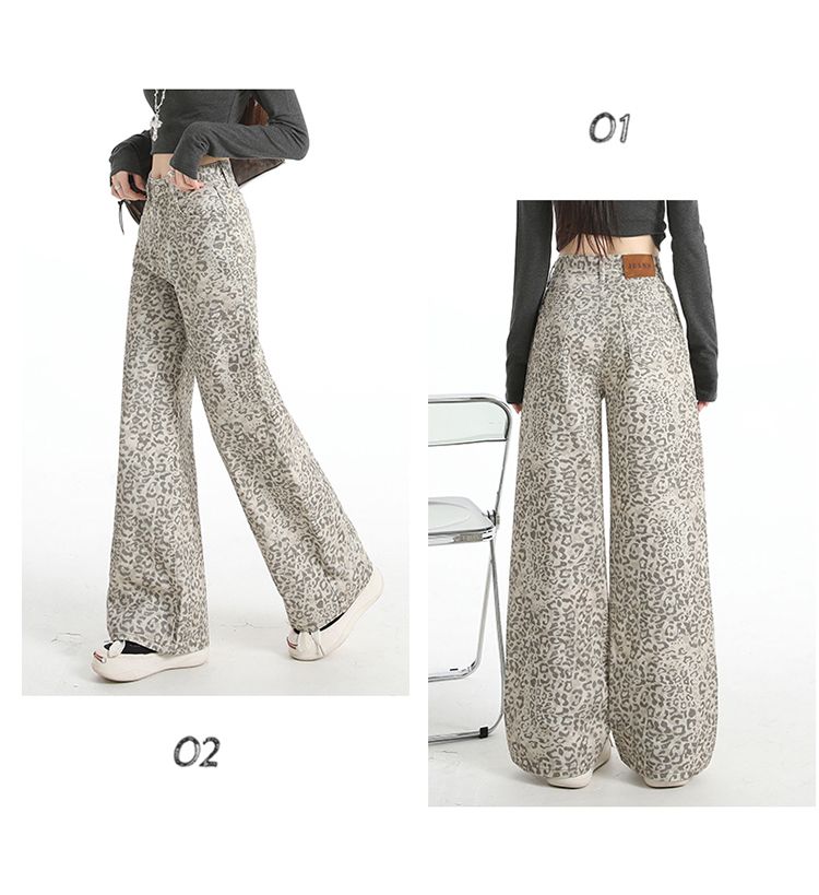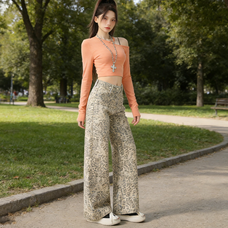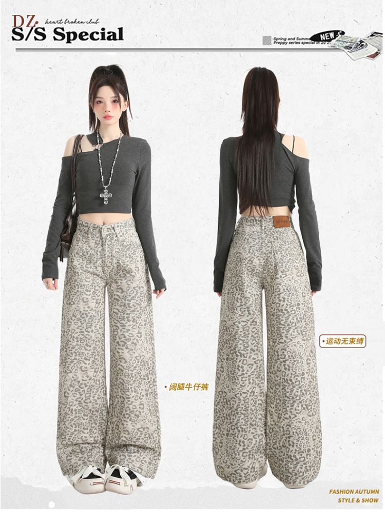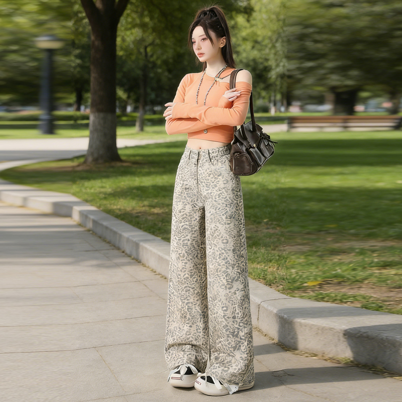 실사 2026 아메리칸 새로운 레트로 레오파드 무늬 청바지 여성 디자인 센스 높음 거리 도루 센스 스트레이트 바지 트렌디