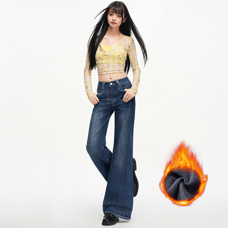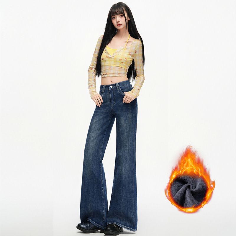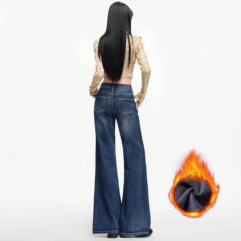 실사 2026 새로운 하이웨이스트 털이 있는 부츠컷 청바지 여성 루즈핏 아니요 막대기 다리 레트로 노스탤지어 나팔 바닥 청소 바지