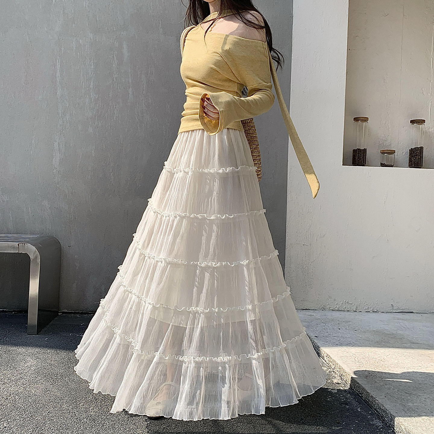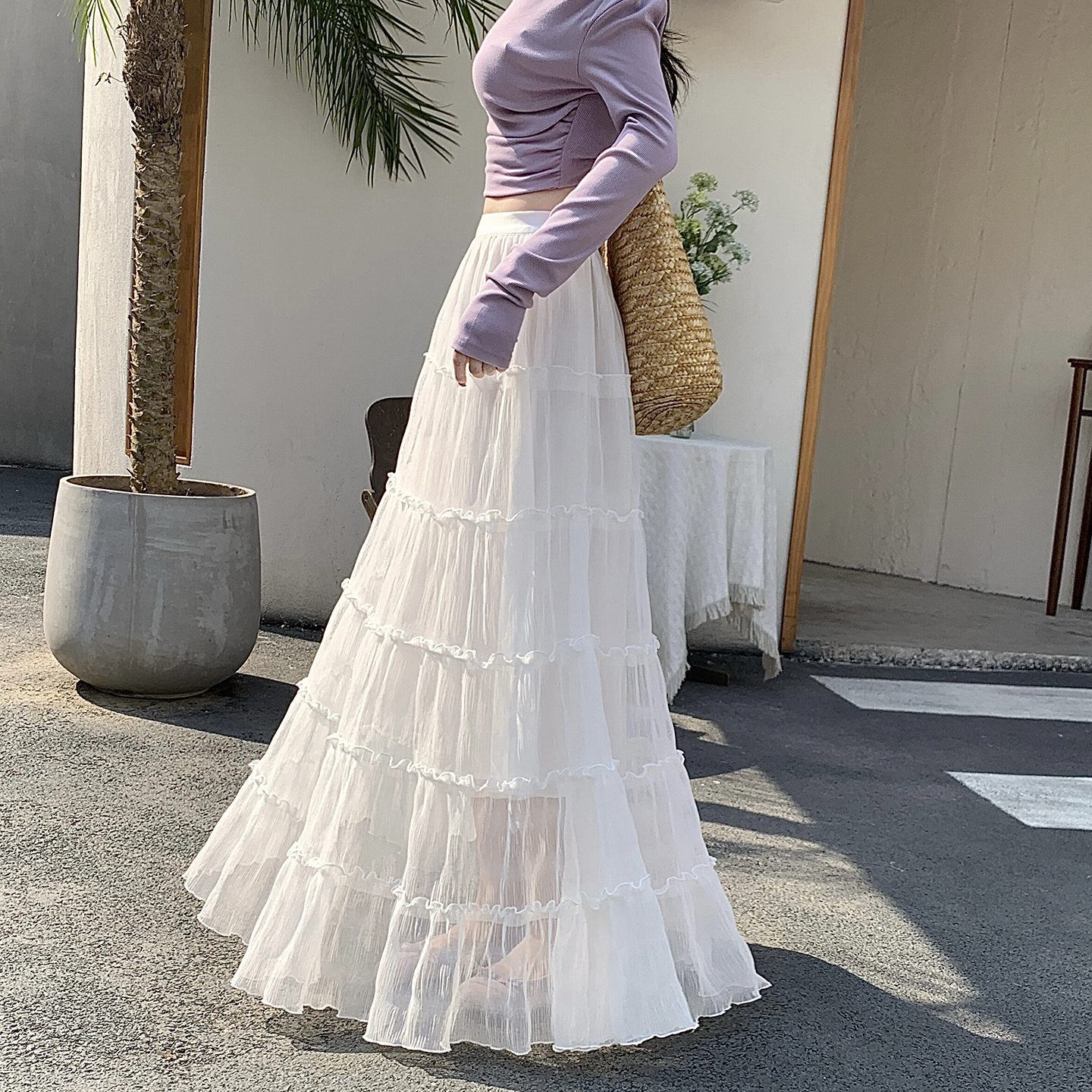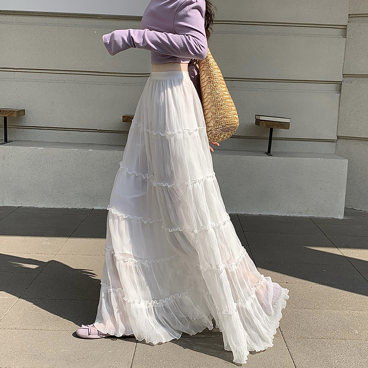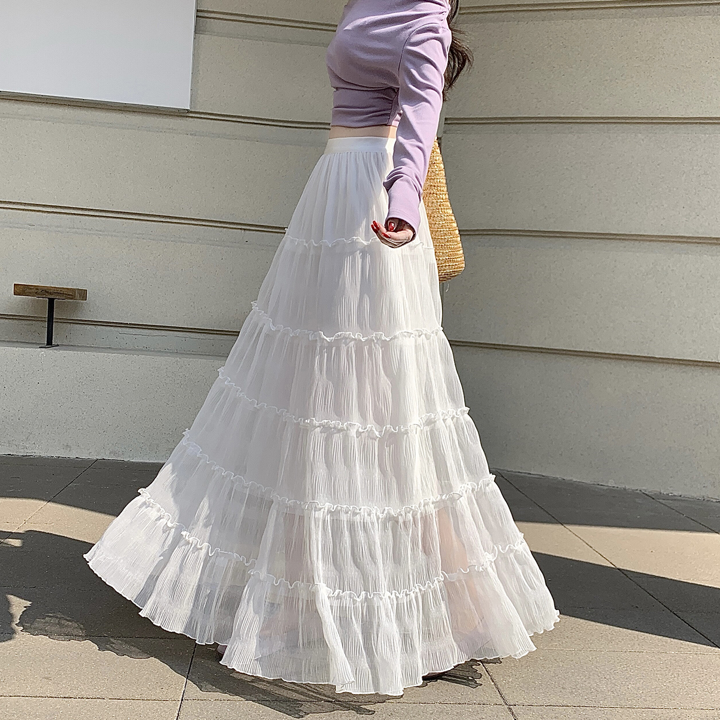 한 부서 프릴 주름 달콤함 반신 스커트 휴가 사진 찍기 롱 스커트 분위기 센스 봄 여름 부서 치마