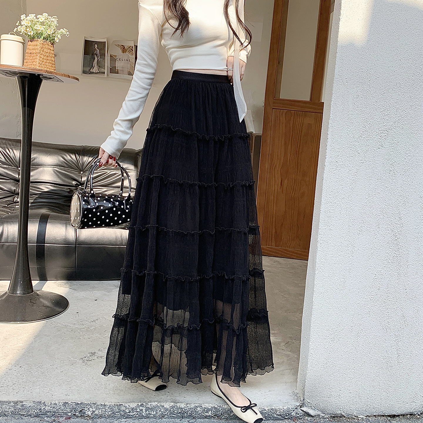 프랑스식 고급 센스 검정색 도트 무늬 롱 스커트 여성 2026 봄 여름 새로운 품격 디스플레이 높음 슬림해 보이는 미니멀리즘 바람 반신 스커트
