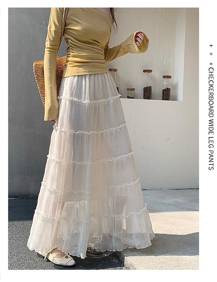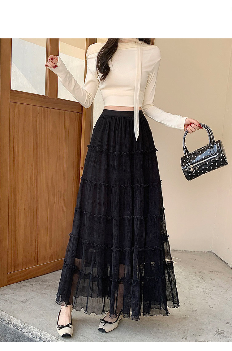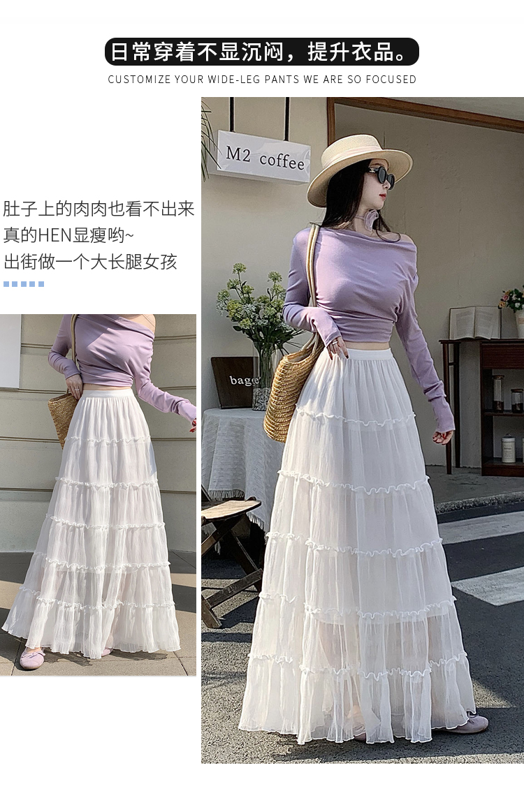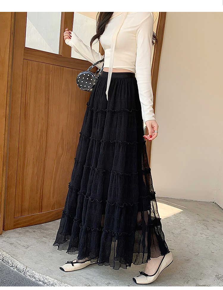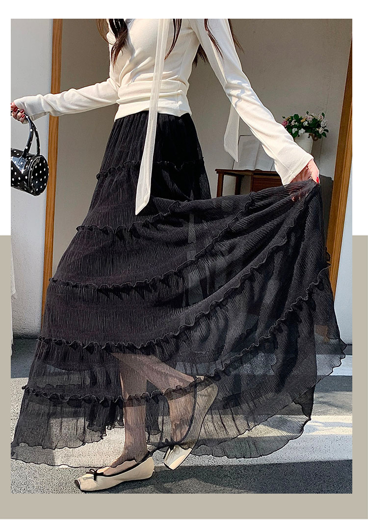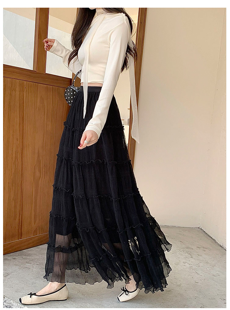 슈퍼 요정 망사 한 마디 플리츠 롱 스커트 여성 2026 봄 여름 새로운 휴가 바람 슬림해 보이는 표지 십자가 단색 반신 스커트