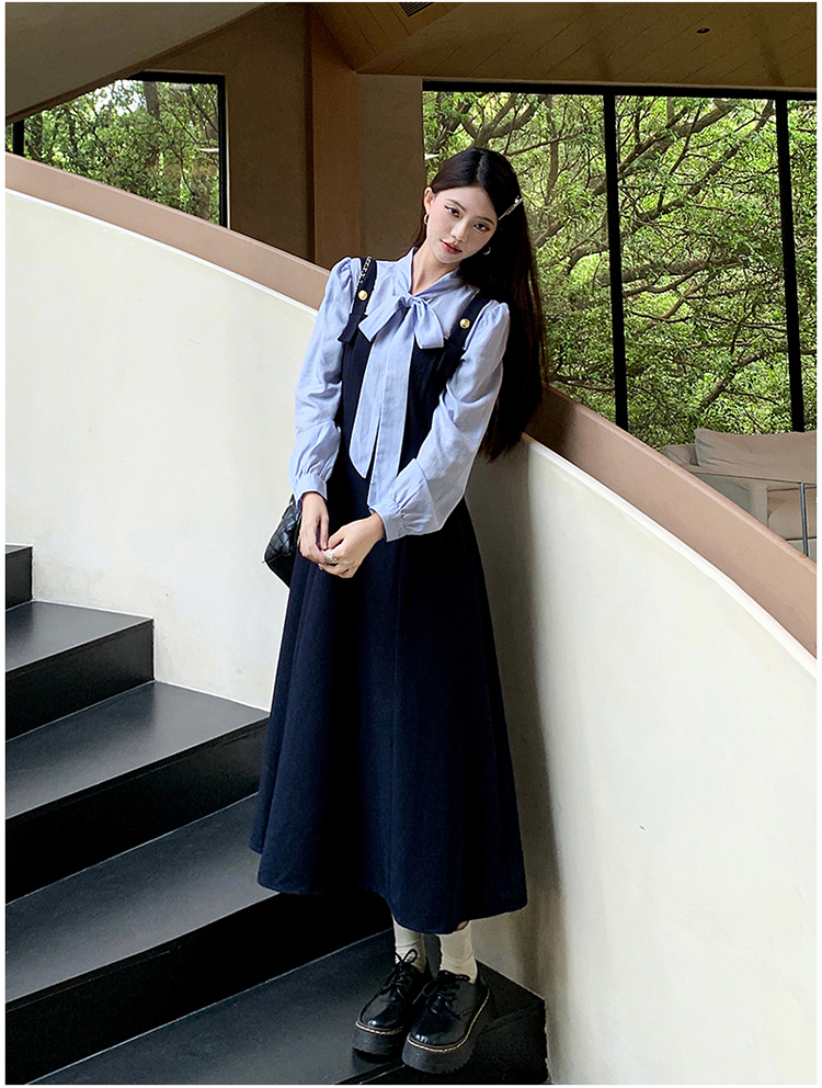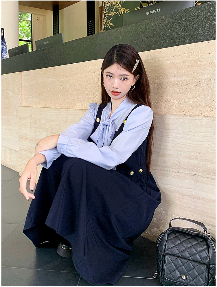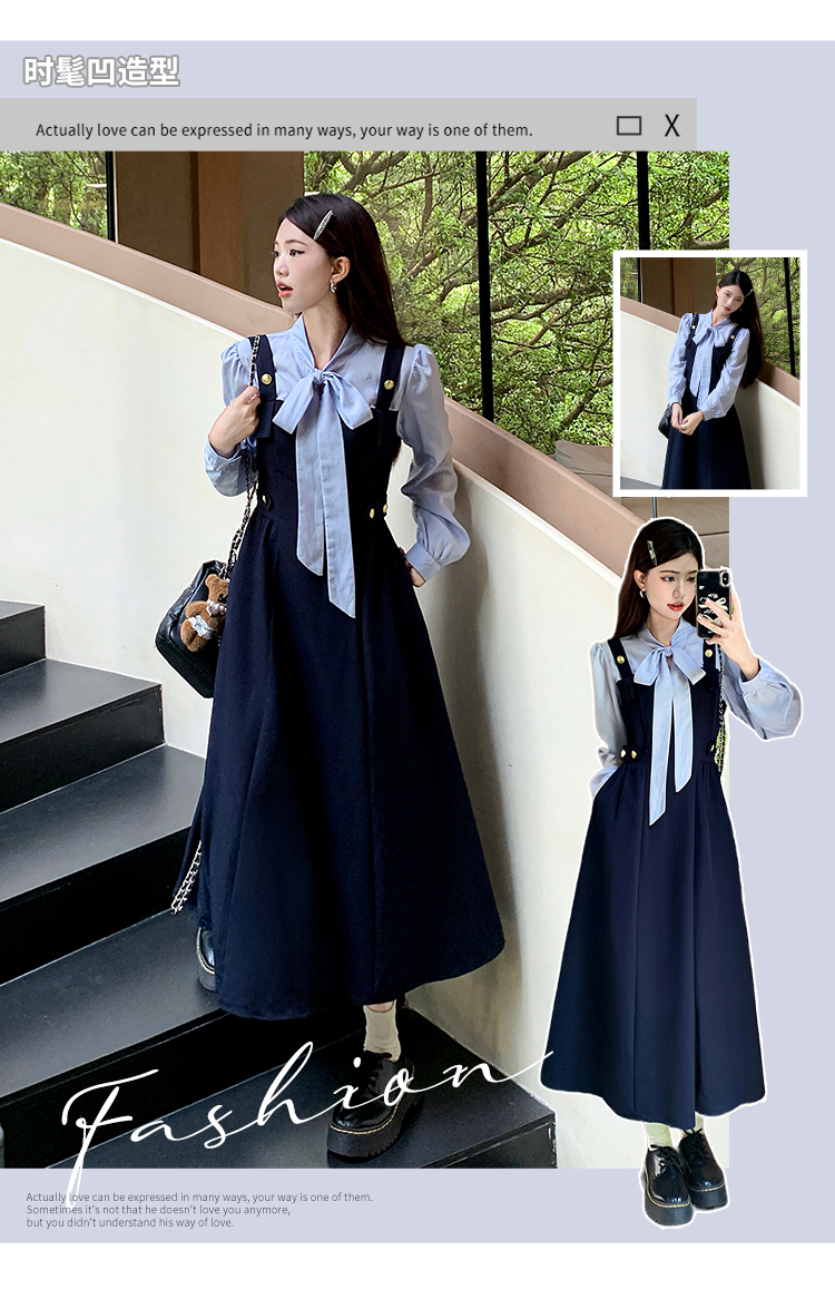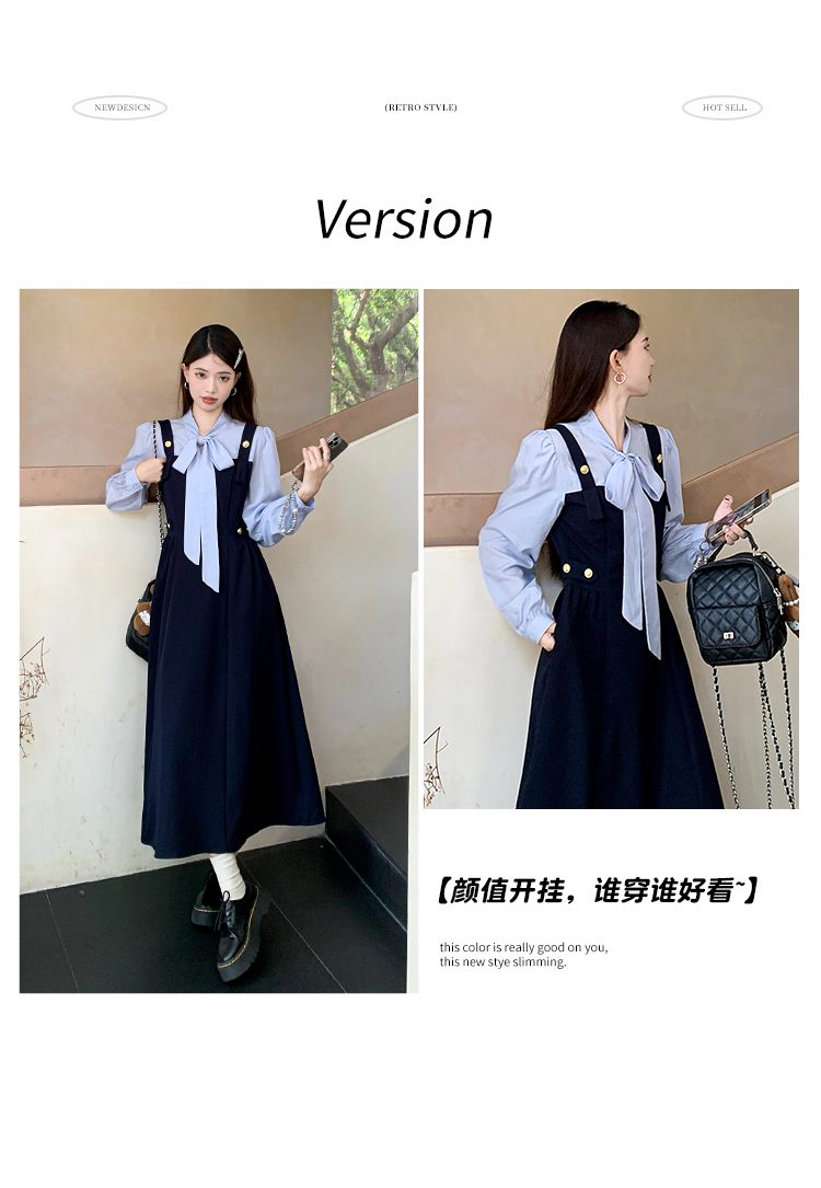 실사 빅 사이즈 여성 의류 2026 봄 아모이 중식 점프 슈트 치마 세트 헤일로 염색 길다 치마 V넥 나팔 긴팔