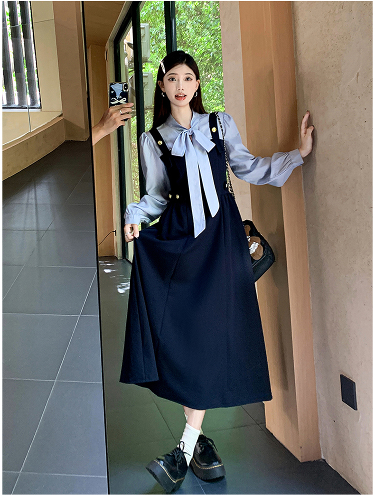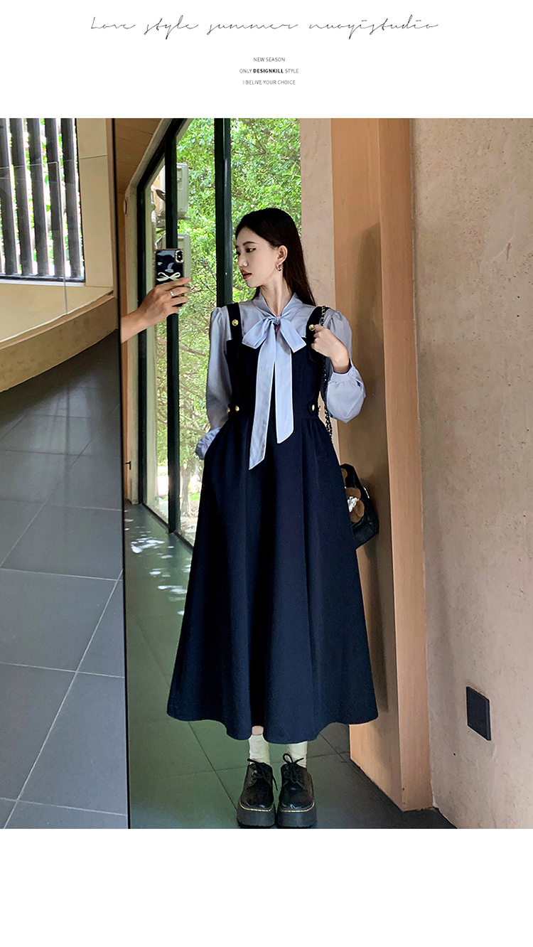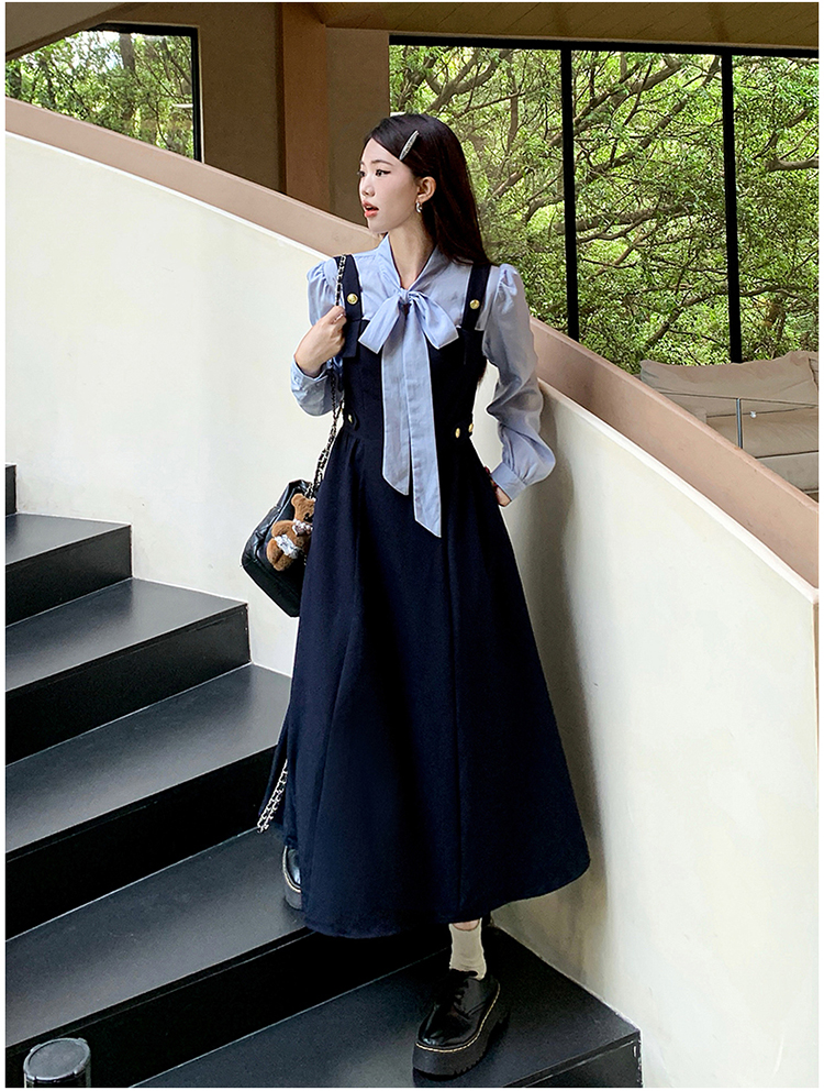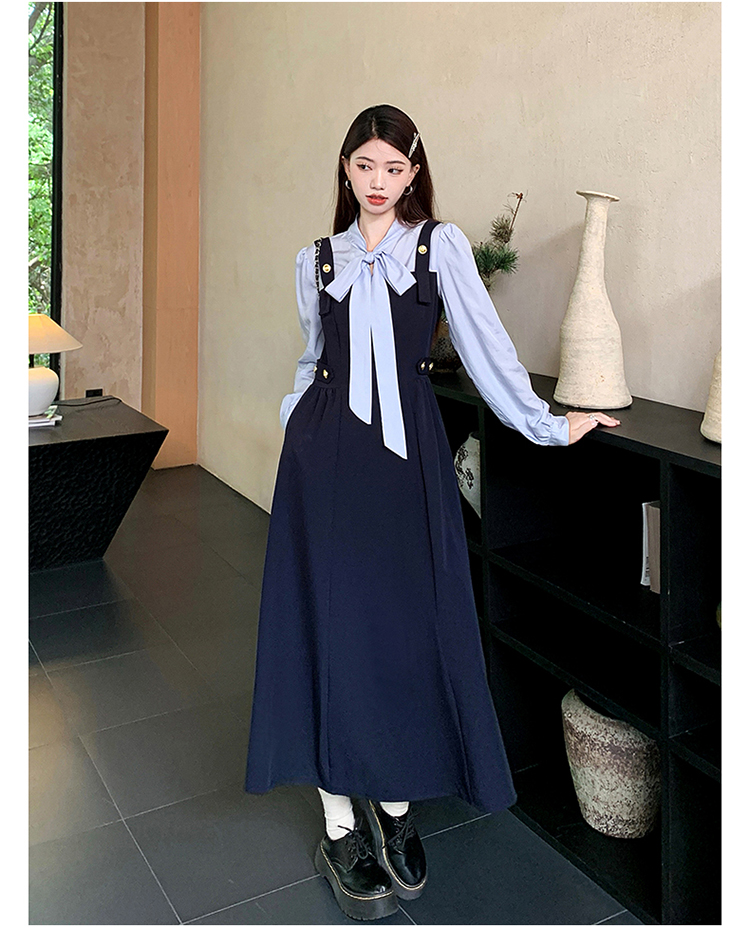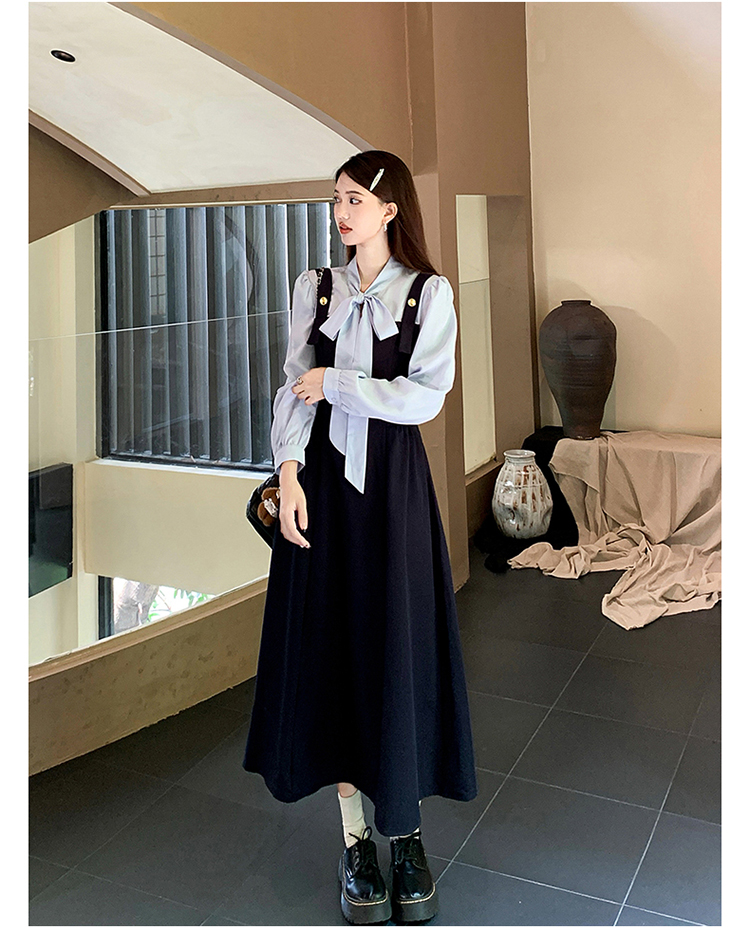 실사 가을 프랑스식 고급 센스 V넥 긴팔 드레스 2026 이른 봄 새로운 아름다운 치마 허리 수축 롱 스커트