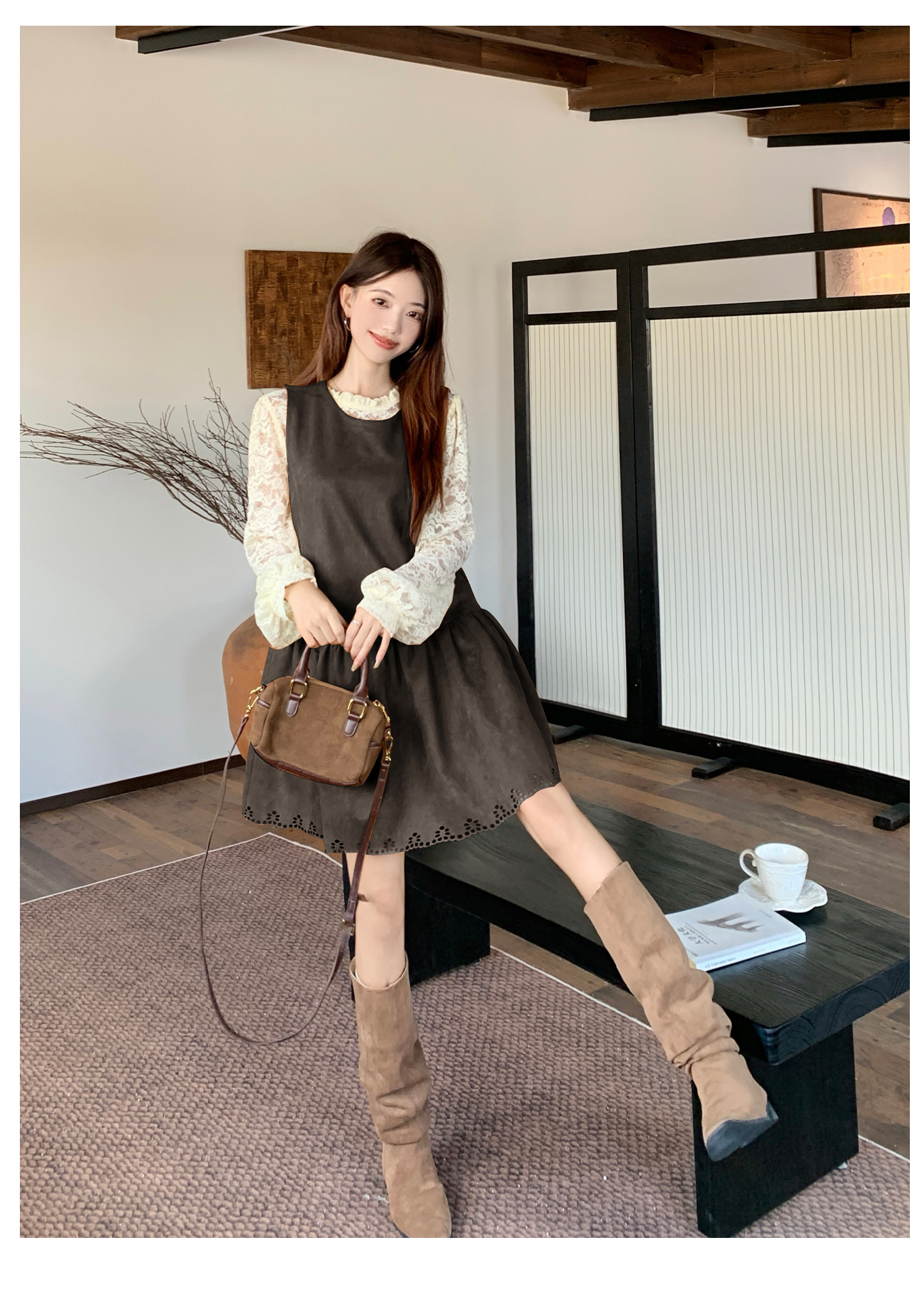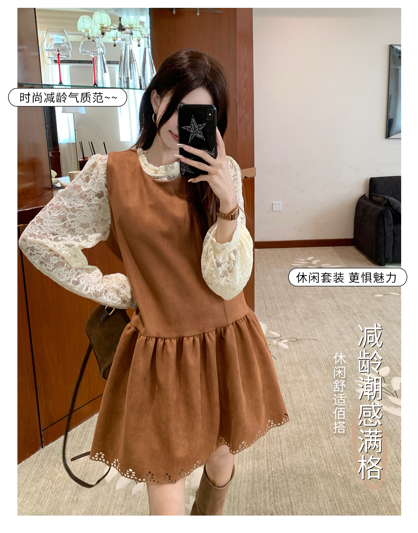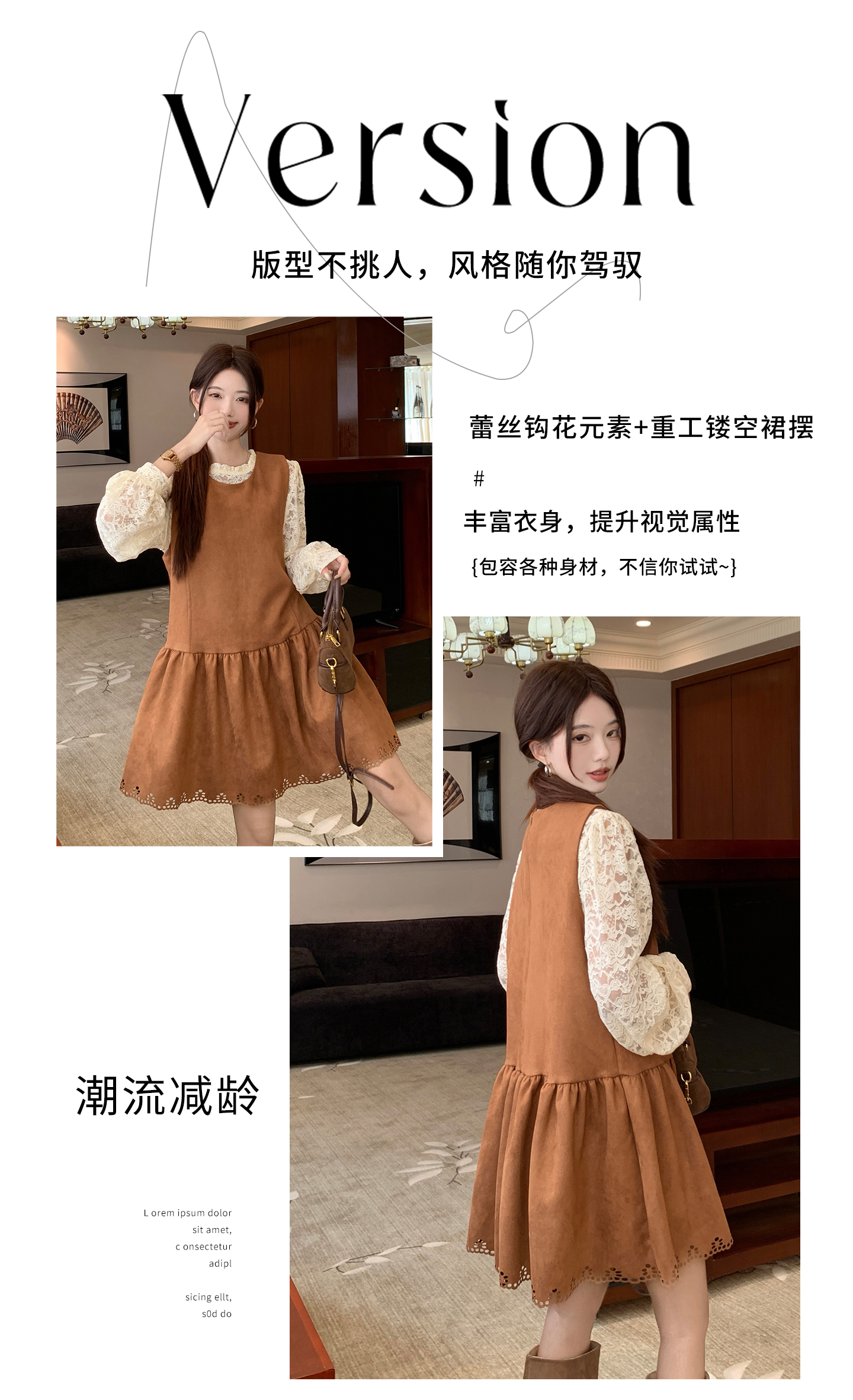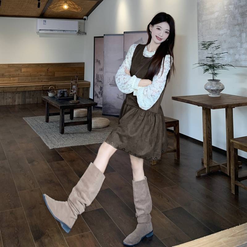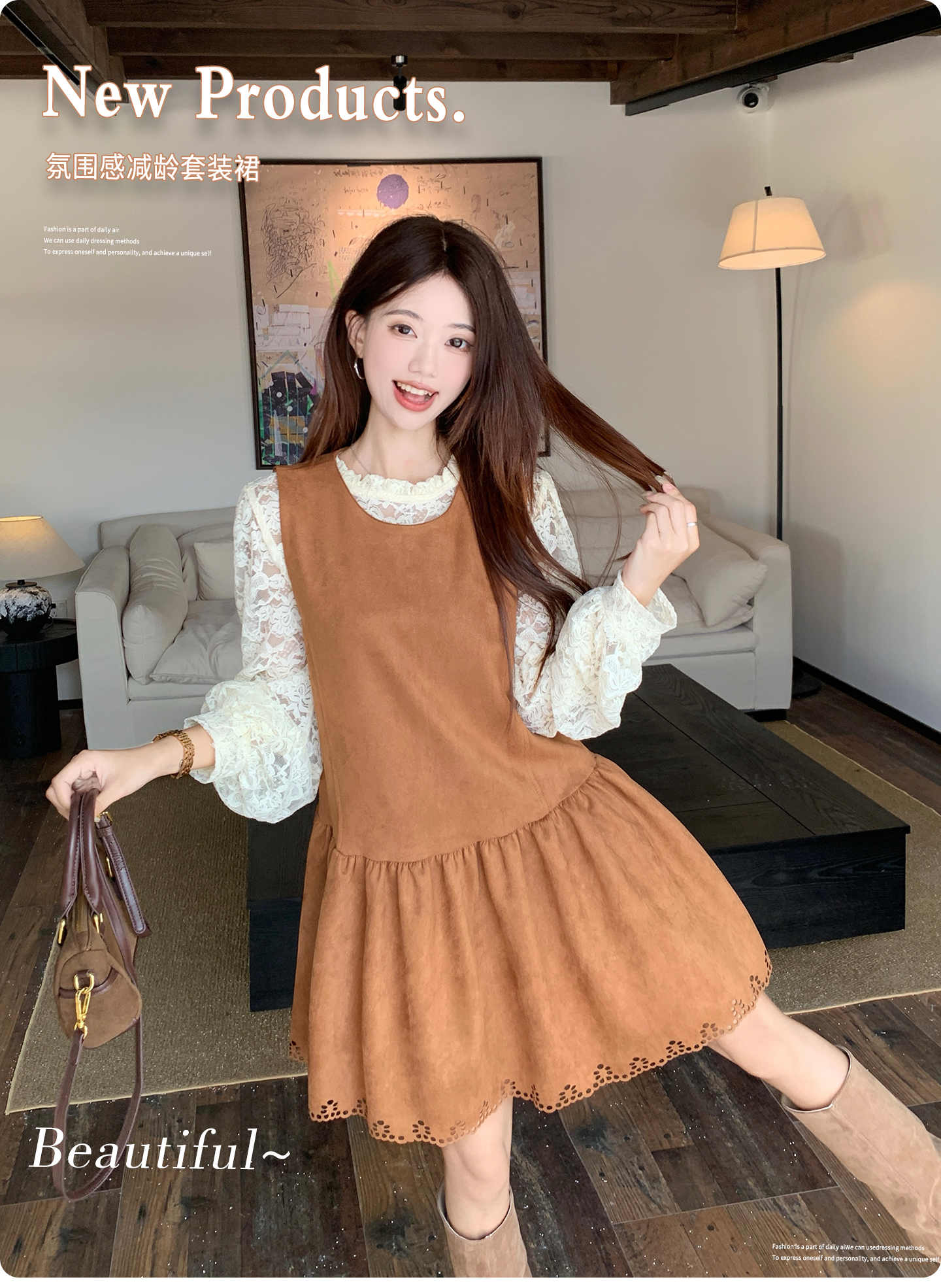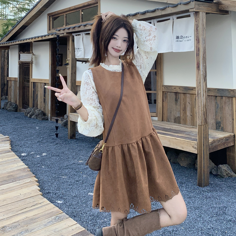 실사 작은 키 레이스 바지를 입는 셔츠 맨위 투피스 드레스 새로운 빅 사이즈 스웨이드 원단 조끼 스커트