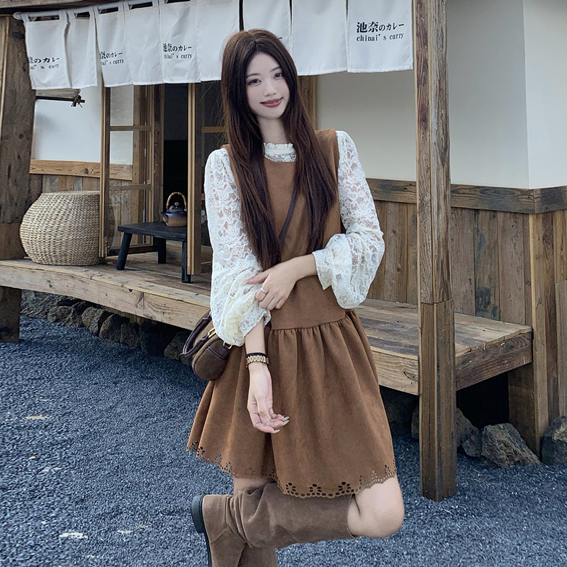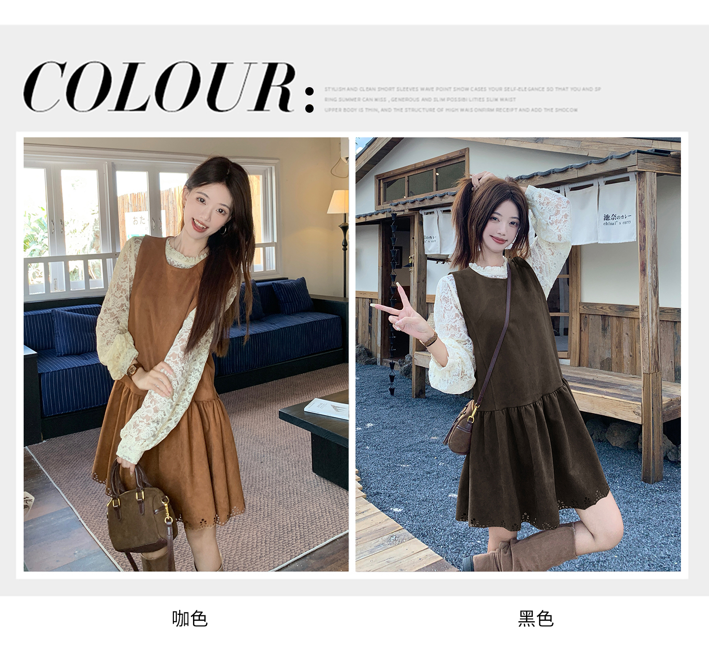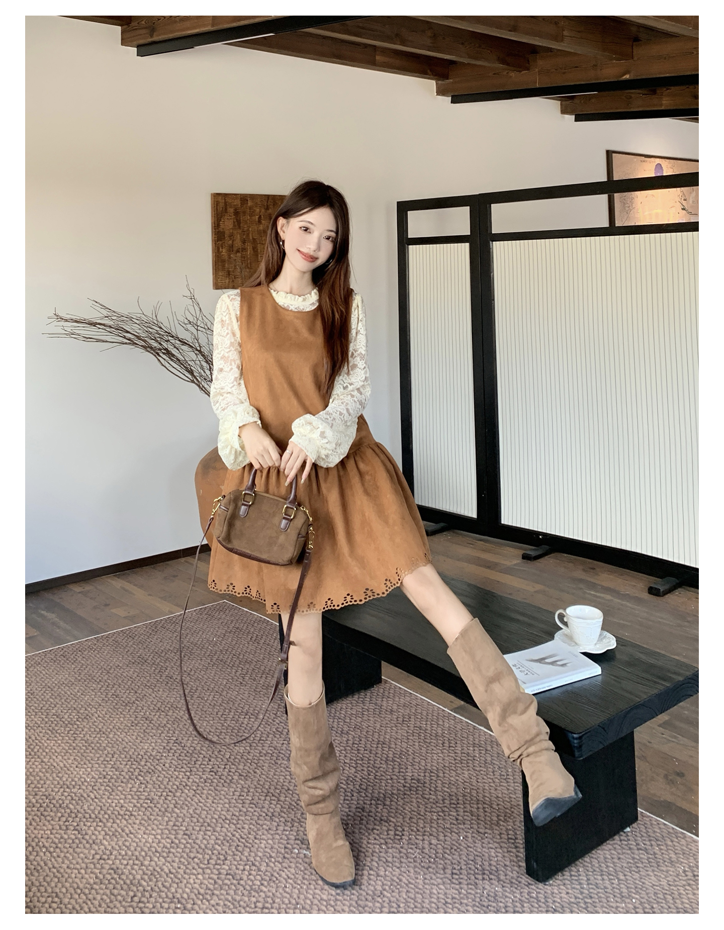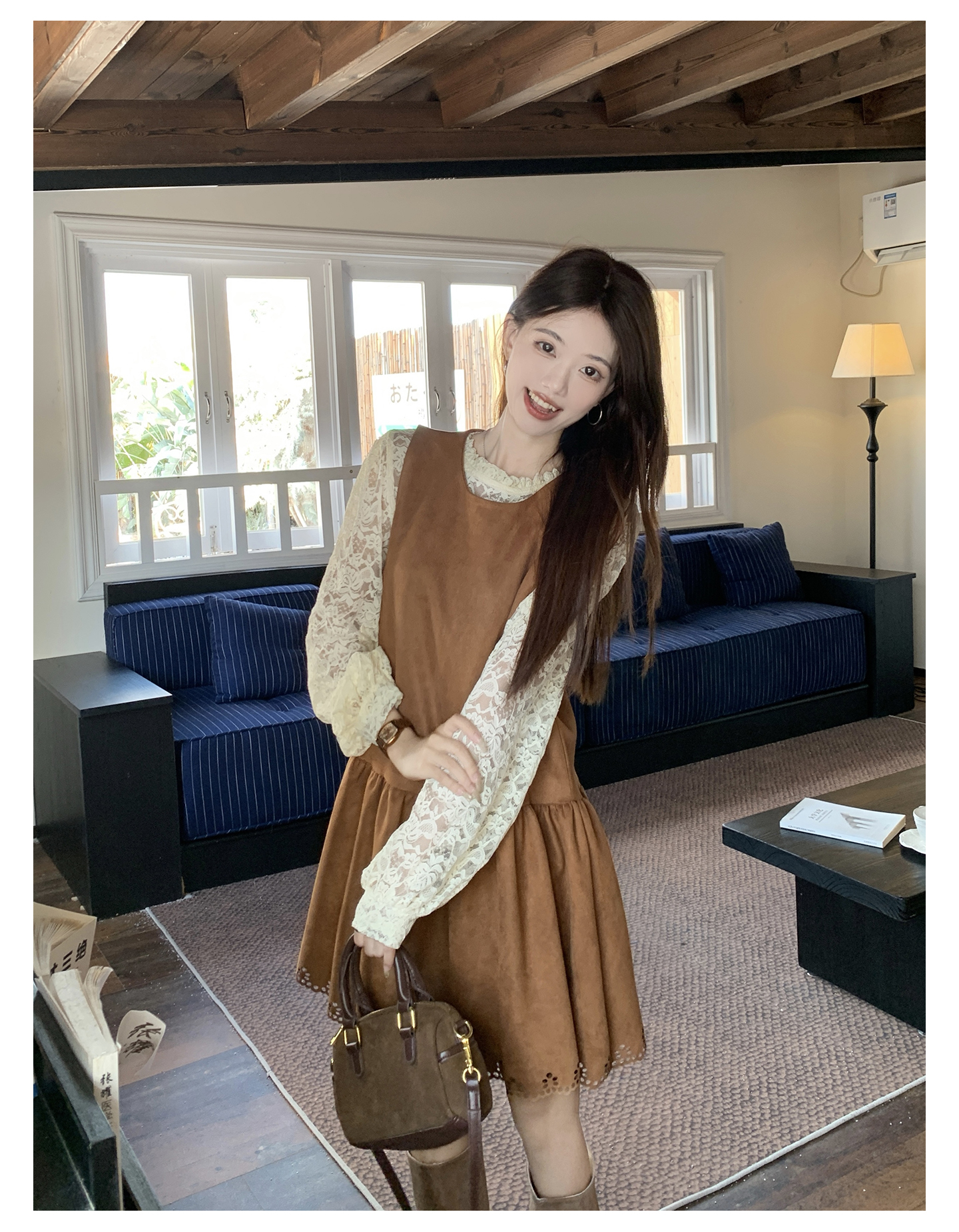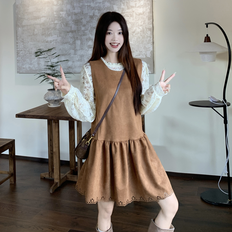 실사 작은 키 레이스 바지를 입는 셔츠 맨위 투피스 드레스 새로운 빅 사이즈 스웨이드 원단 조끼 스커트