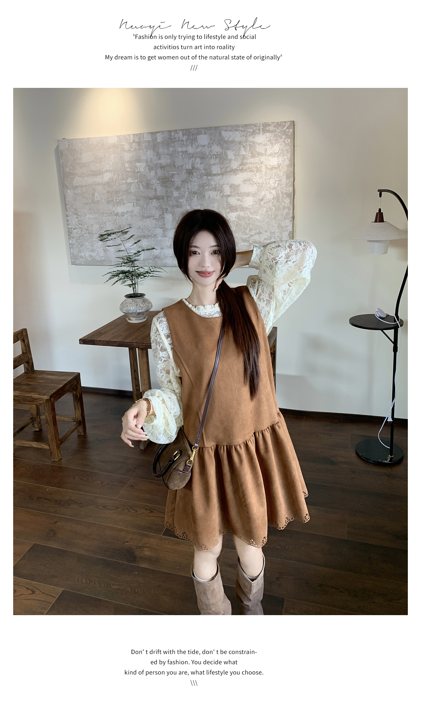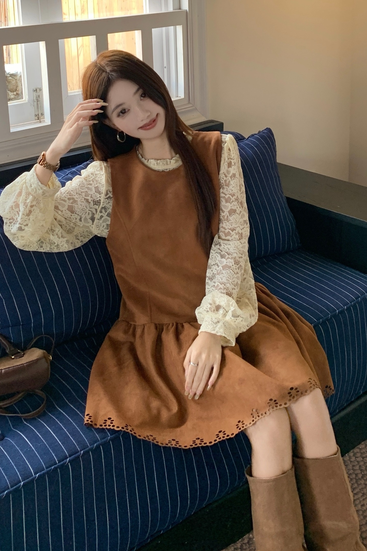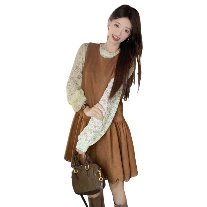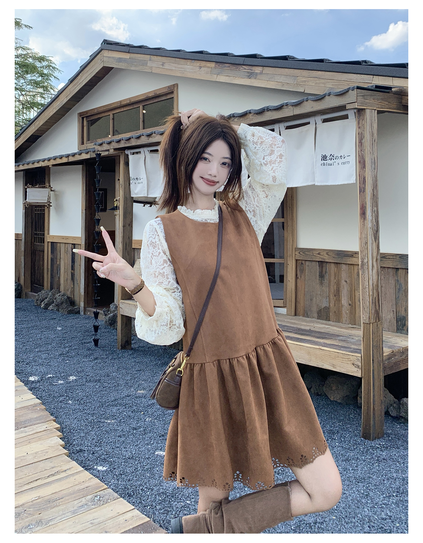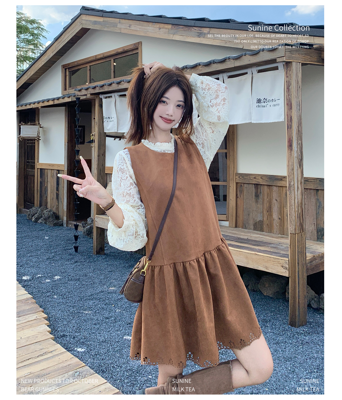 실사 작은 키 레이스 바지를 입는 셔츠 맨위 투피스 드레스 새로운 빅 사이즈 스웨이드 원단 조끼 스커트
