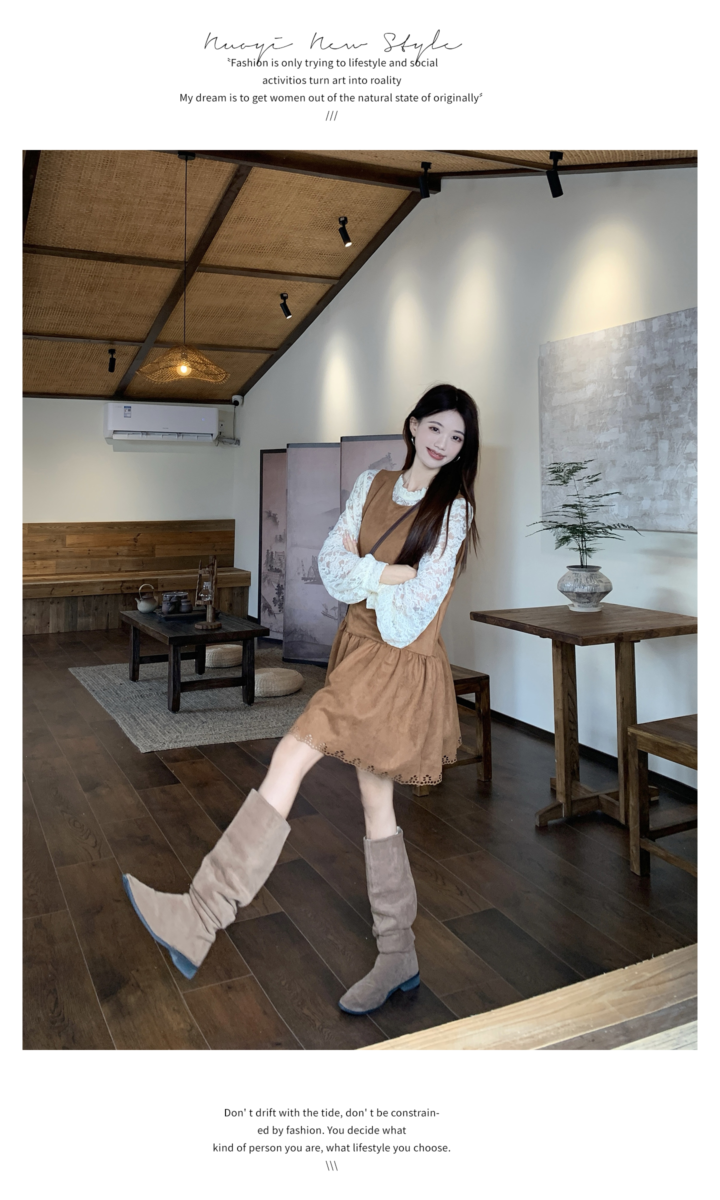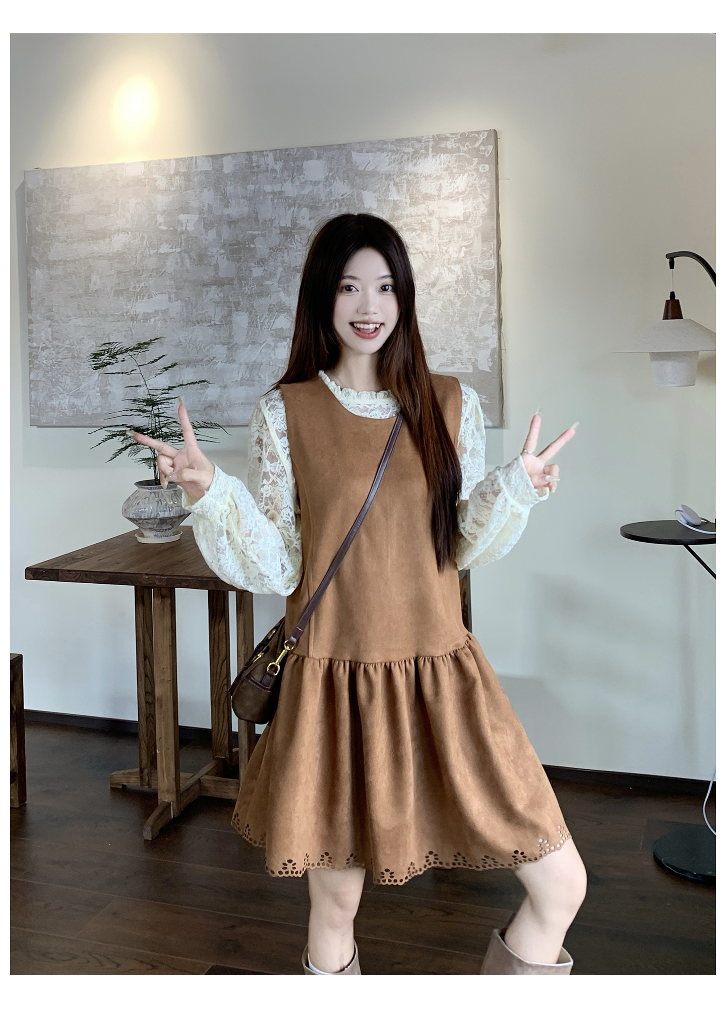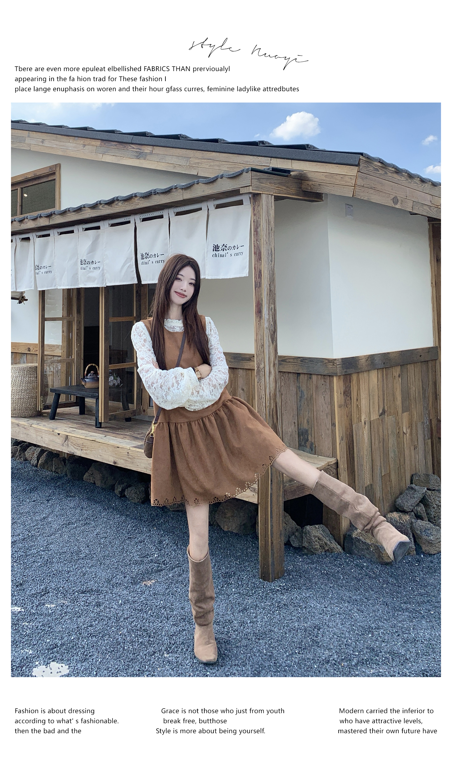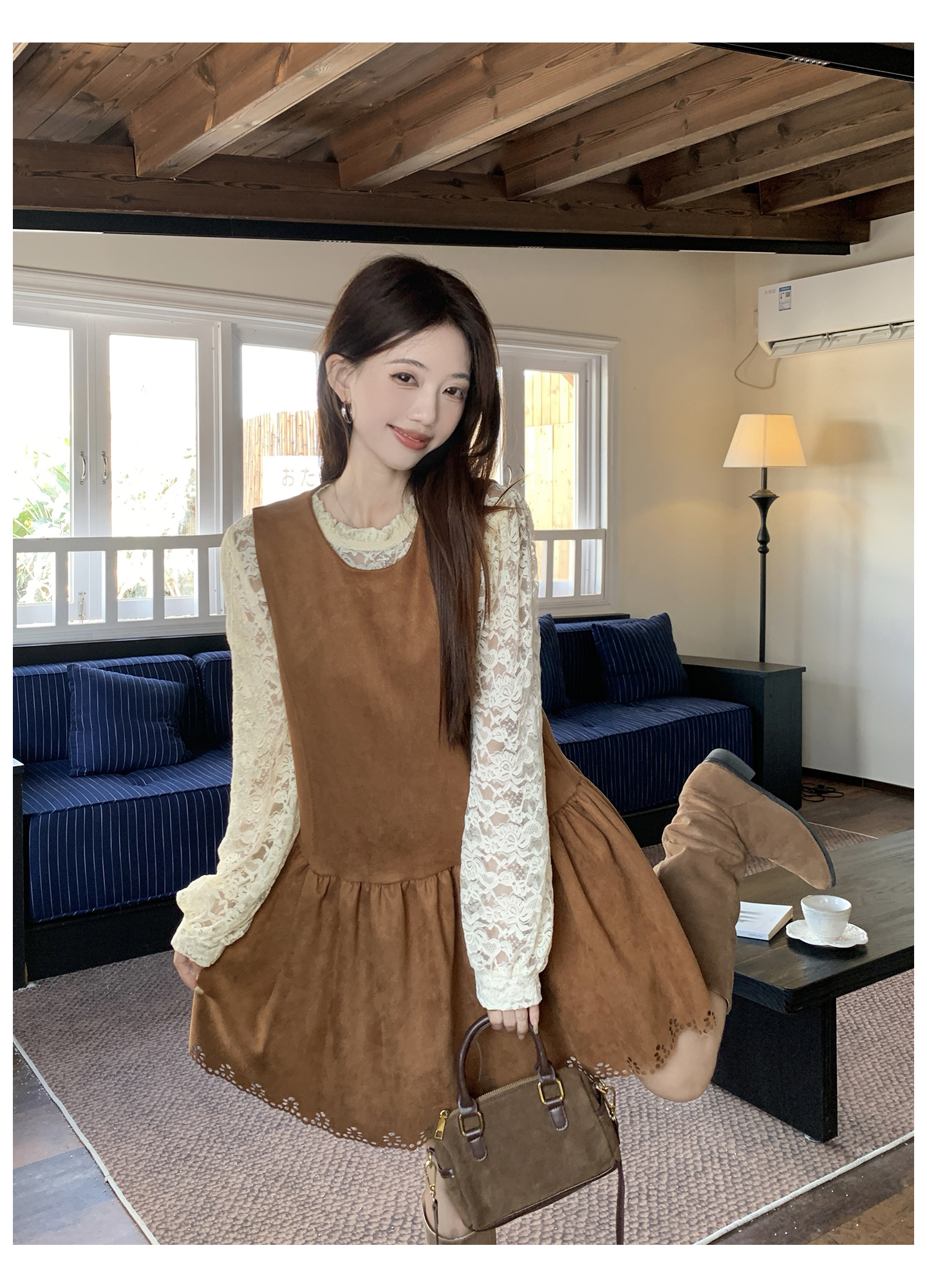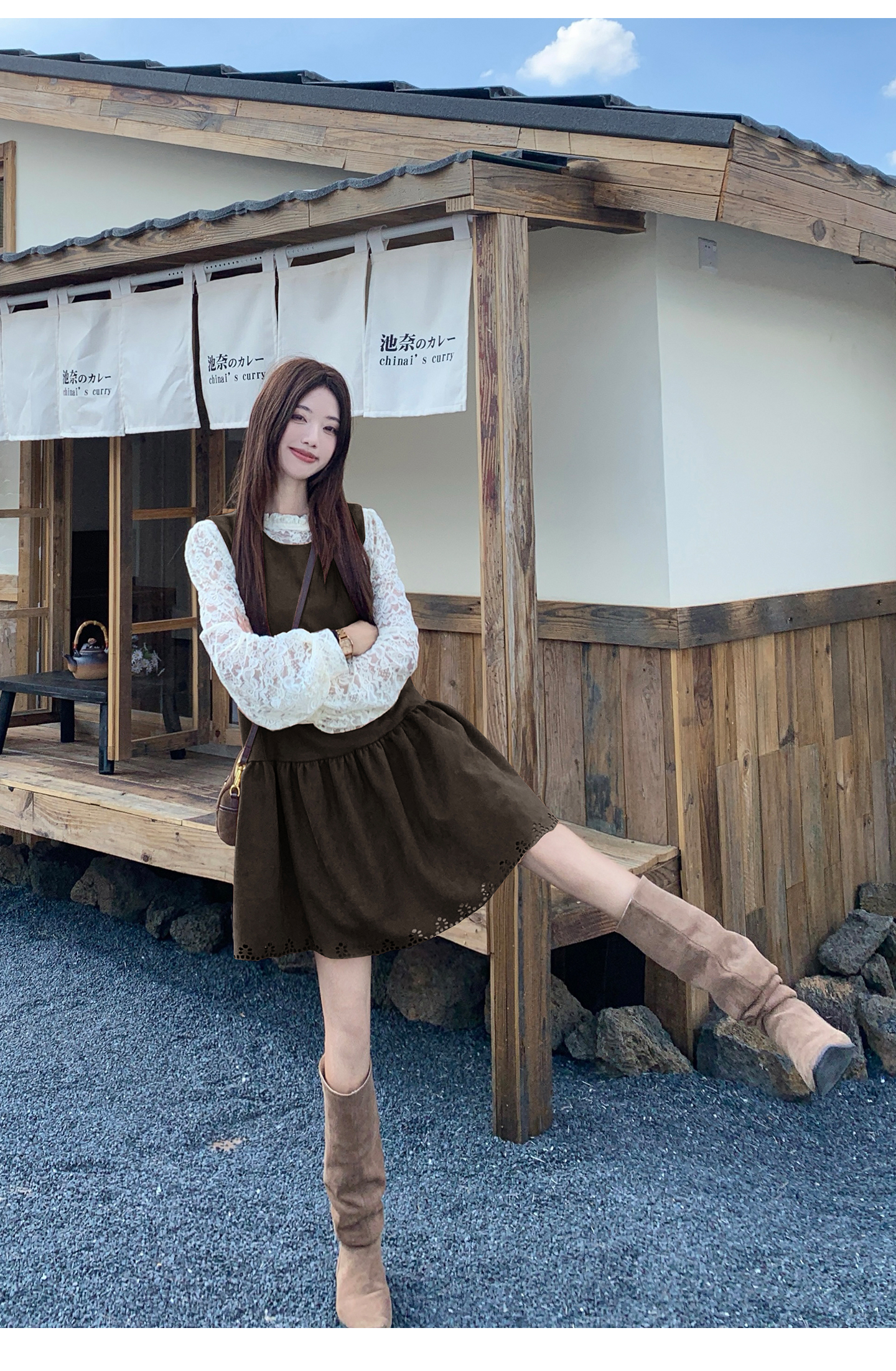 실사 작은 키 레이스 바지를 입는 셔츠 맨위 투피스 드레스 새로운 빅 사이즈 스웨이드 원단 조끼 스커트