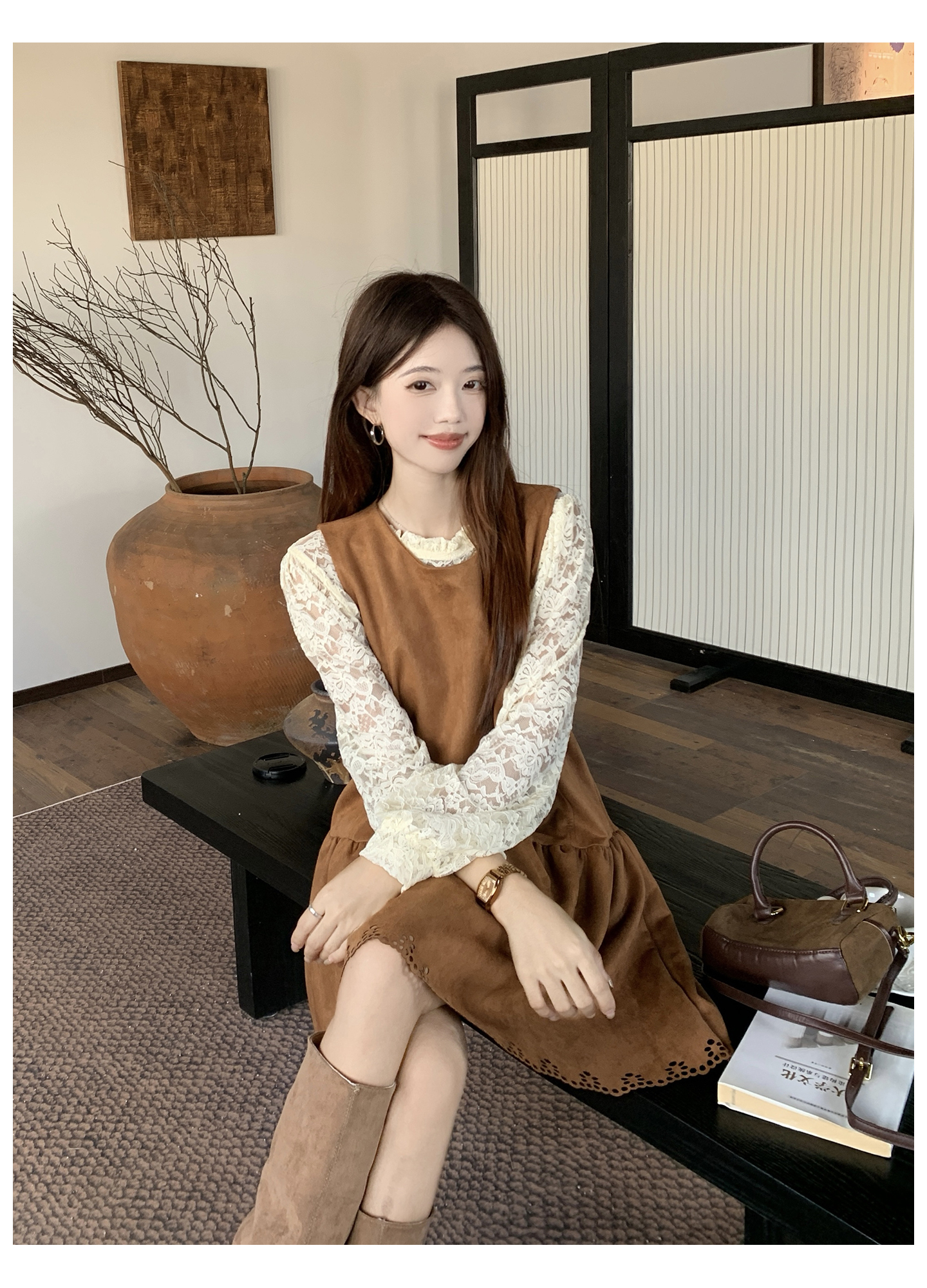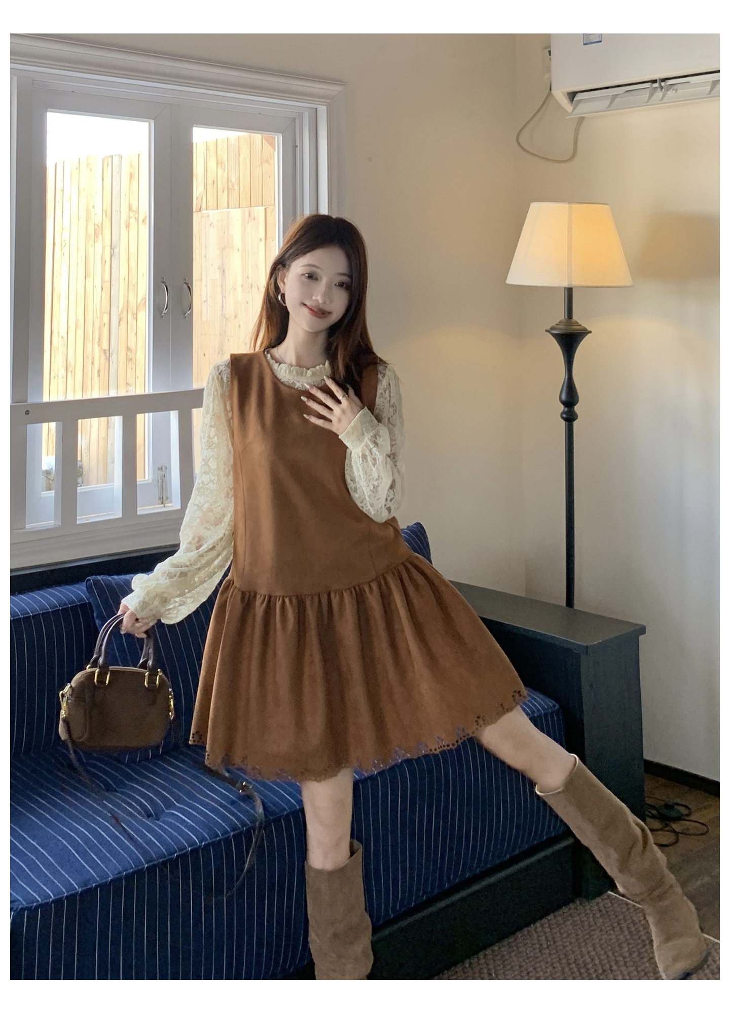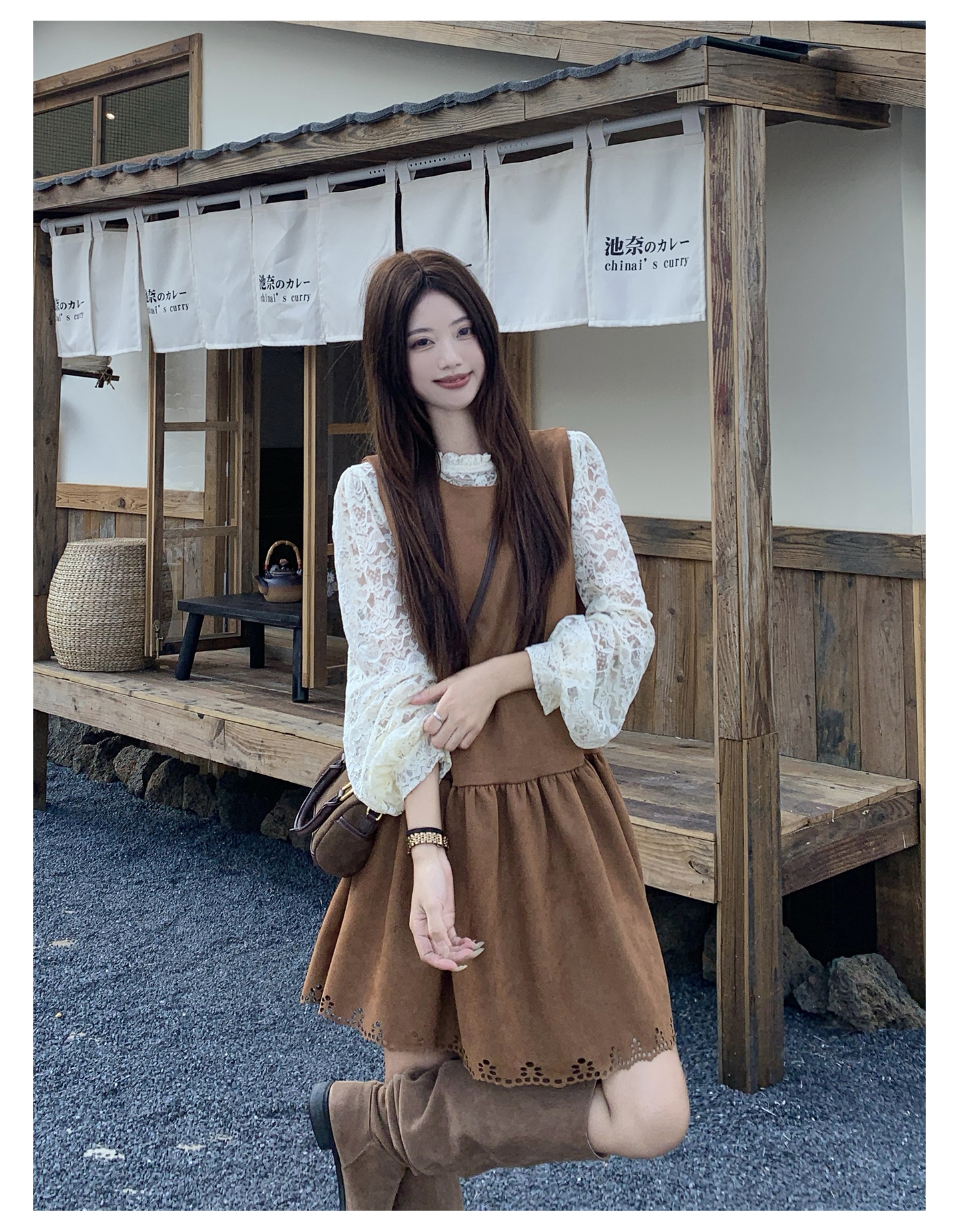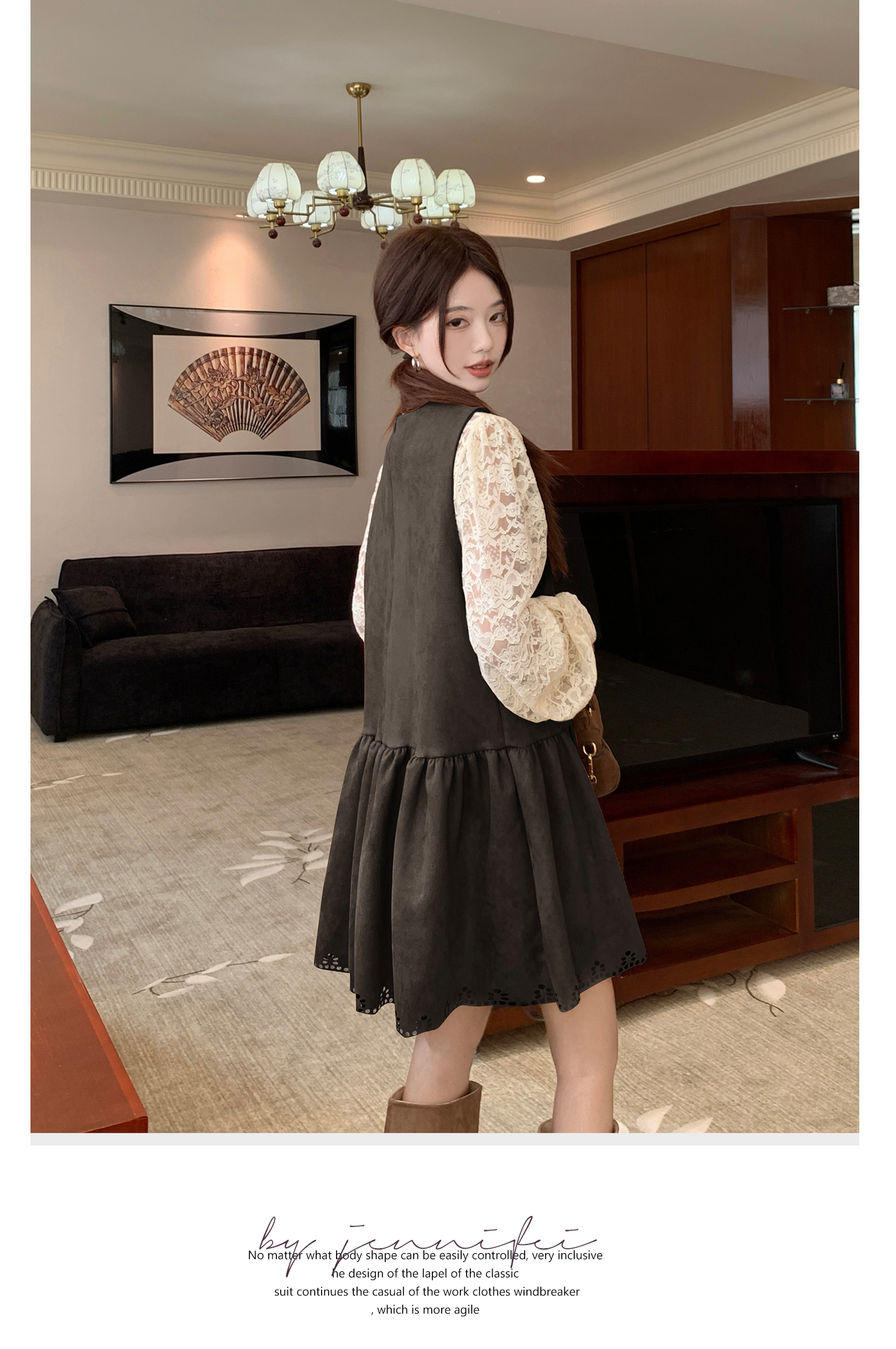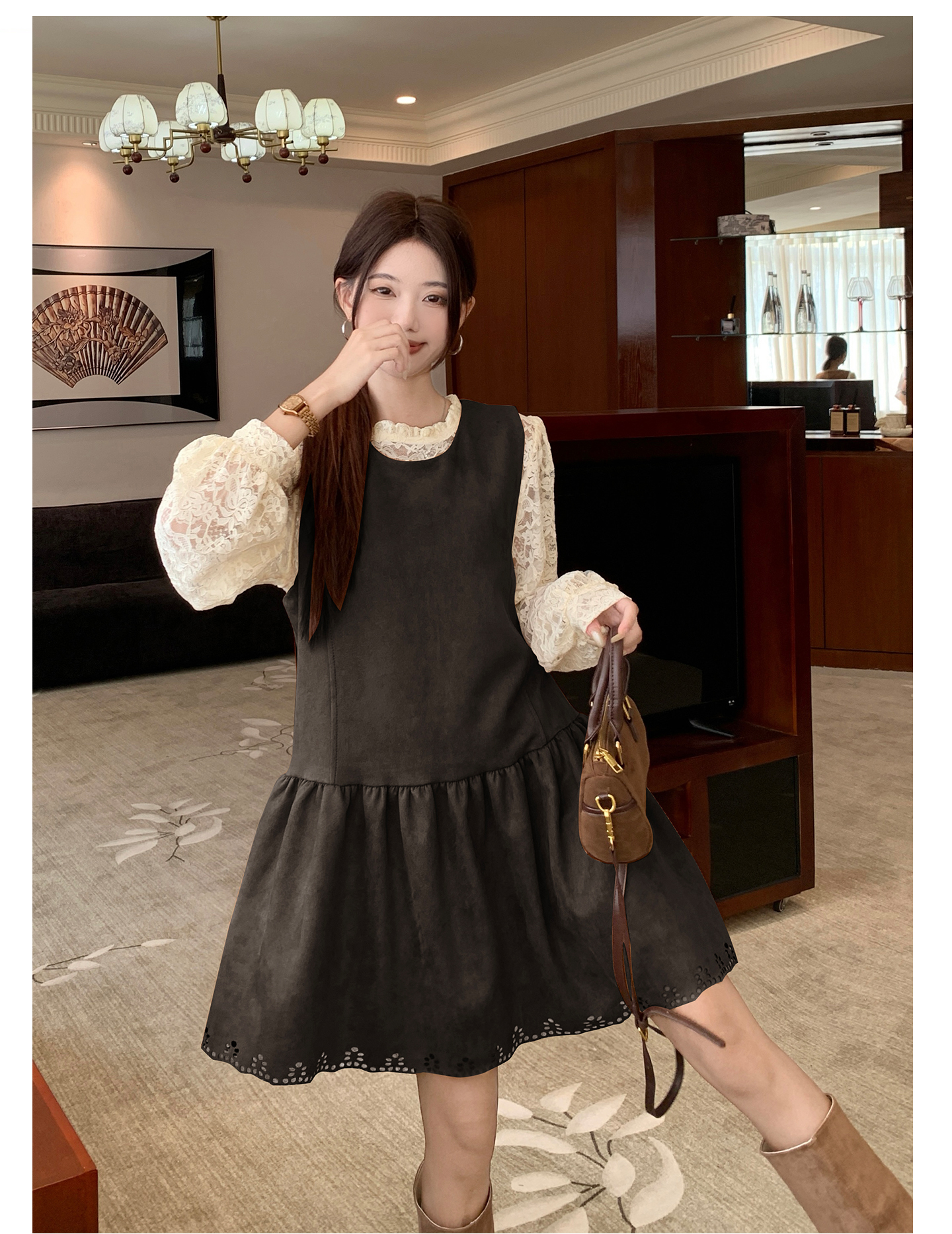 실사 작은 키 레이스 바지를 입는 셔츠 맨위 투피스 드레스 새로운 빅 사이즈 스웨이드 원단 조끼 스커트