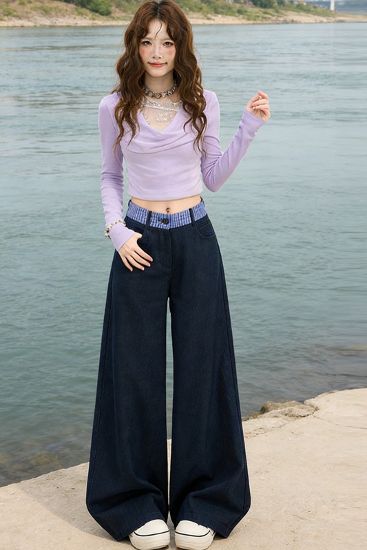 실사 2026 봄 새로운 하늘색 레트로 하이웨이스트 루즈핏 와이드 레그 팬츠 스트레이트 청바지 여성