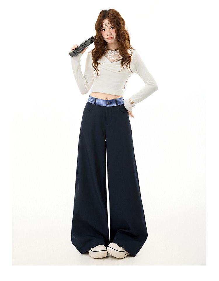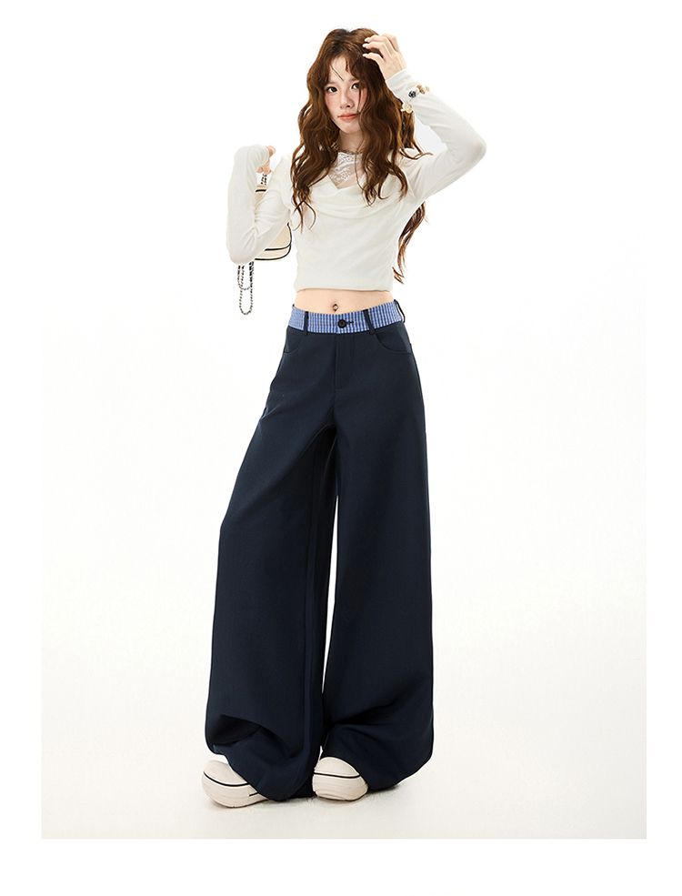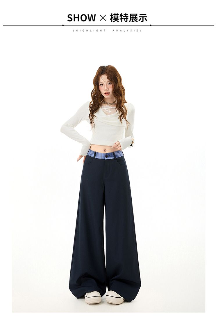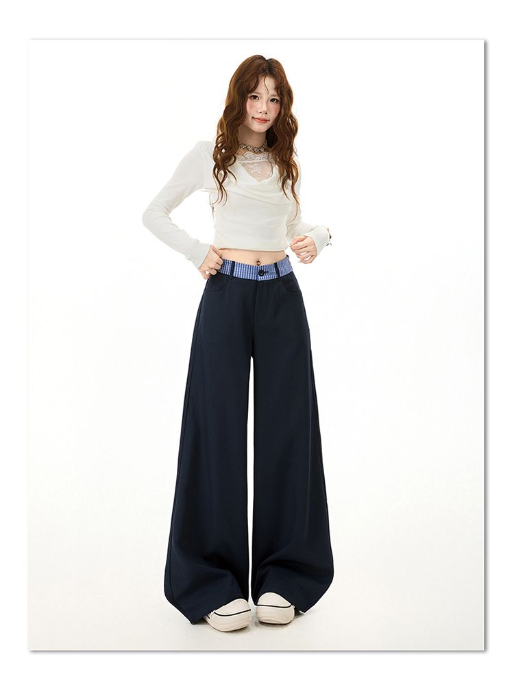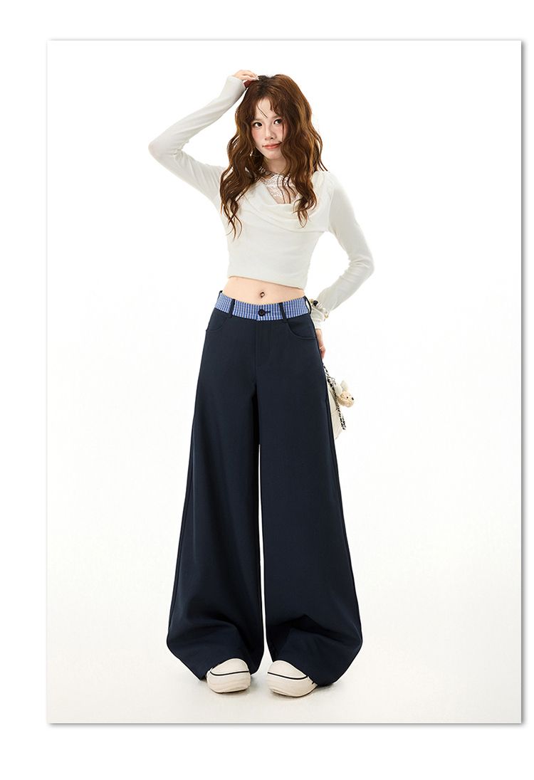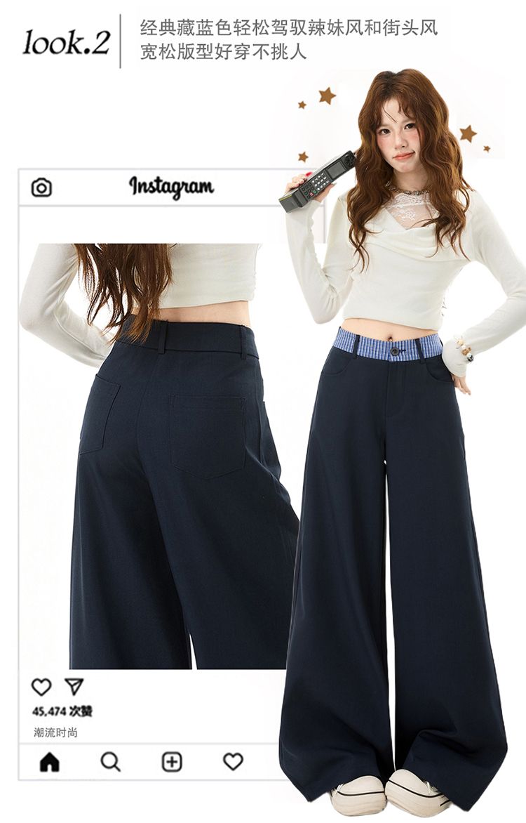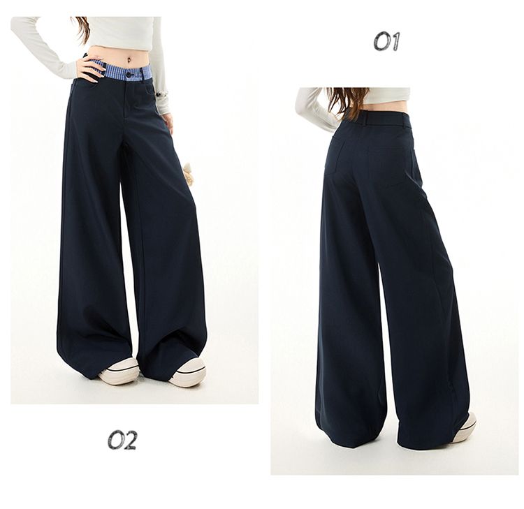 실사 2026 새로운 아메리칸 체크무늬 패치워크 해군 캐주얼 바지 여성 루즈핏 슬림해 보이는 하이웨이스트 넓은 다리 도루 센스 바지