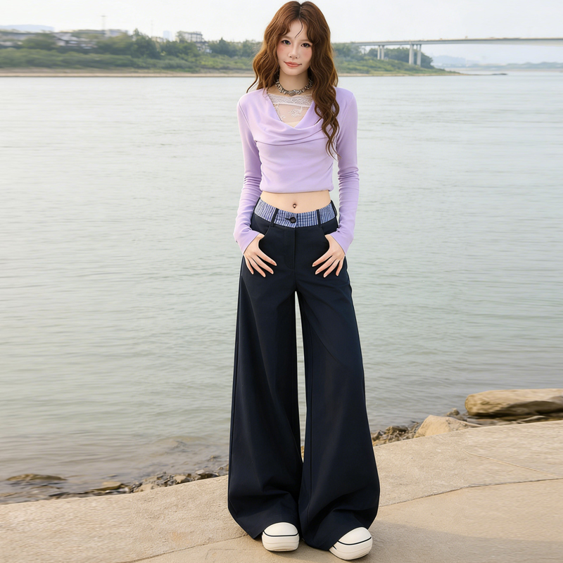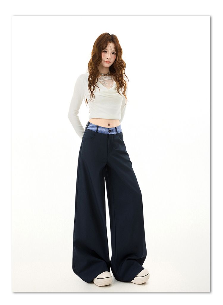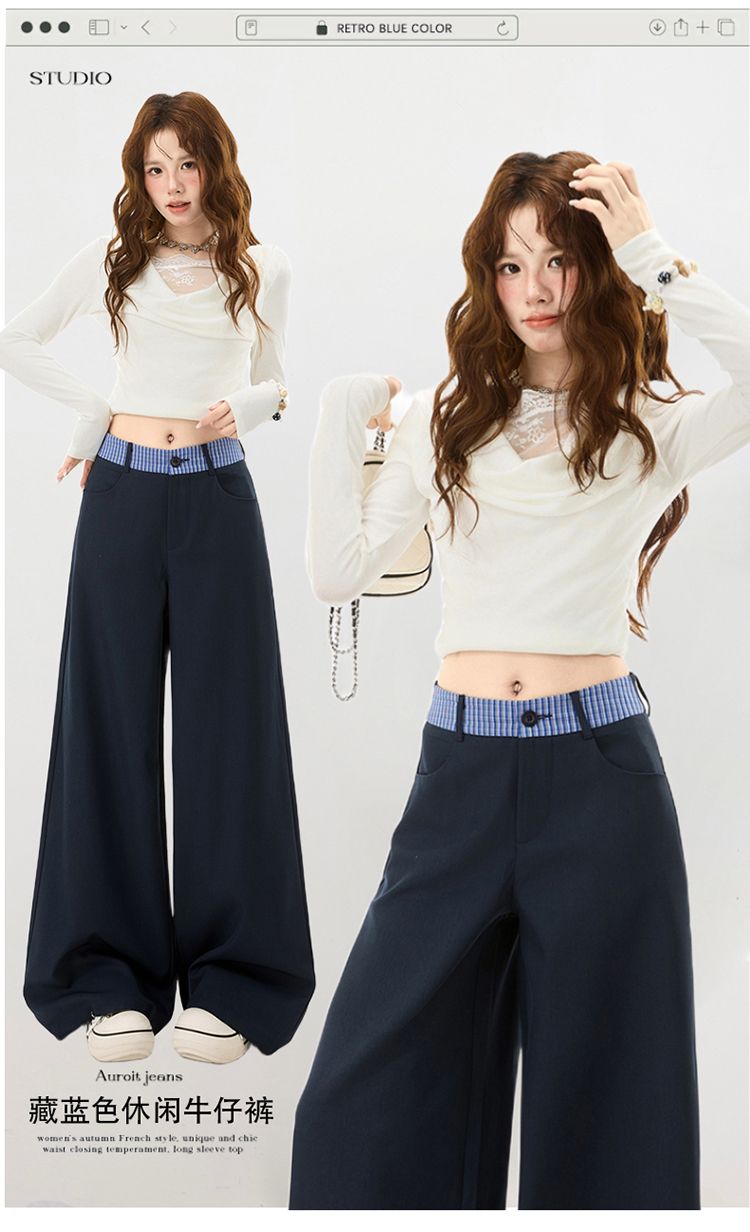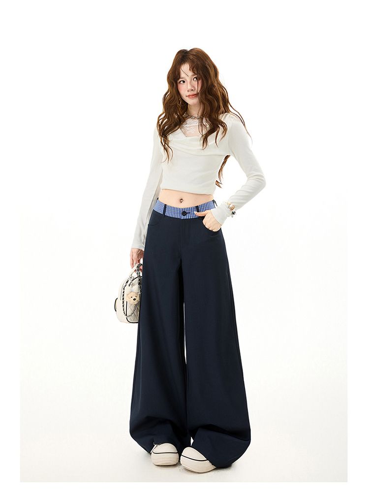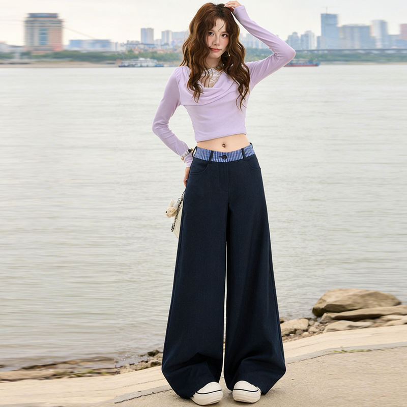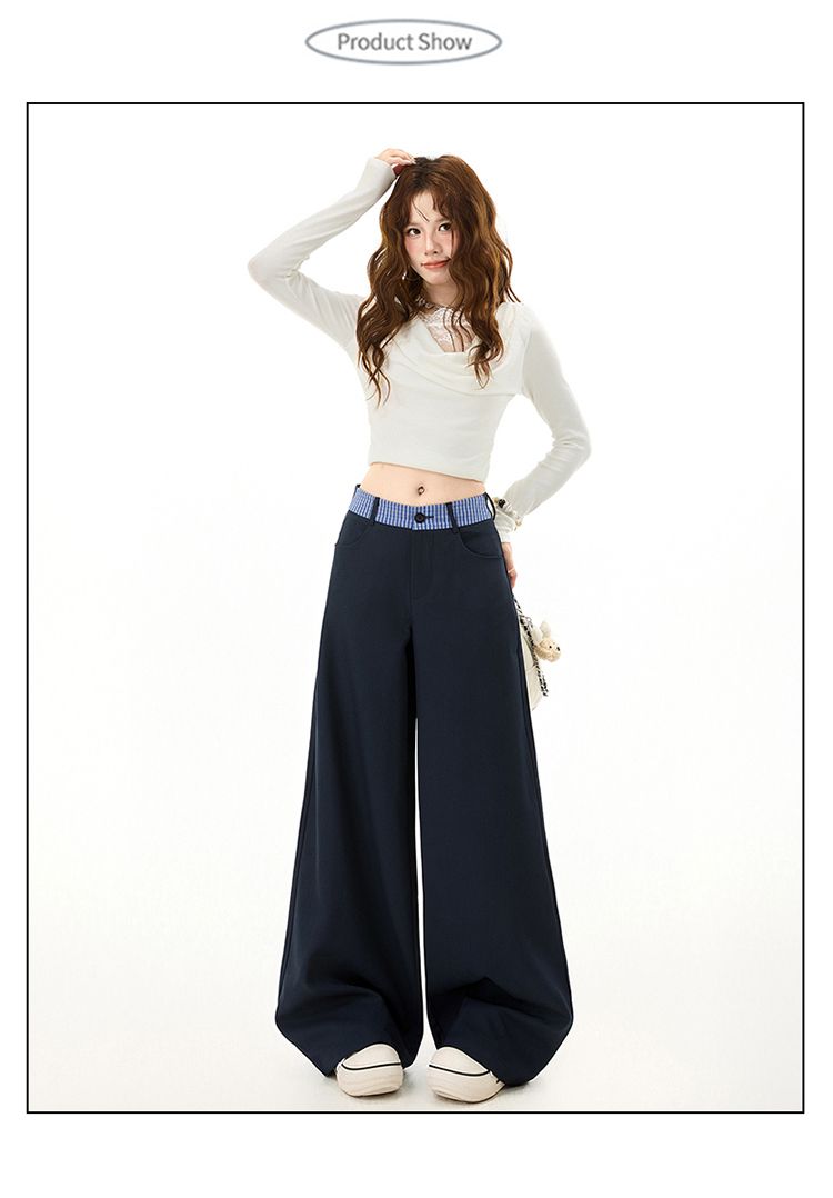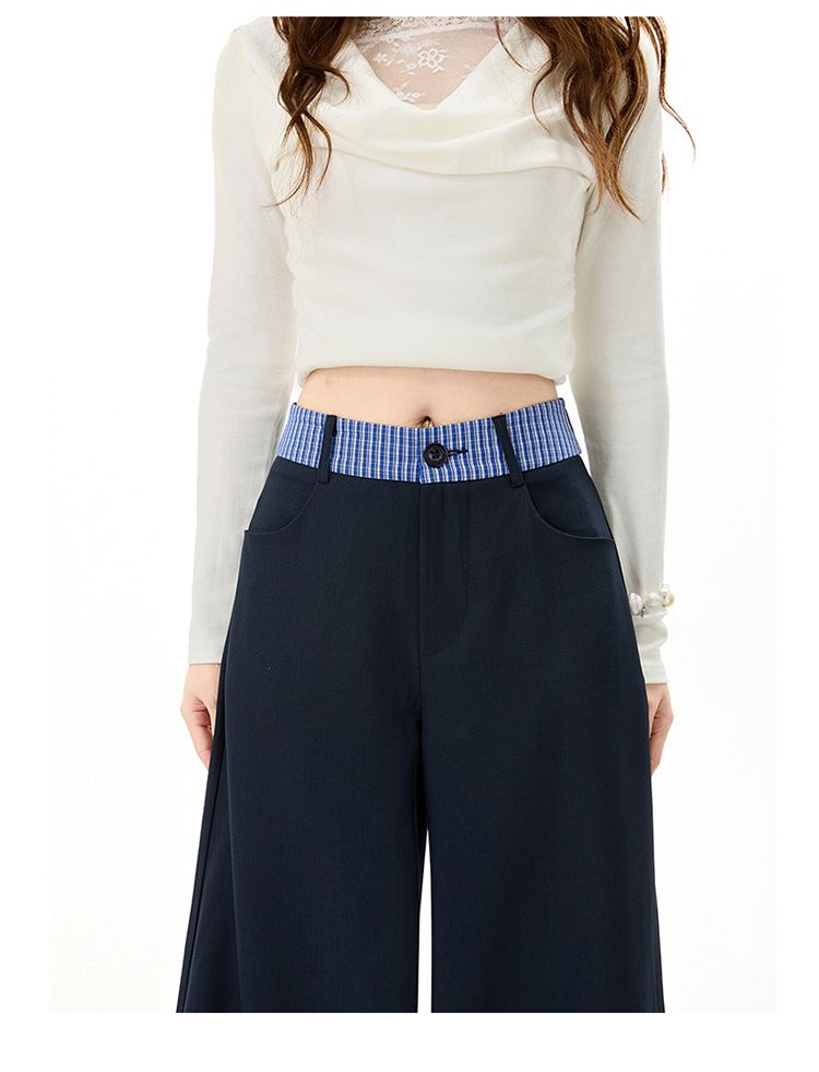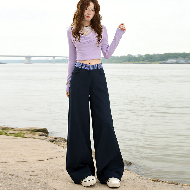 실사 2026 새로운 아메리칸 체크무늬 패치워크 해군 캐주얼 바지 여성 루즈핏 슬림해 보이는 하이웨이스트 넓은 다리 도루 센스 바지