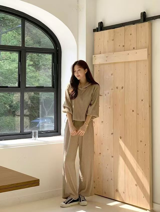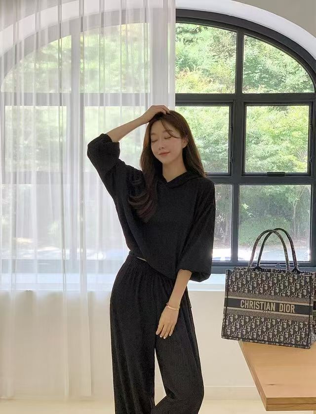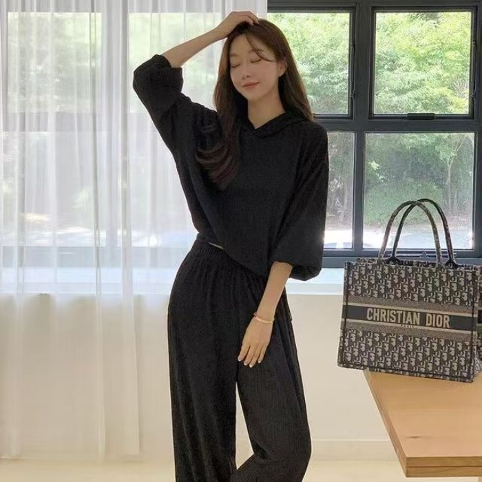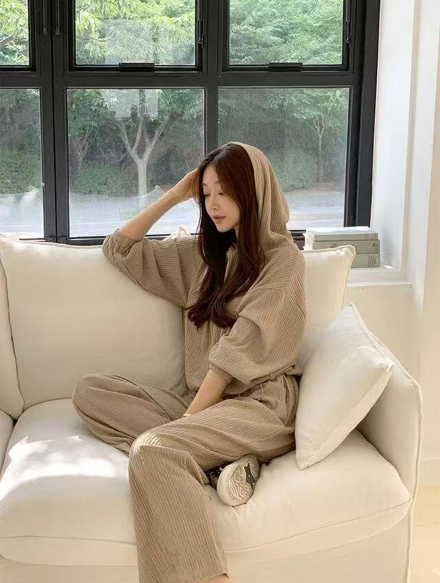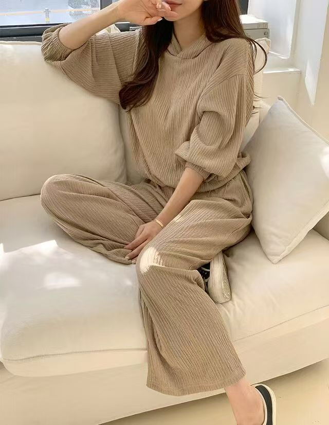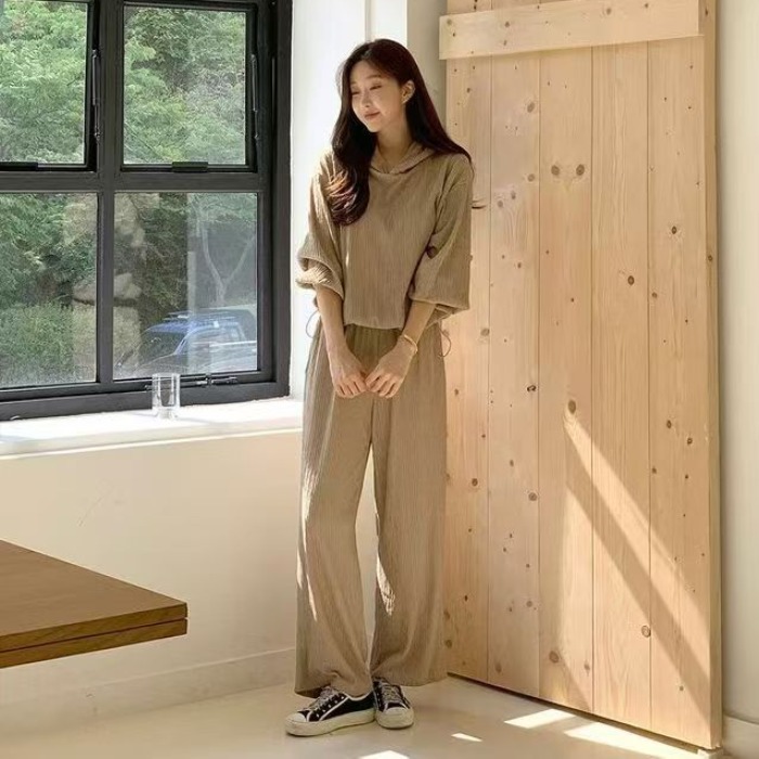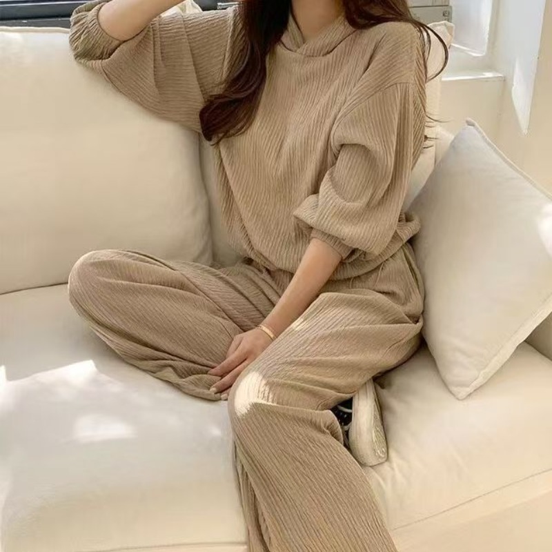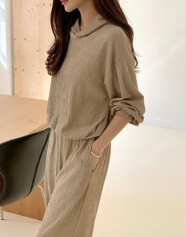 후드 세트 하이웨이스트 루즈핏 와이드 레그 팬츠 허리밴드 플리츠 프로 피부 질감 셔츠 밑단 펌프 로프 디자인