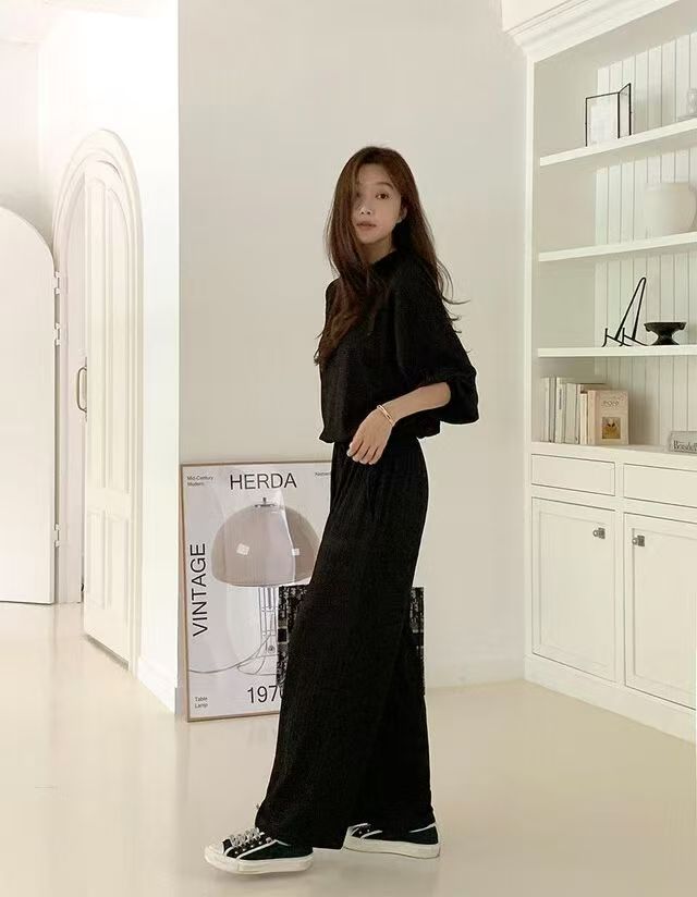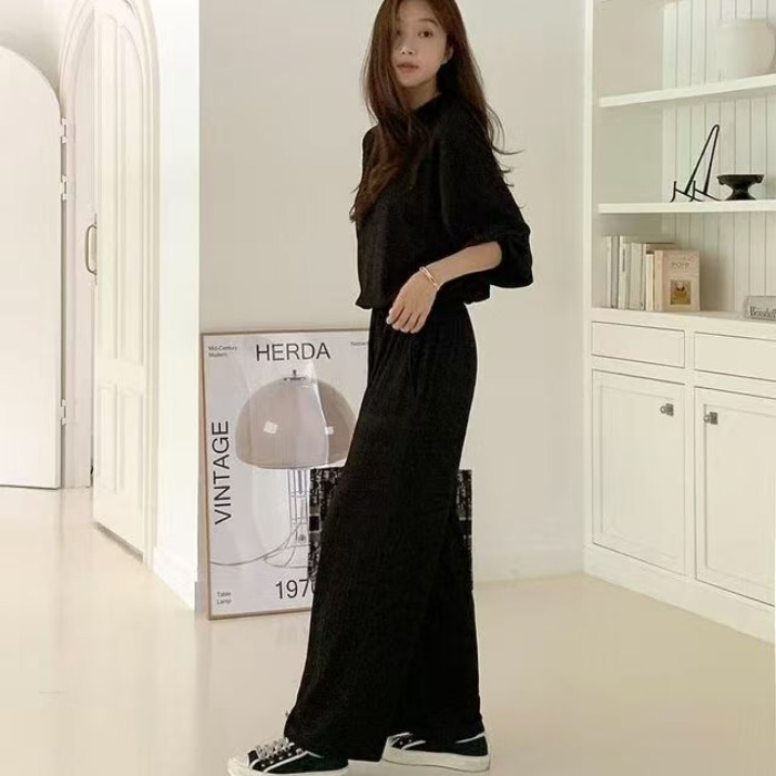 프랑스식 세트 단색 폴로 칼라 레이스업 허리 수축 반팔 셔츠 하이웨이스트 와이드 레그 팬츠 바닥 청소 바지 두 조각 여성 세트