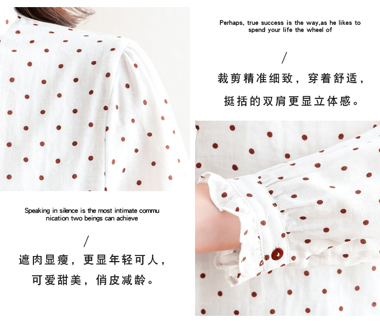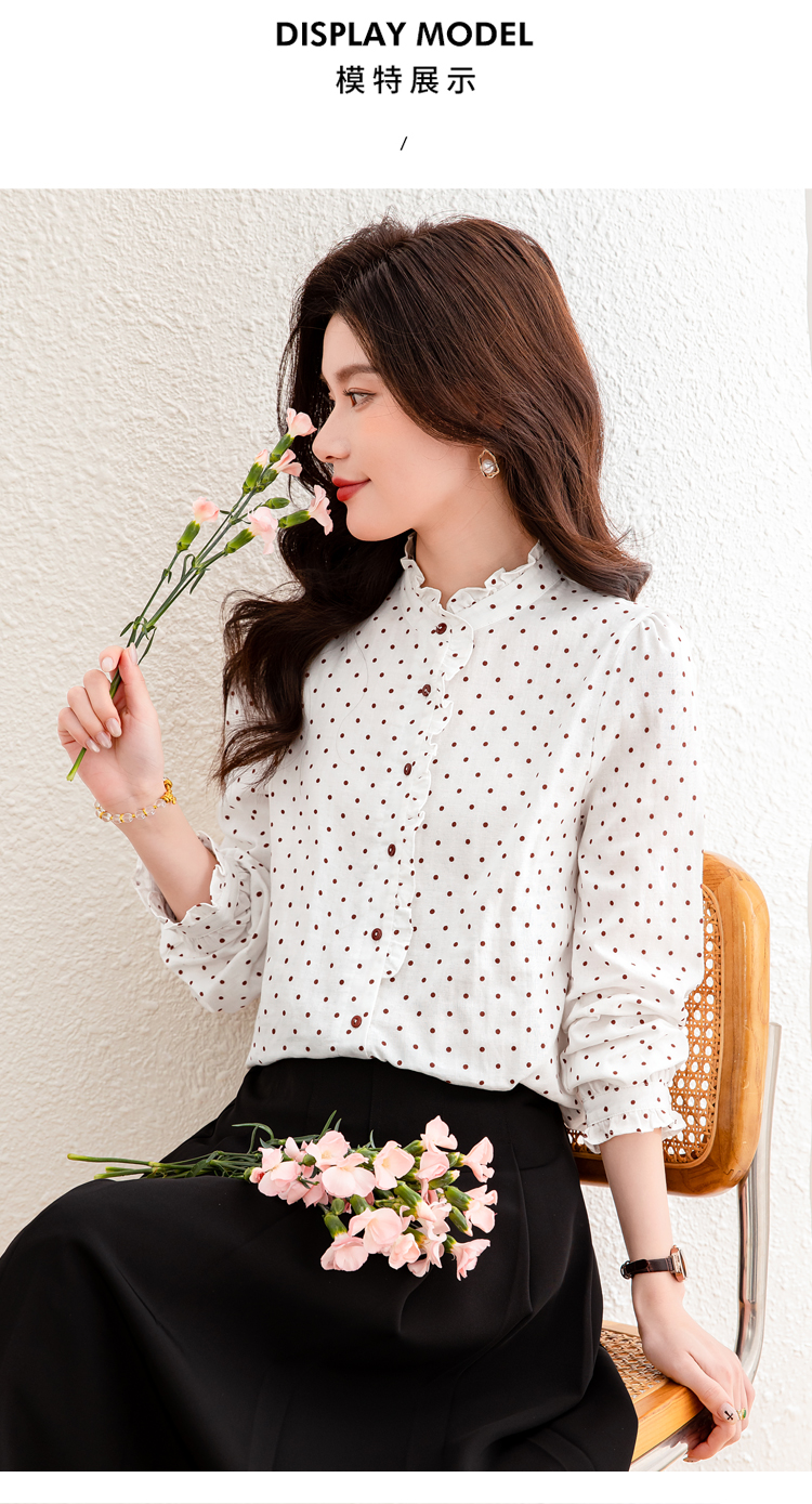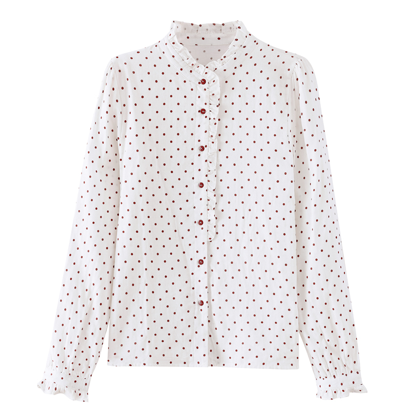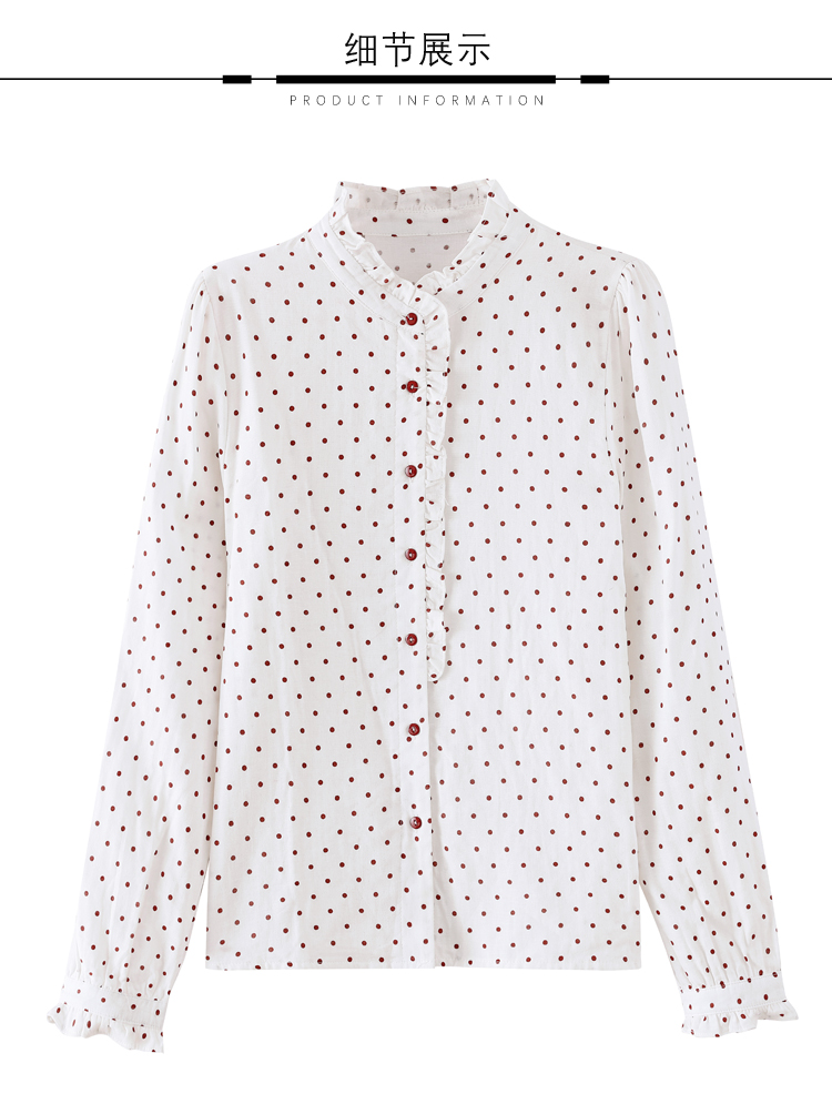 실사 프린트 평직 이중층 면 긴팔 봄 프릴 스탠드 칼라 여성 셔츠 외국 가스 다용도 긴팔 맨위