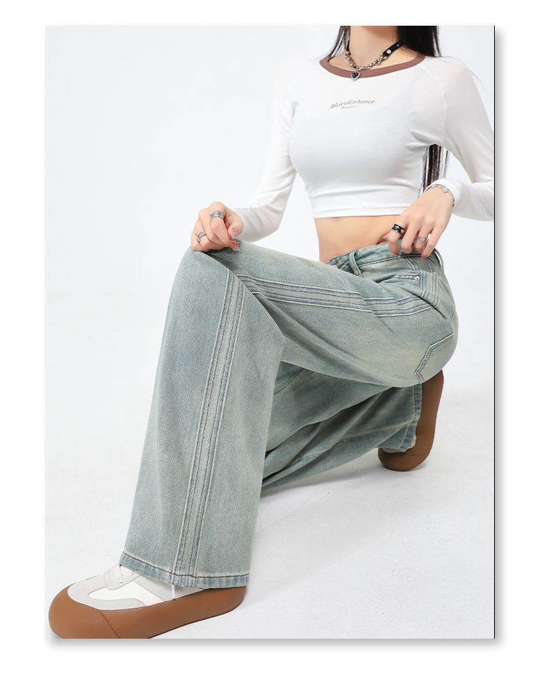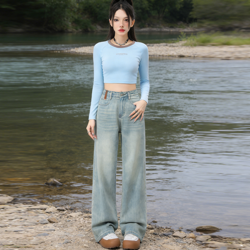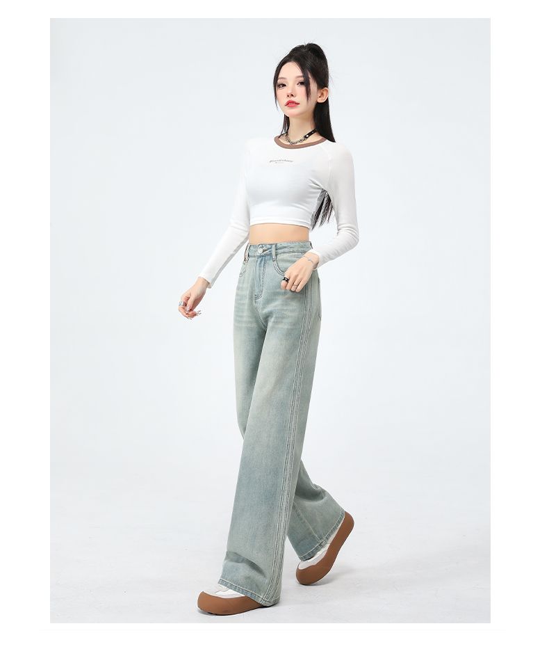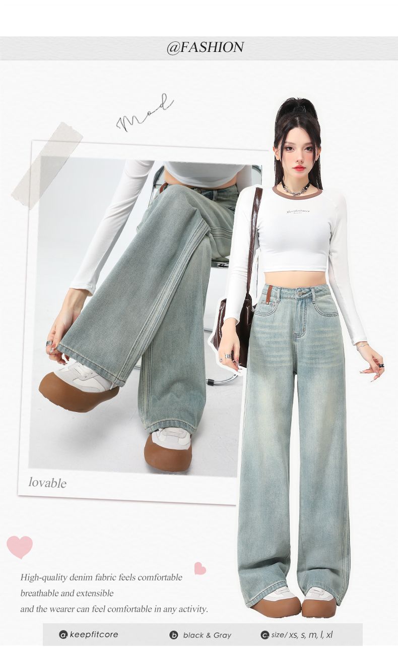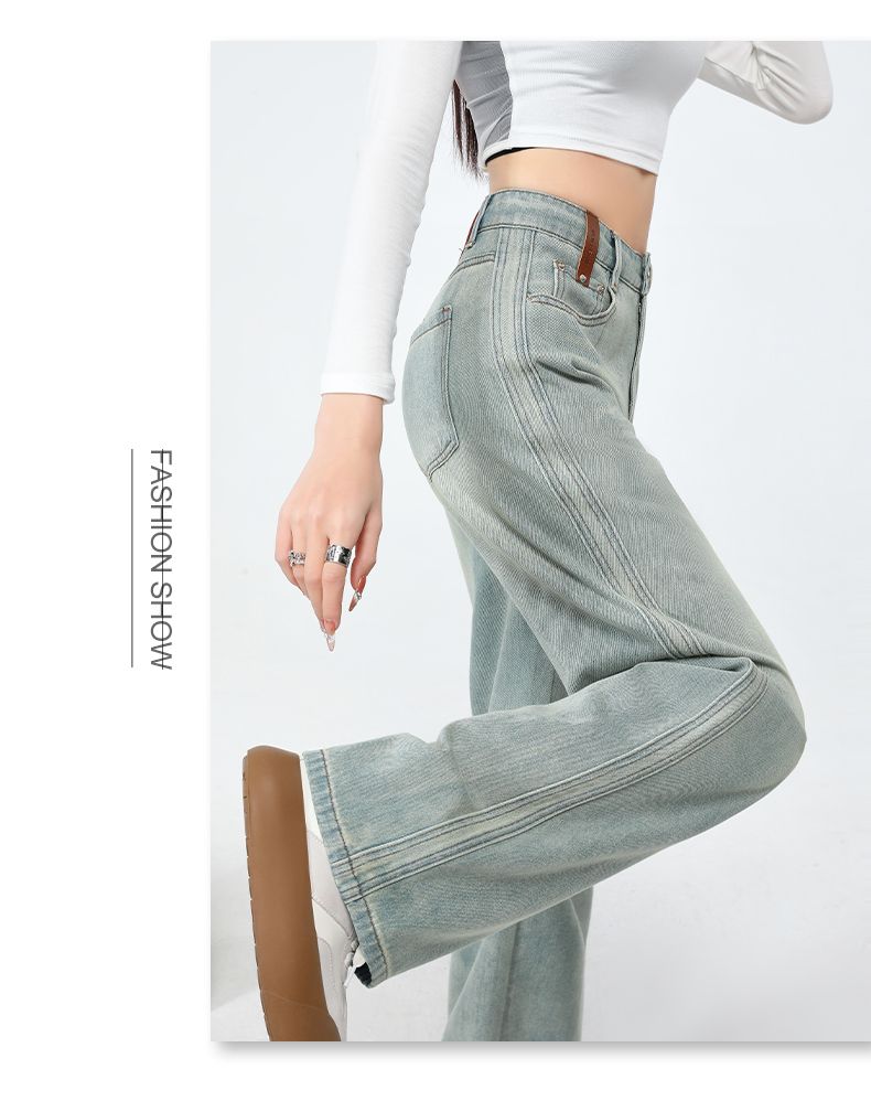 실사 Gypsophila 플래시 훈련 봄 새로운 하이웨이스트 아메리칸 좁은 에디션 스트레이트 넓은 다리 청바지 여성 루즈핏 바닥 청소 바지