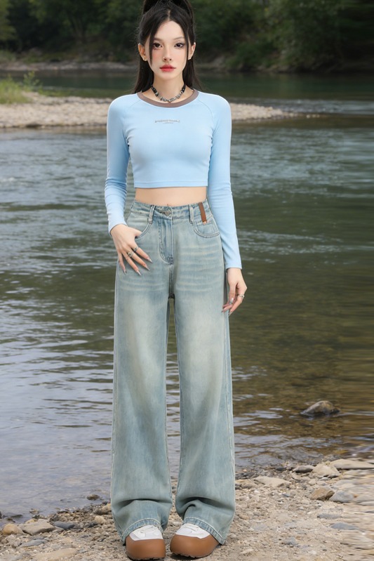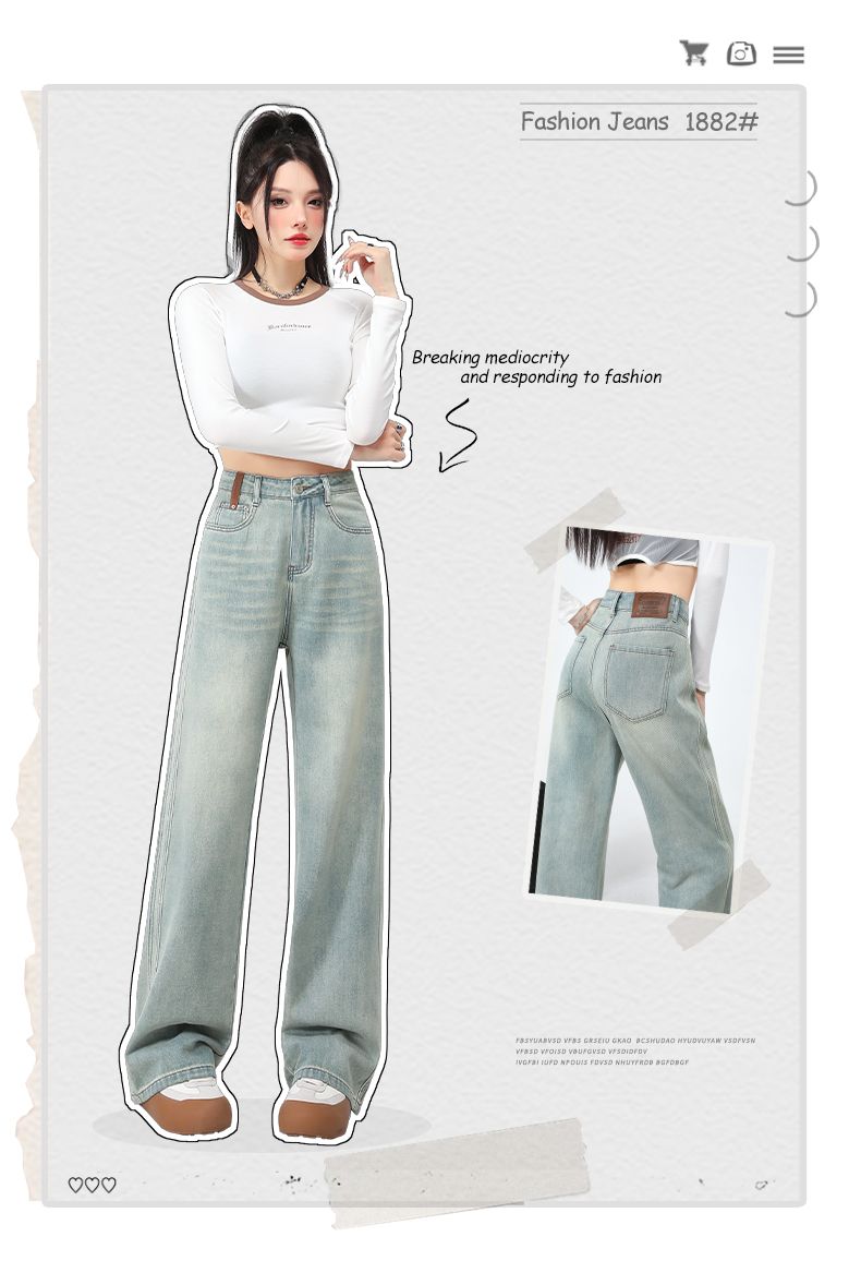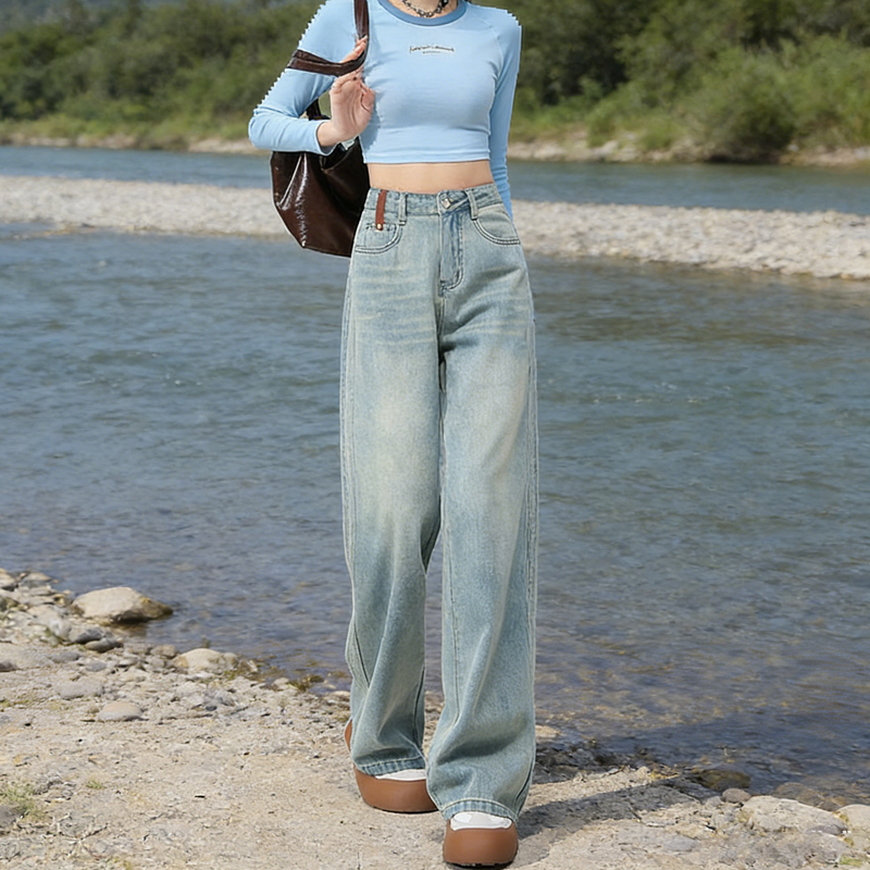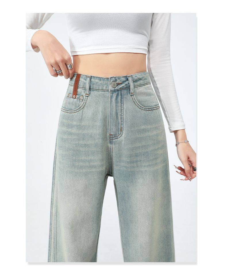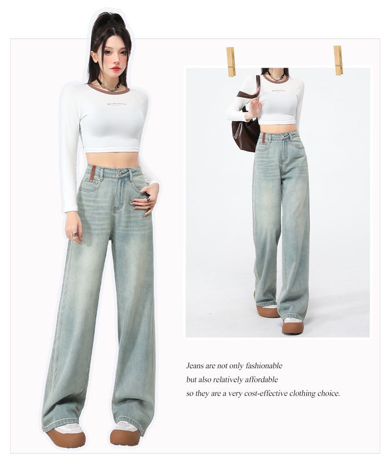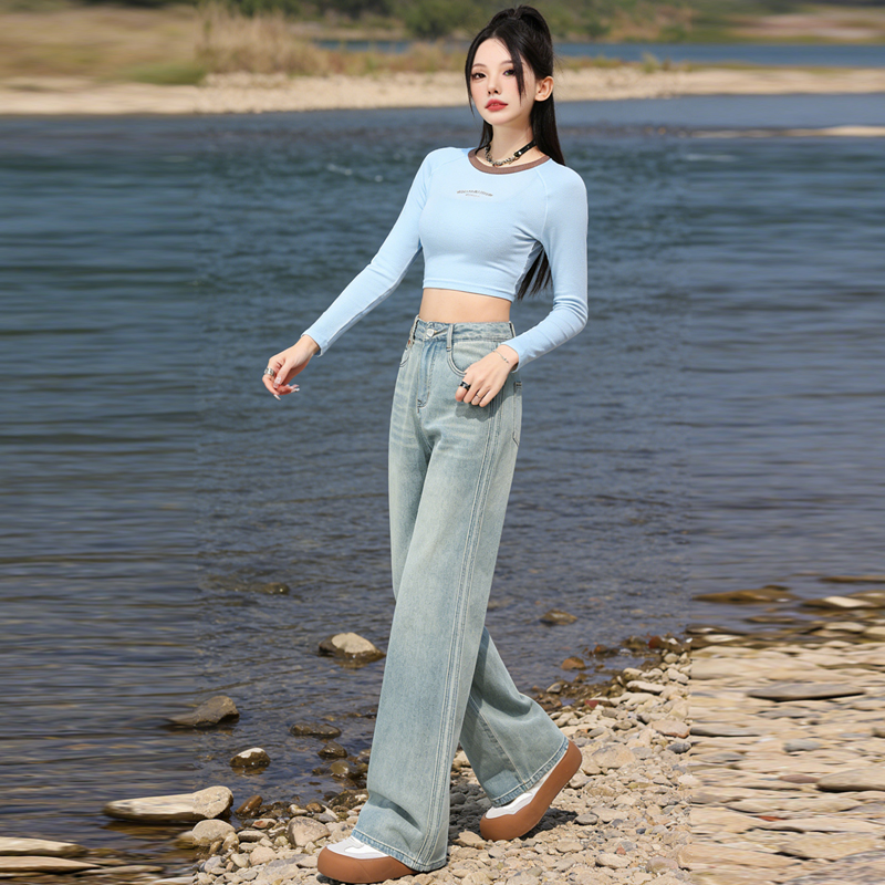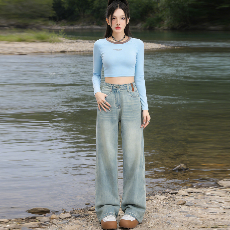 실사 Gypsophila 플래시 훈련 봄 새로운 하이웨이스트 아메리칸 좁은 에디션 스트레이트 넓은 다리 청바지 여성 루즈핏 바닥 청소 바지