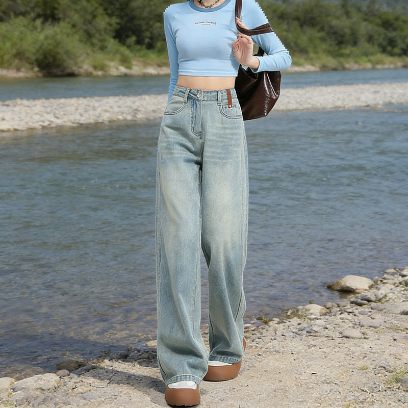 실사 2026 봄 새로운 하늘색 레트로 하이웨이스트 루즈핏 와이드 레그 팬츠 스트레이트 청바지 여성