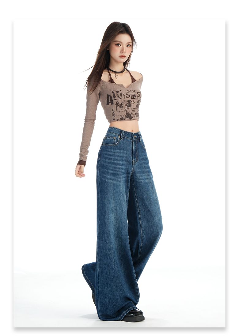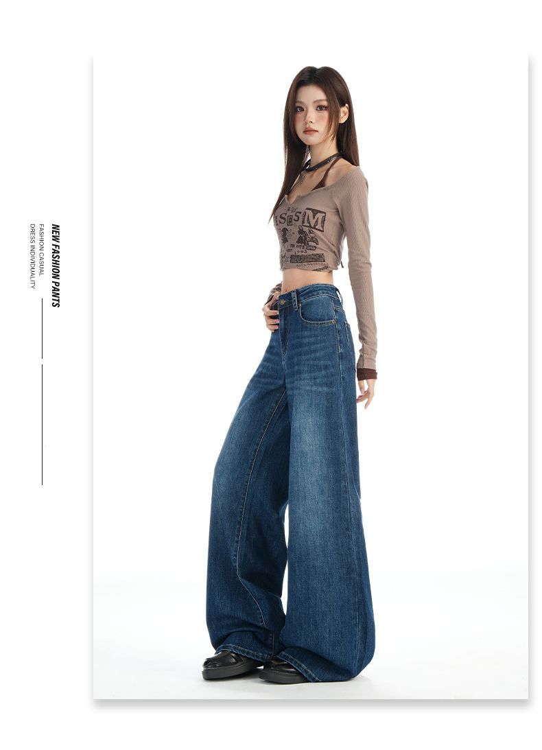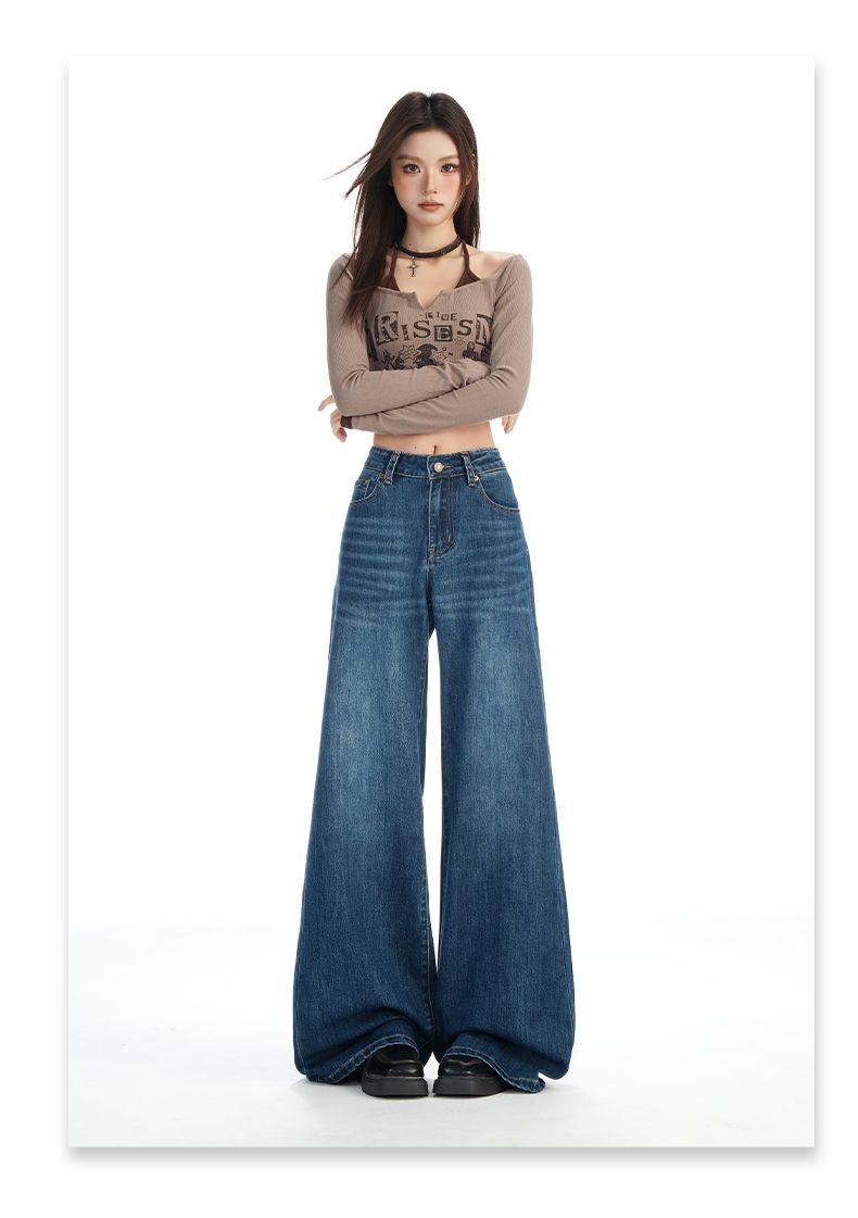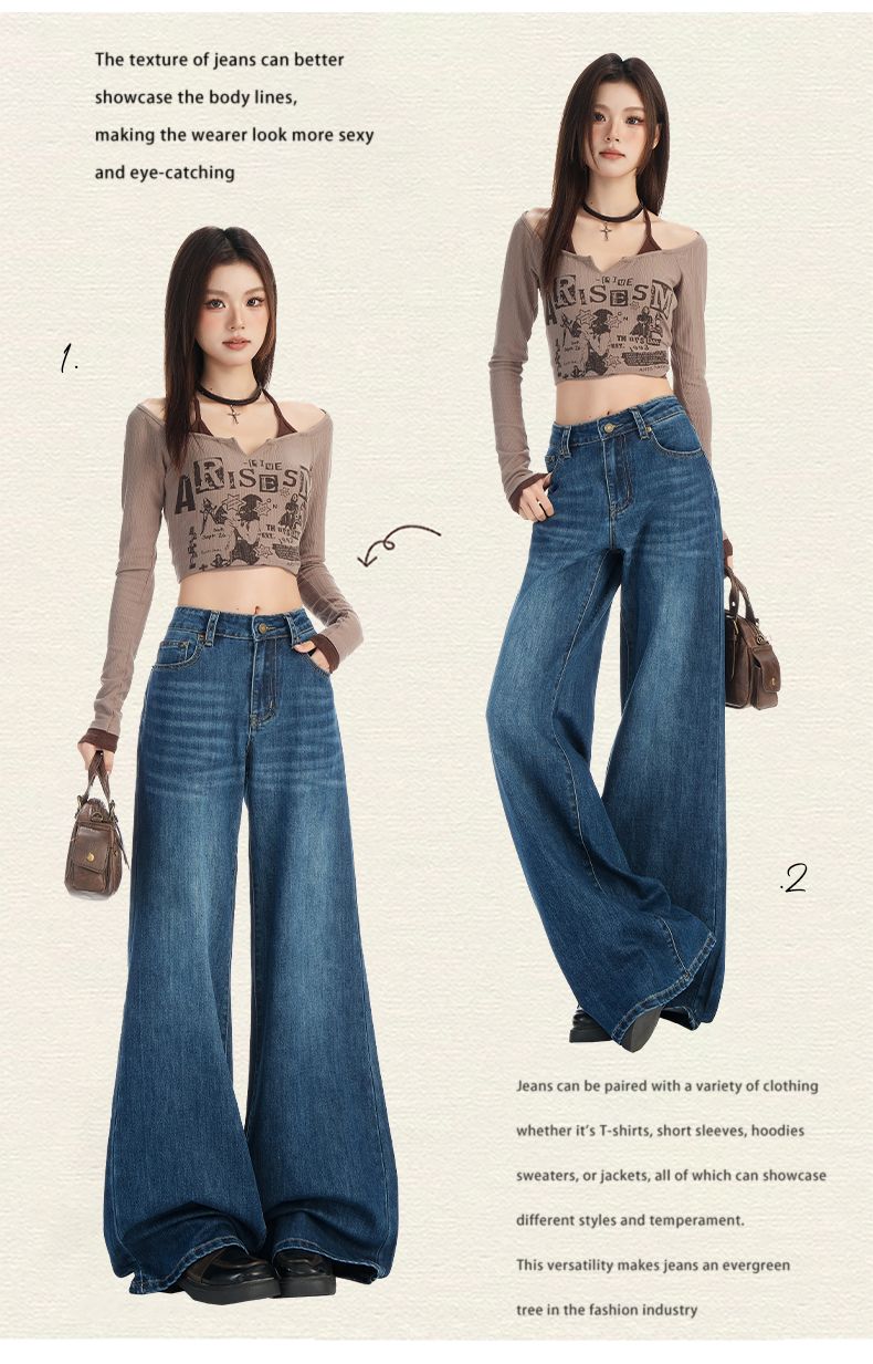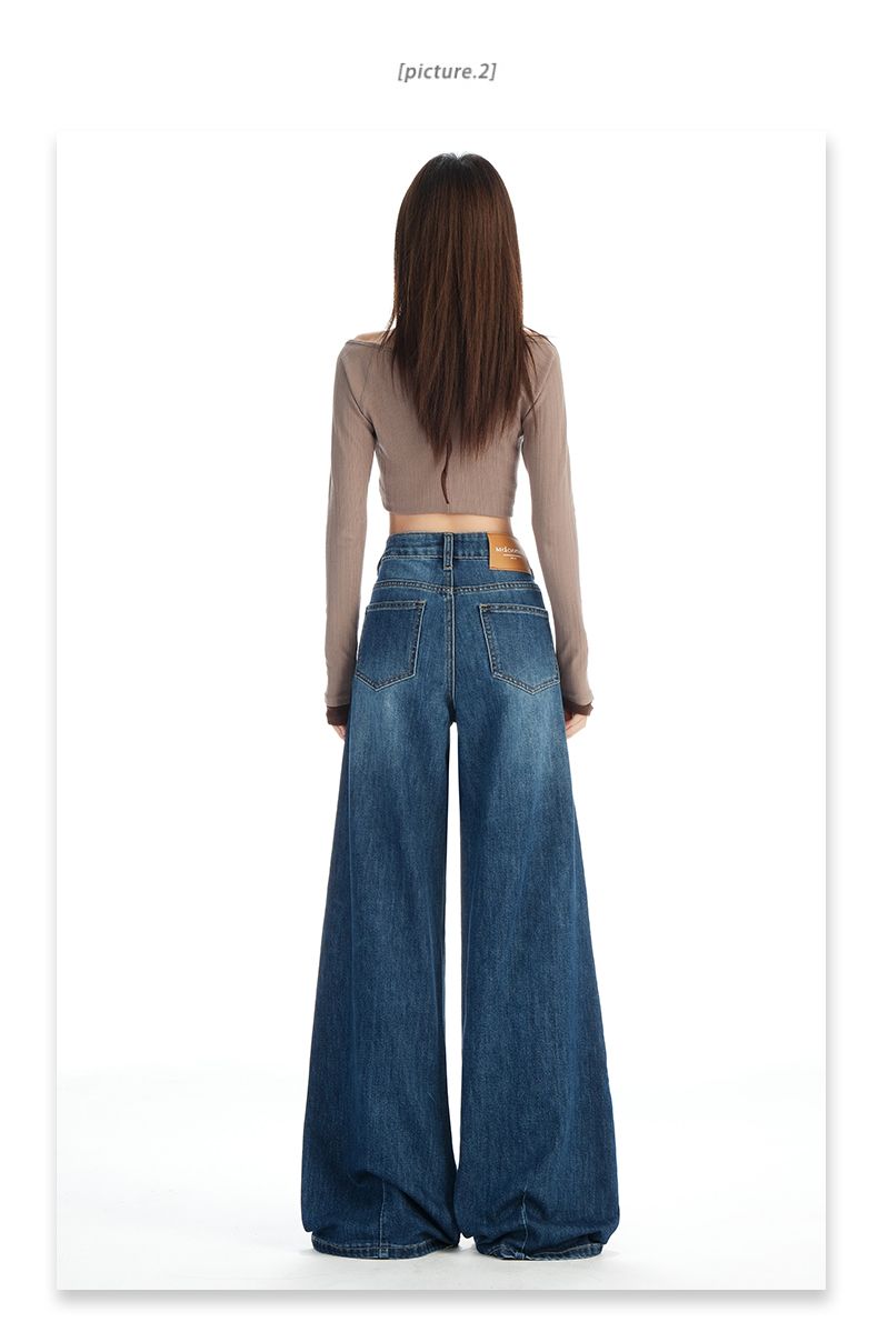 실사 Gypsophila 플래시 훈련 봄 새로운 하이웨이스트 아메리칸 좁은 에디션 스트레이트 넓은 다리 청바지 여성 루즈핏 바닥 청소 바지