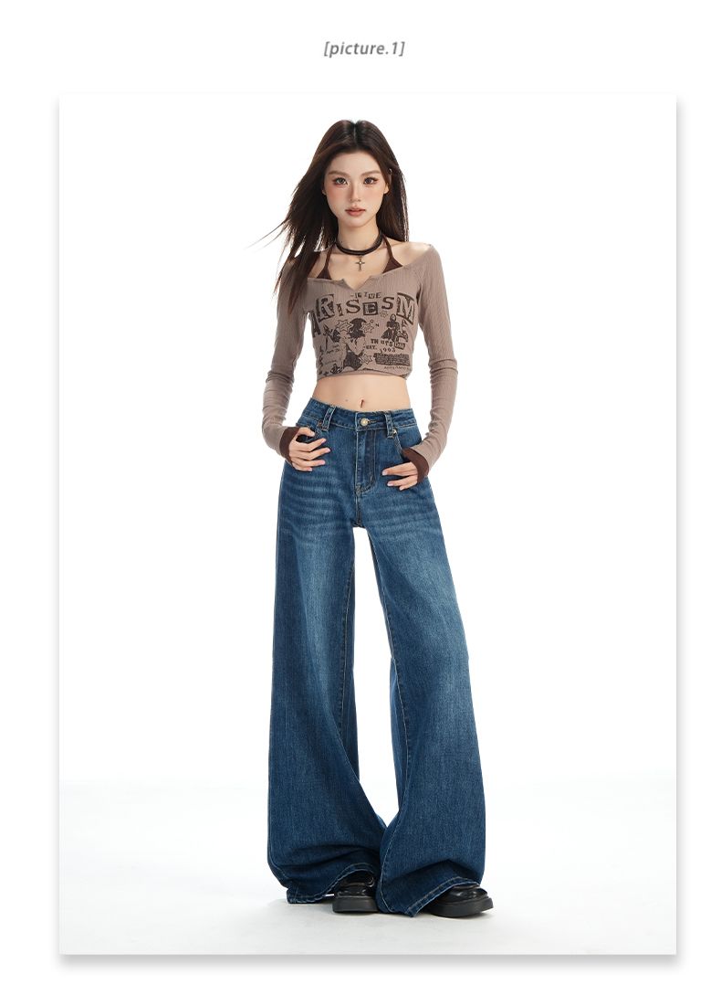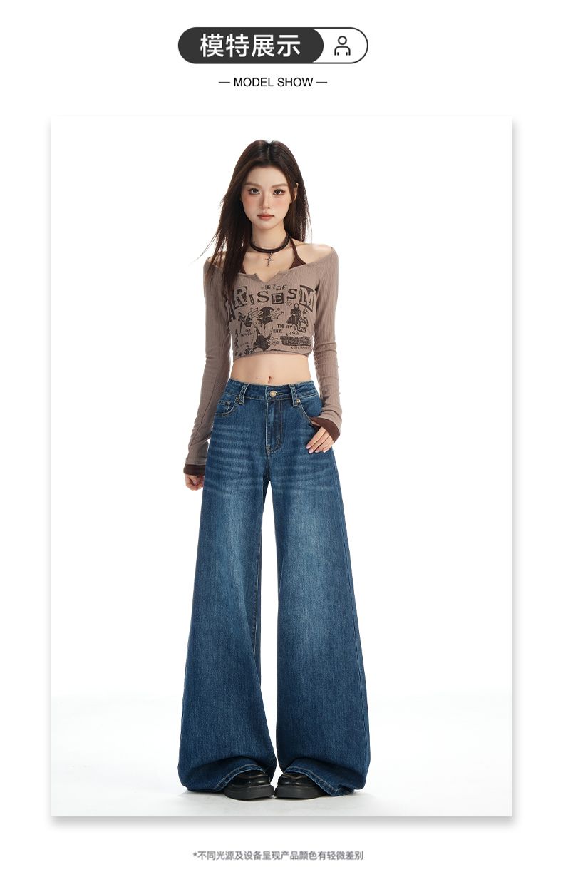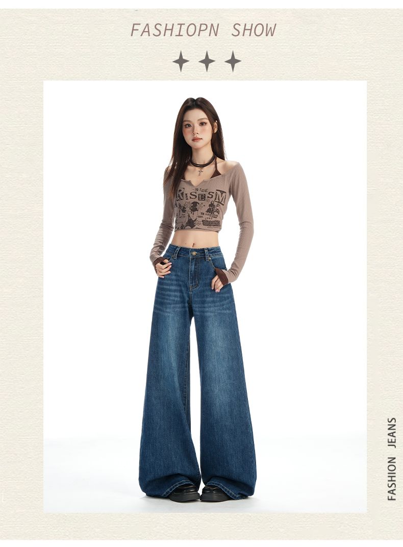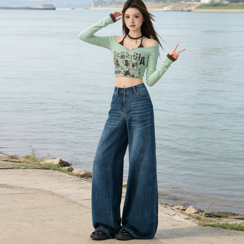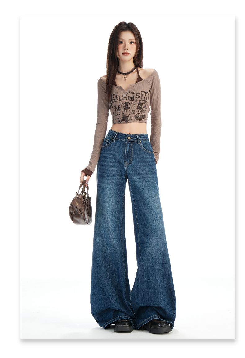 실사 Gypsophila 플래시 훈련 봄 새로운 하이웨이스트 아메리칸 좁은 에디션 스트레이트 넓은 다리 청바지 여성 루즈핏 바닥 청소 바지