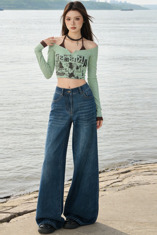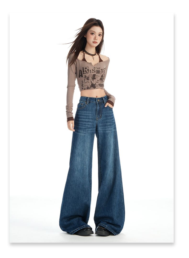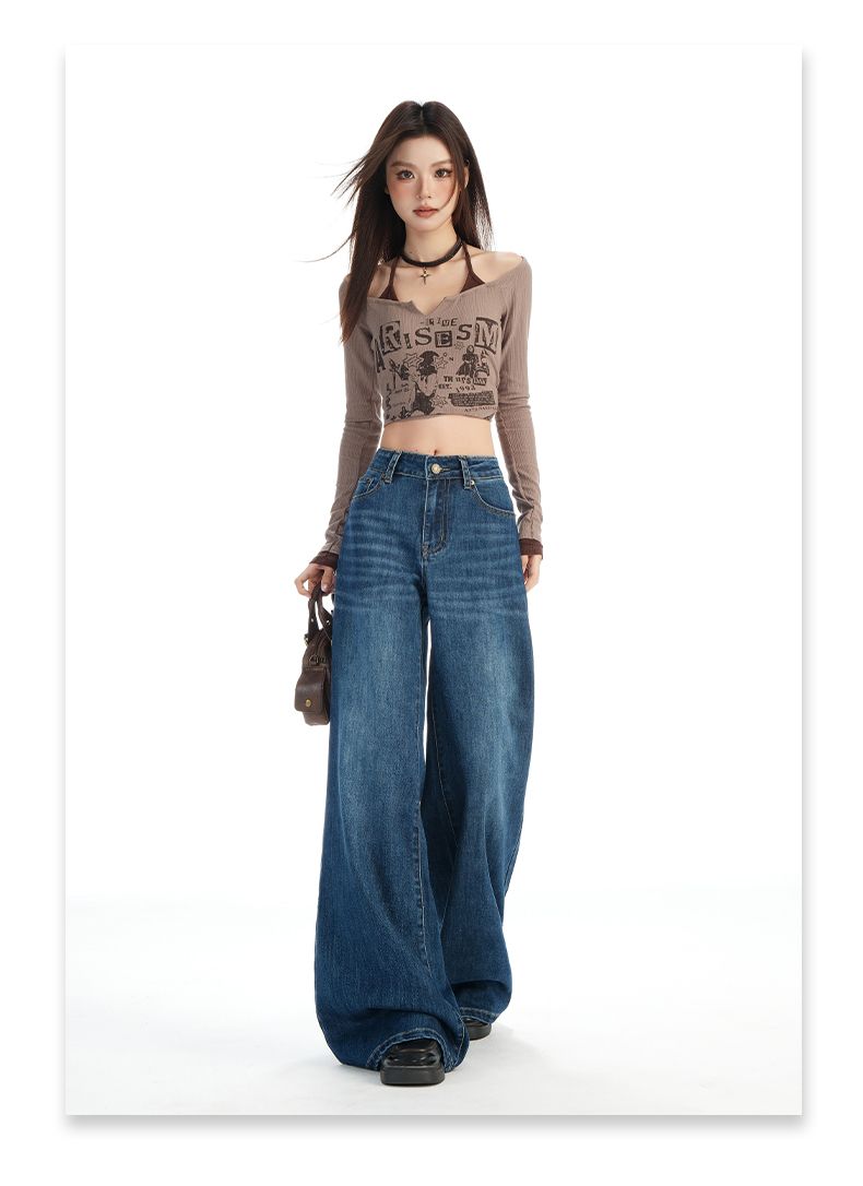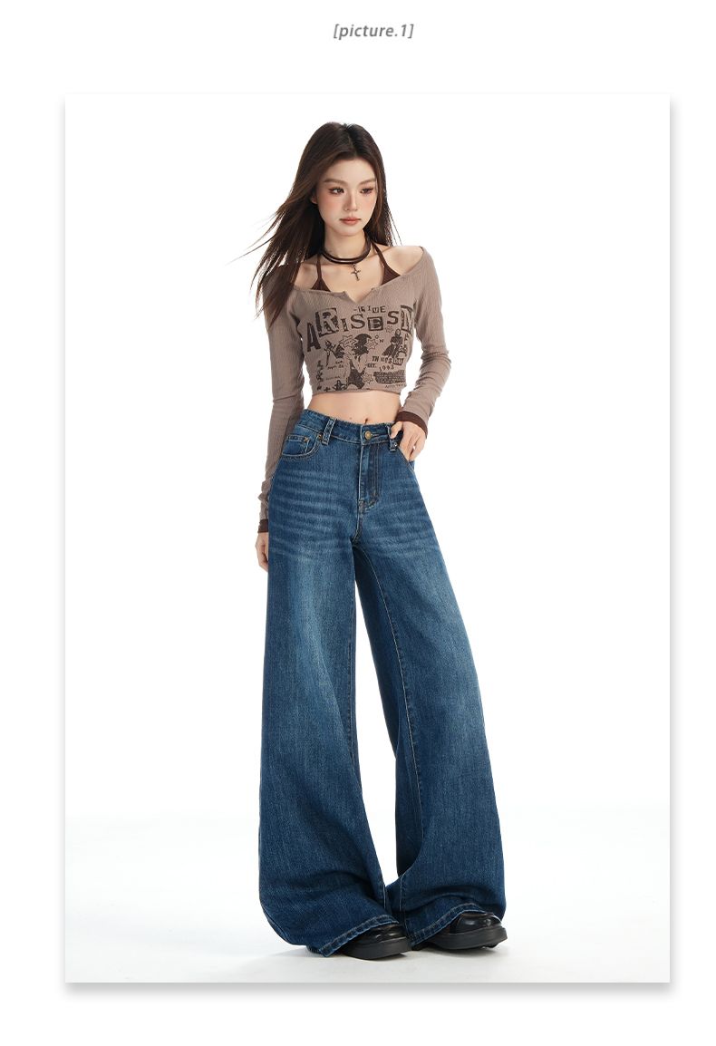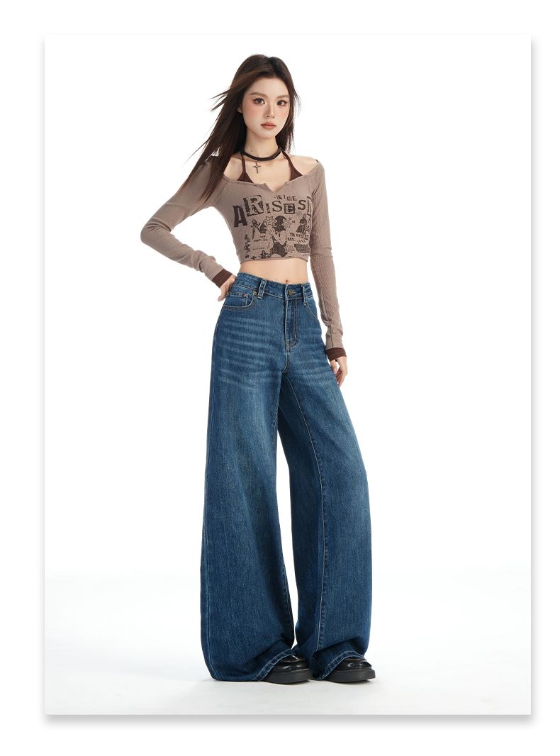 실사 Gypsophila 플래시 훈련 봄 새로운 하이웨이스트 아메리칸 좁은 에디션 스트레이트 넓은 다리 청바지 여성 루즈핏 바닥 청소 바지