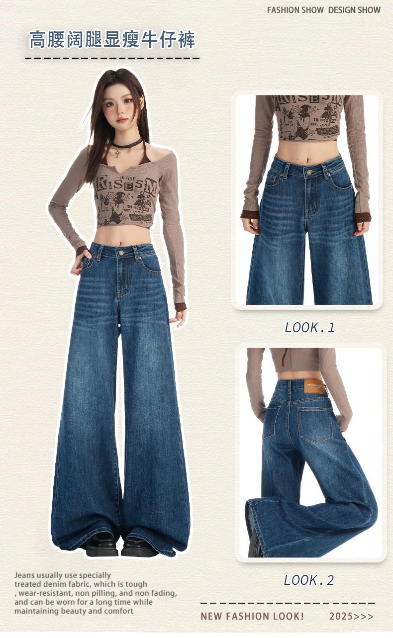 실사 2026 봄 뜨거운 판매 새로운 아메리칸 레트로 새로운 와이드 레그 팬츠 청바지 하이웨이스트 슬림해 보이는 루즈핏 바닥 청소 바지