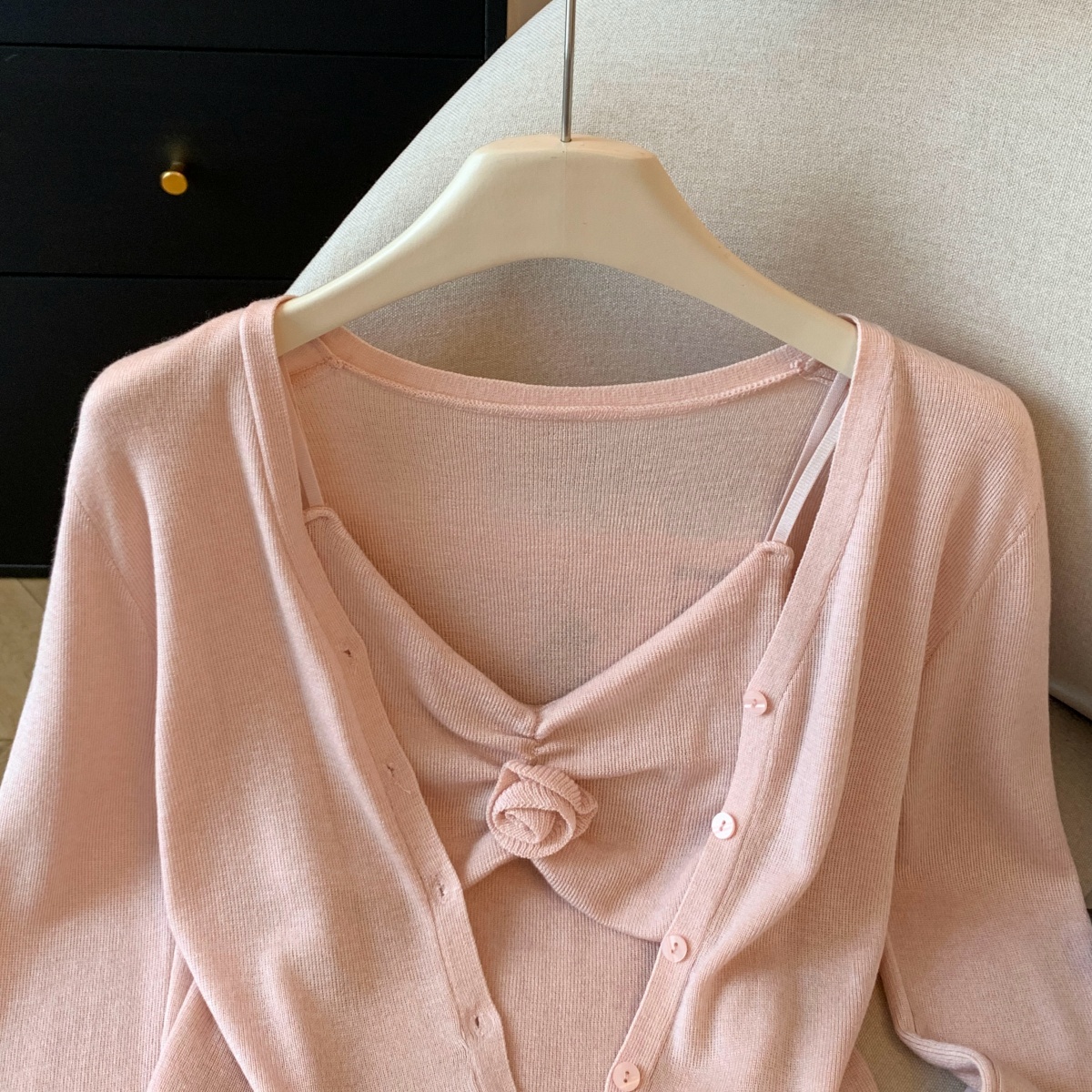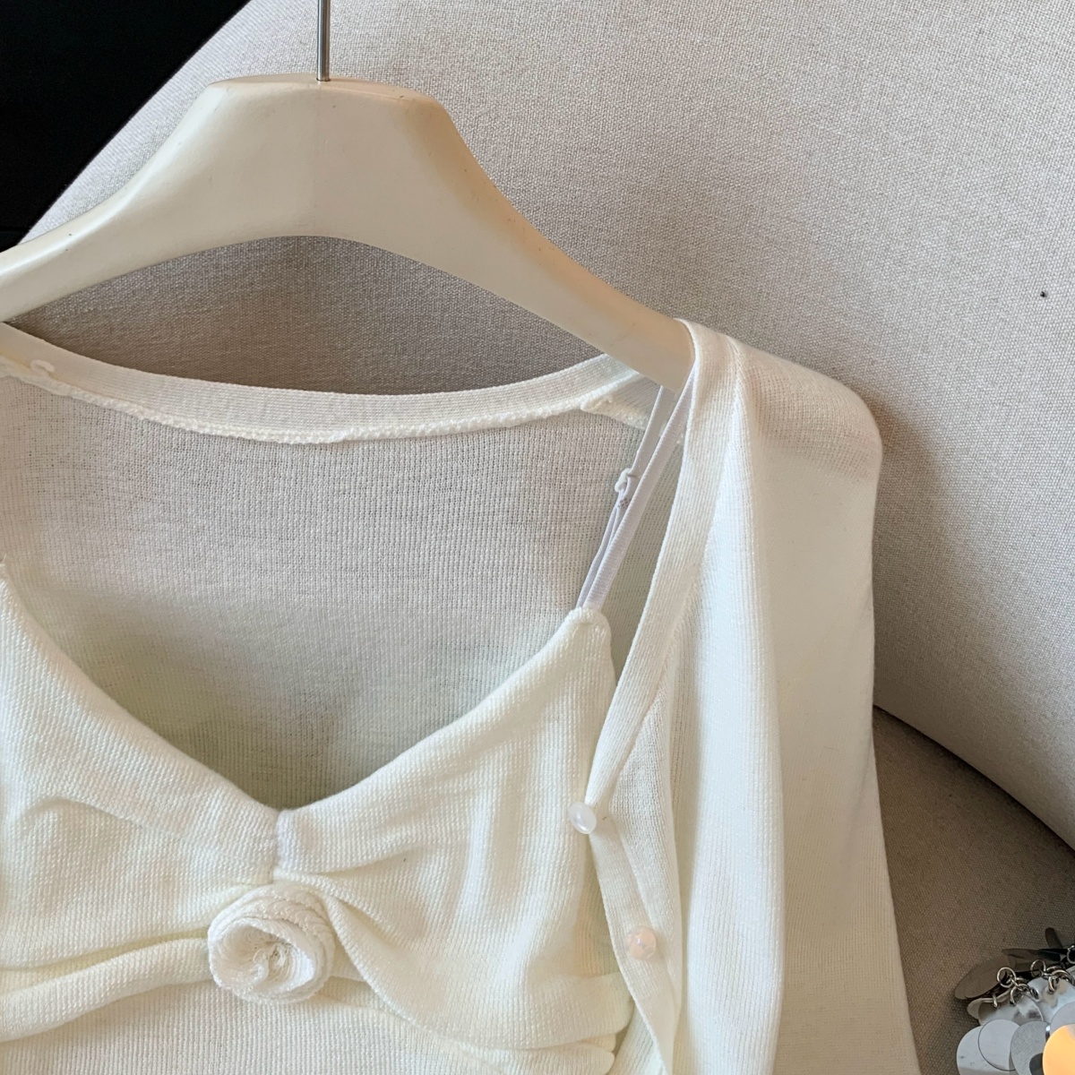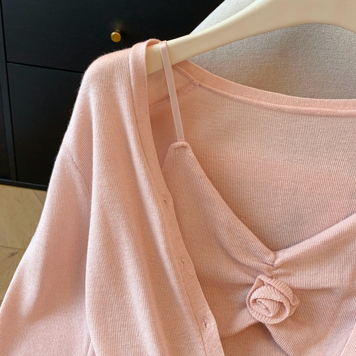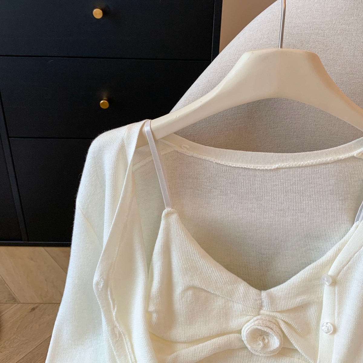 실사 이른 봄 새로운 슬립 3 차원 꽃 조끼 한 부서 부드러운 바람 달콤함 니트 오픈 가디건 두 조각 여성 세트
