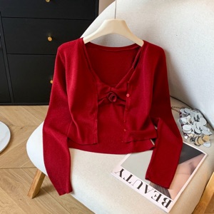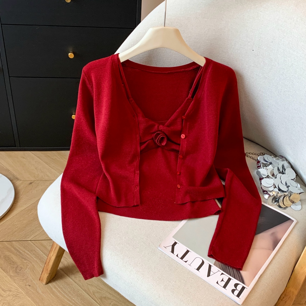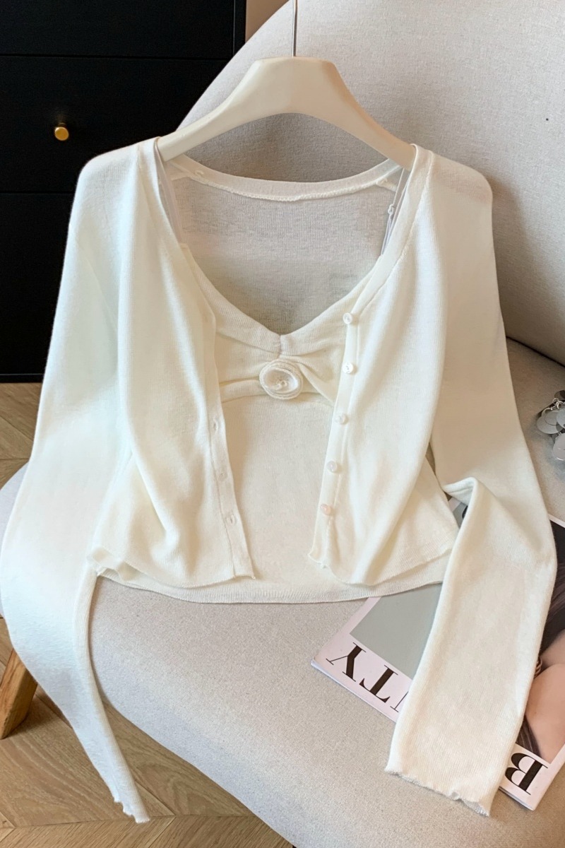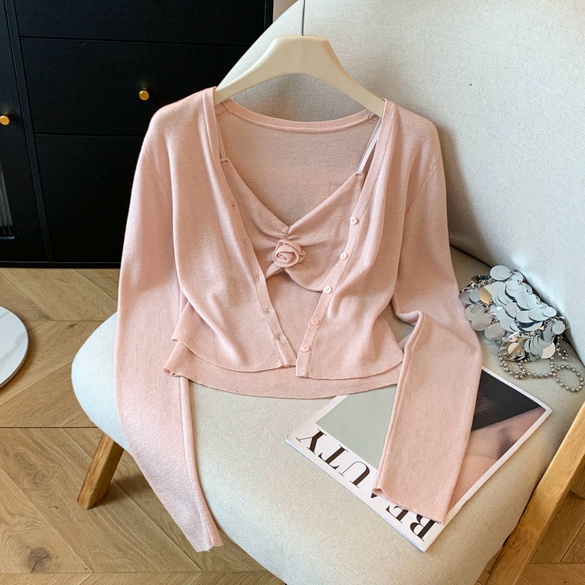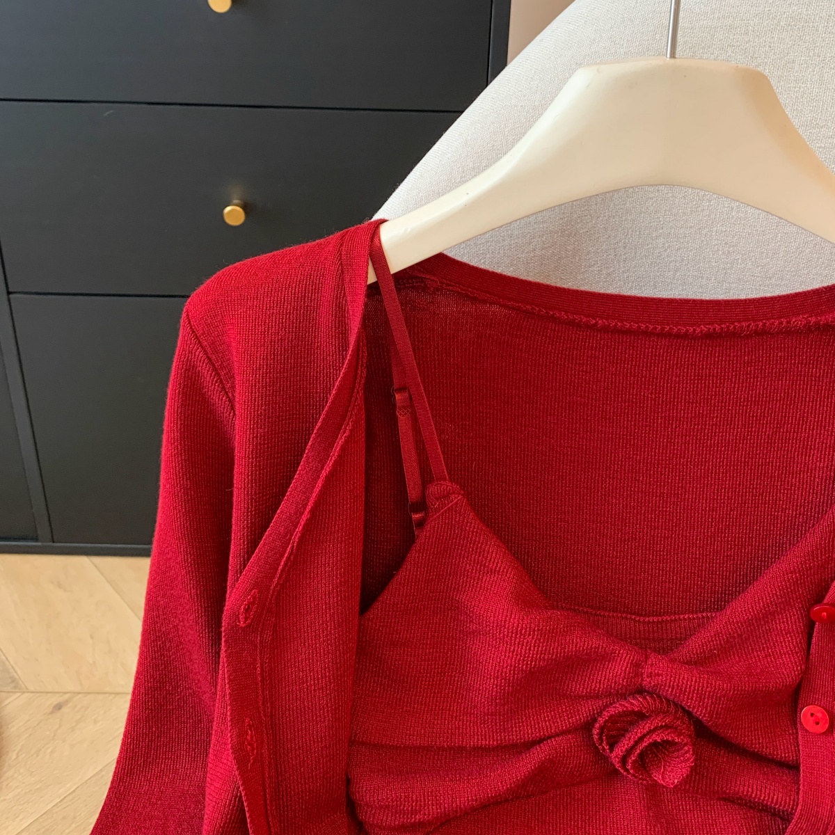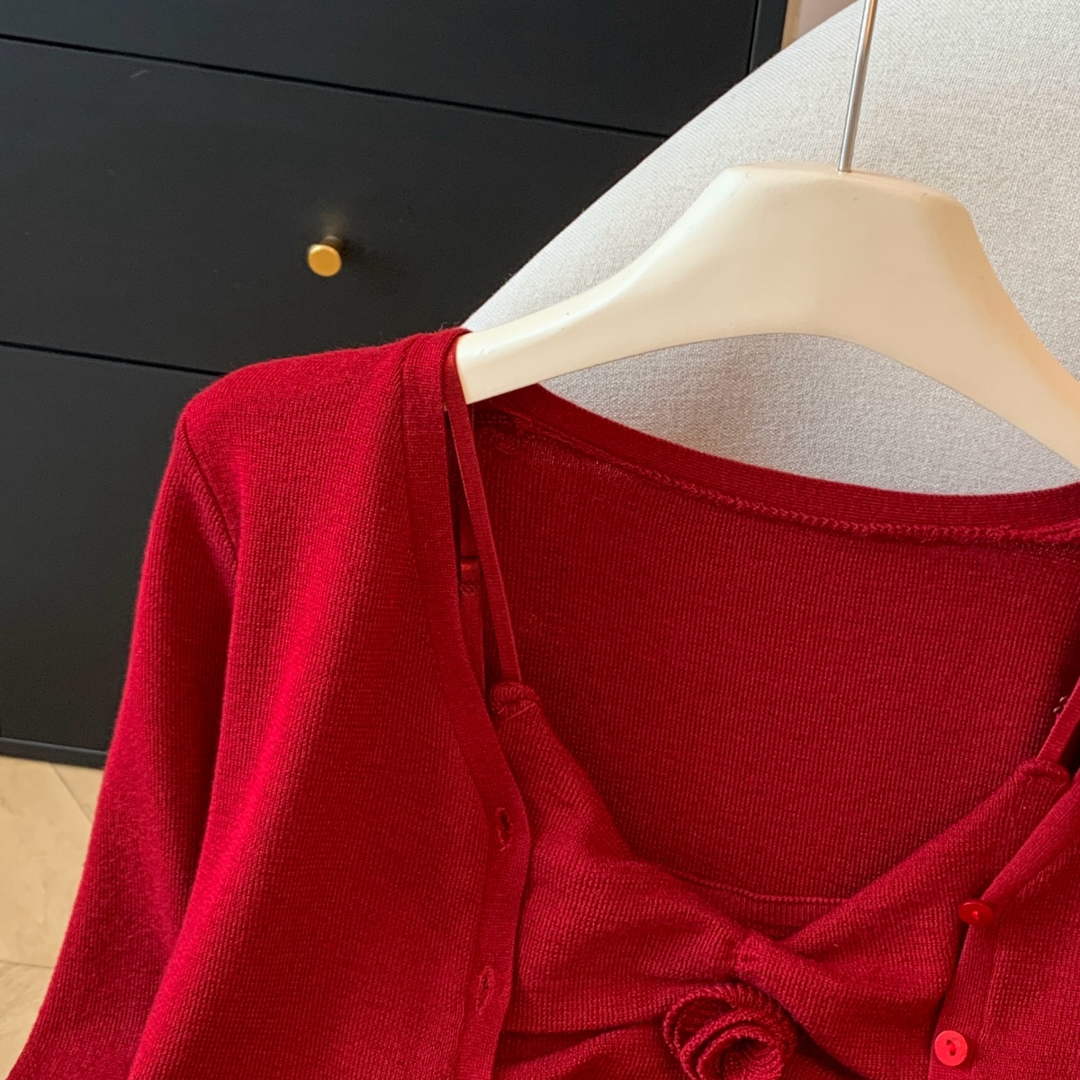 실사 이른 봄 새로운 슬립 3 차원 꽃 조끼 한 부서 부드러운 바람 달콤함 니트 오픈 가디건 두 조각 여성 세트