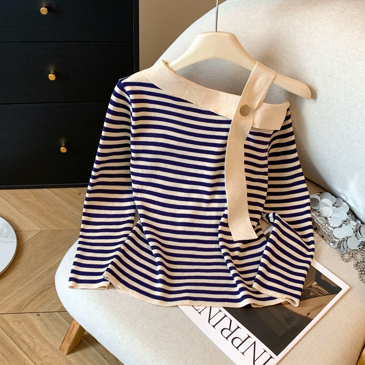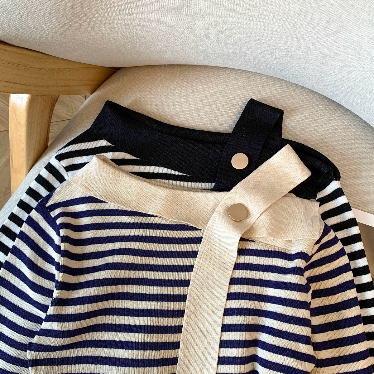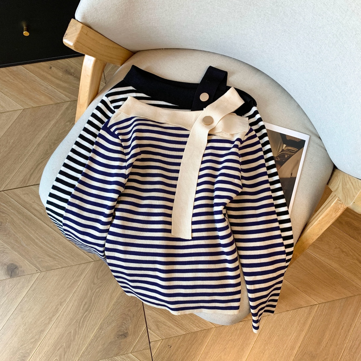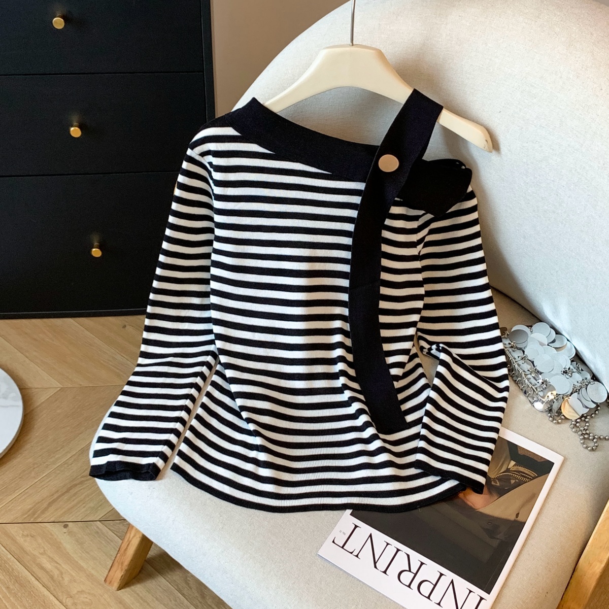 실사 작은 샤넬 스타일 배색 스트라이프 보트넥 오프숄더 니트 스웨터 여성 가을 겨울철 한 부서 분위기 센스 착용 잡아라. 의류