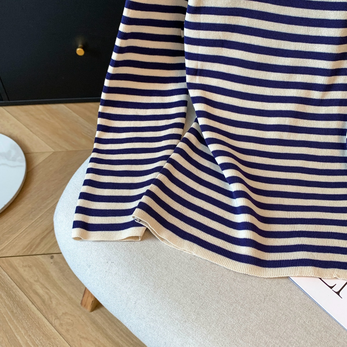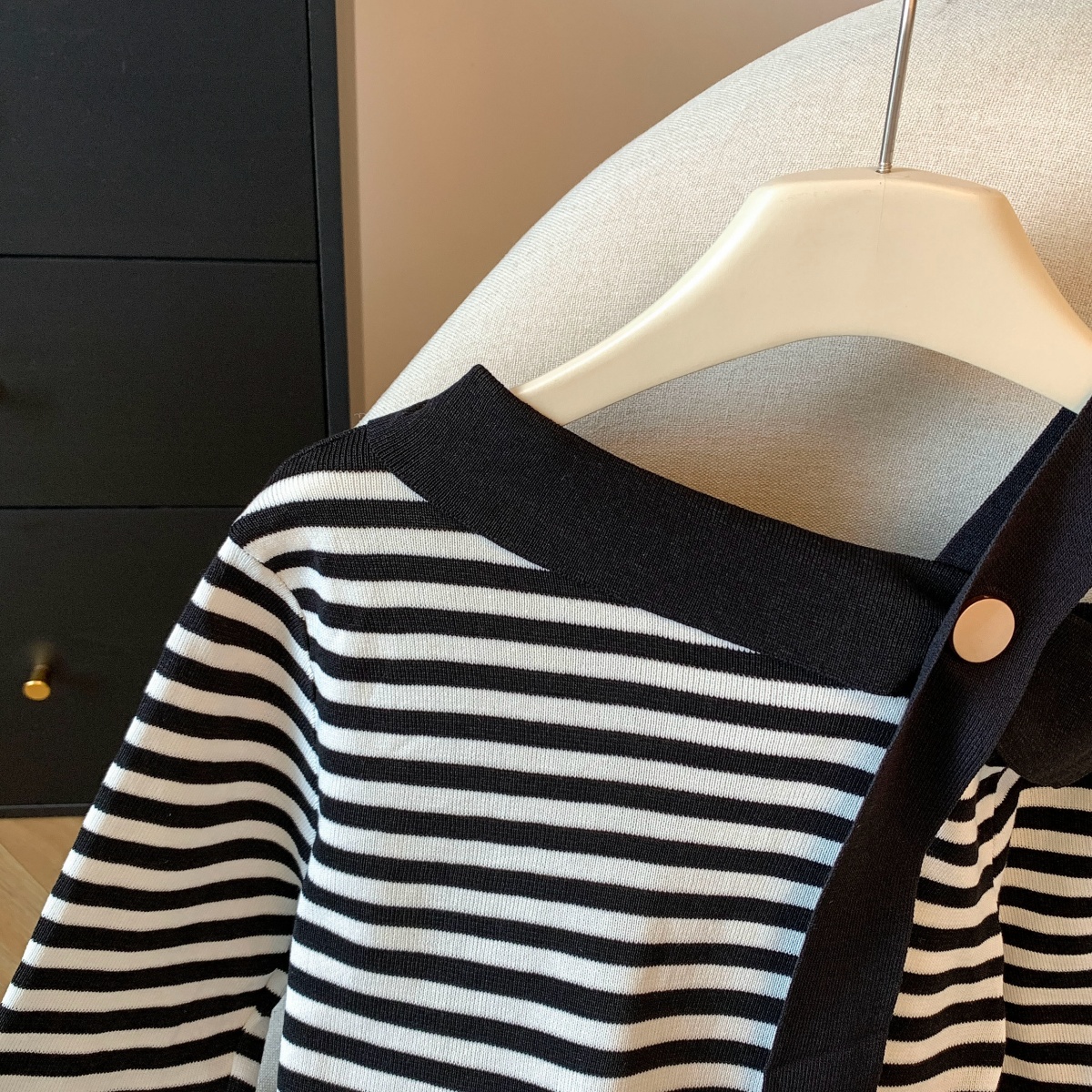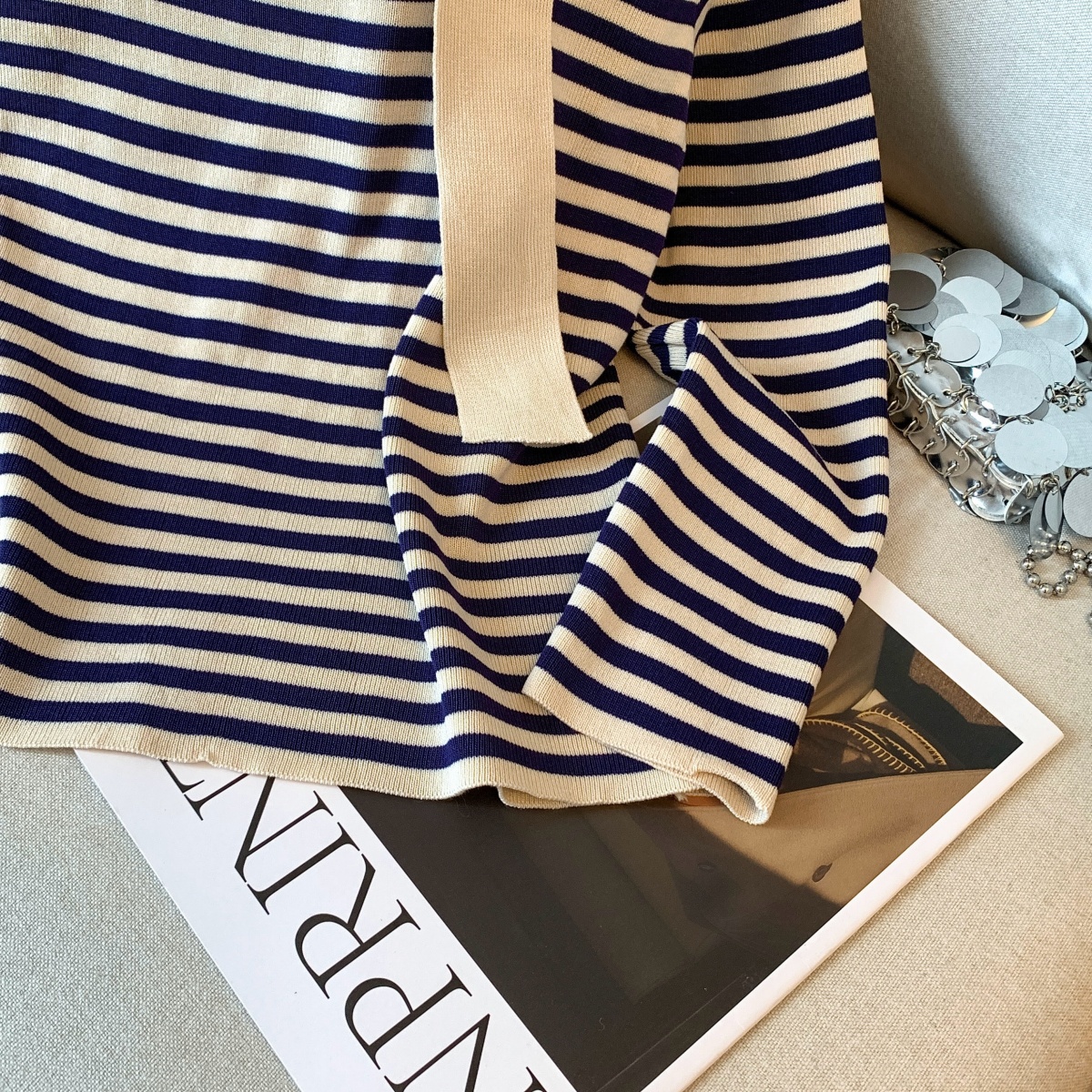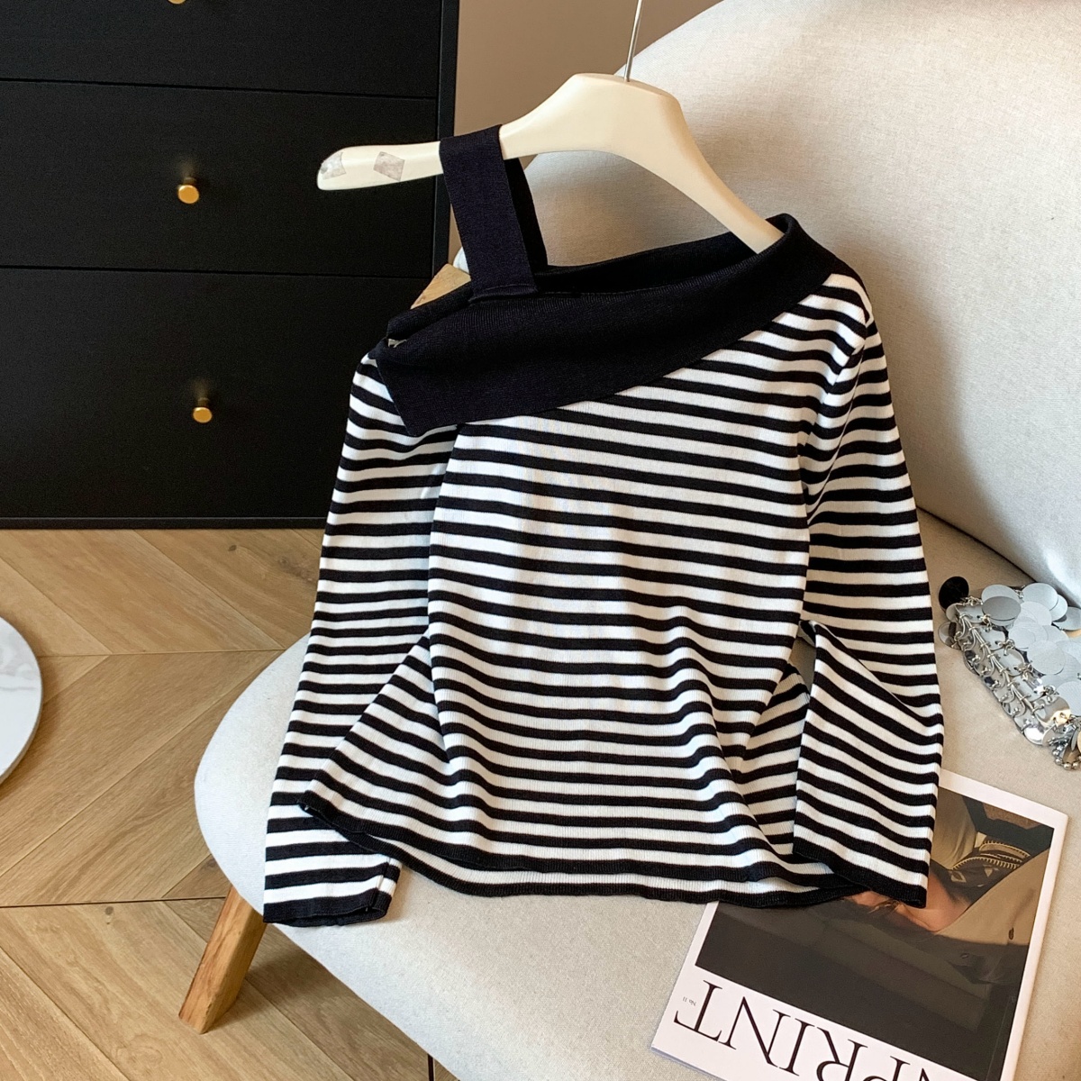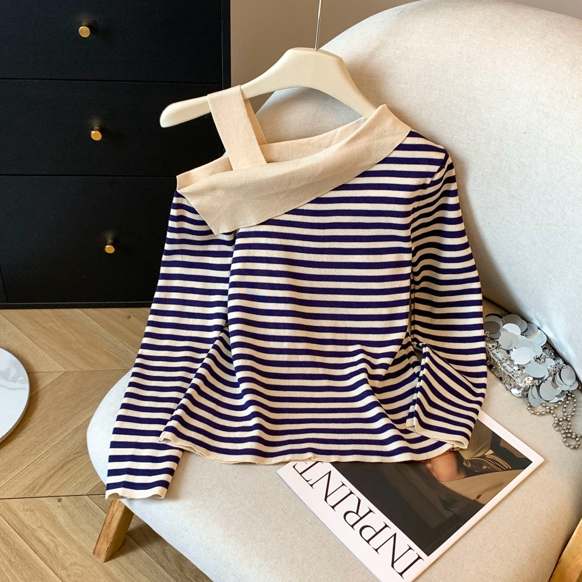 실사 작은 샤넬 스타일 배색 스트라이프 보트넥 오프숄더 니트 스웨터 여성 가을 겨울철 한 부서 분위기 센스 착용 잡아라. 의류