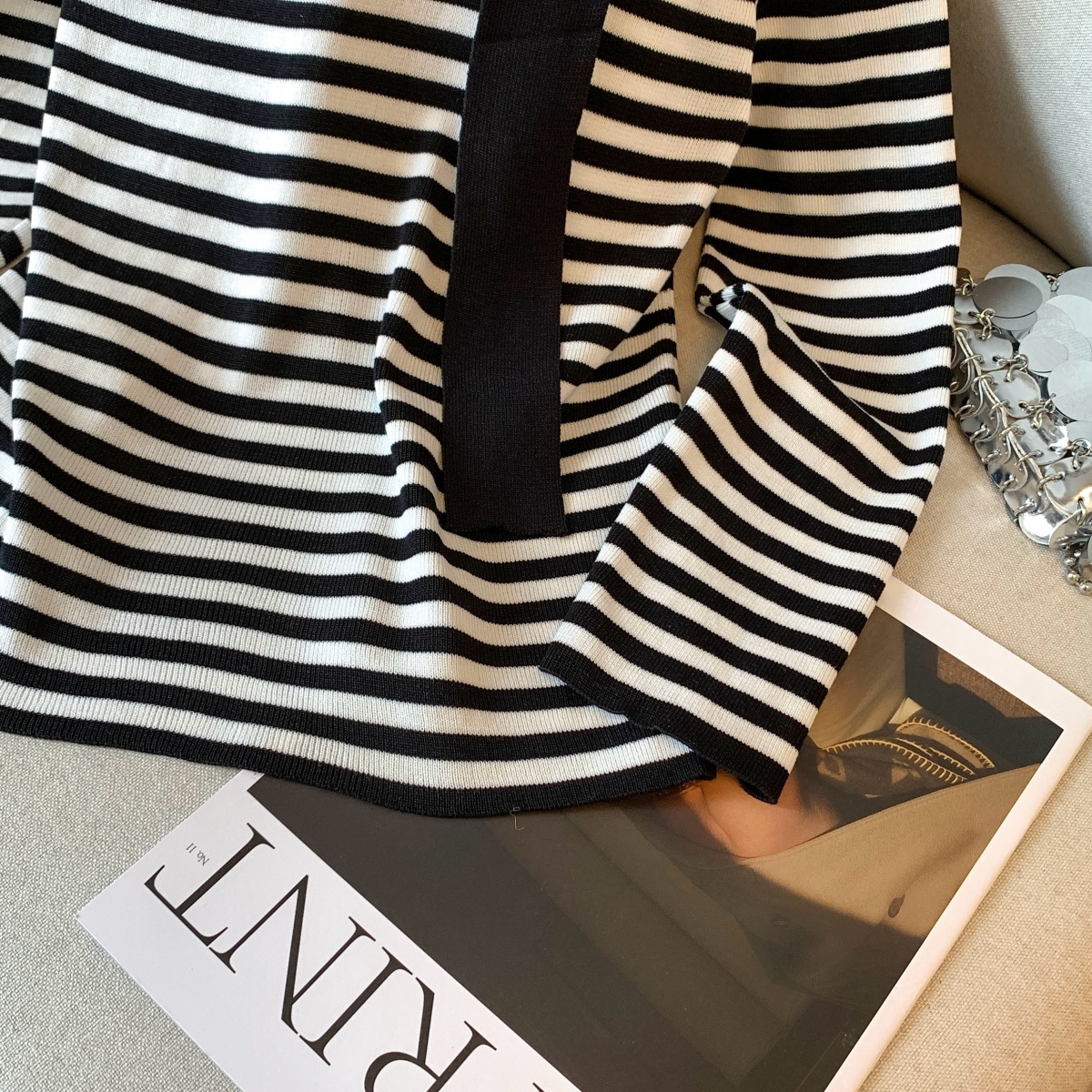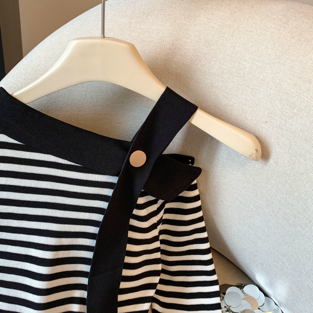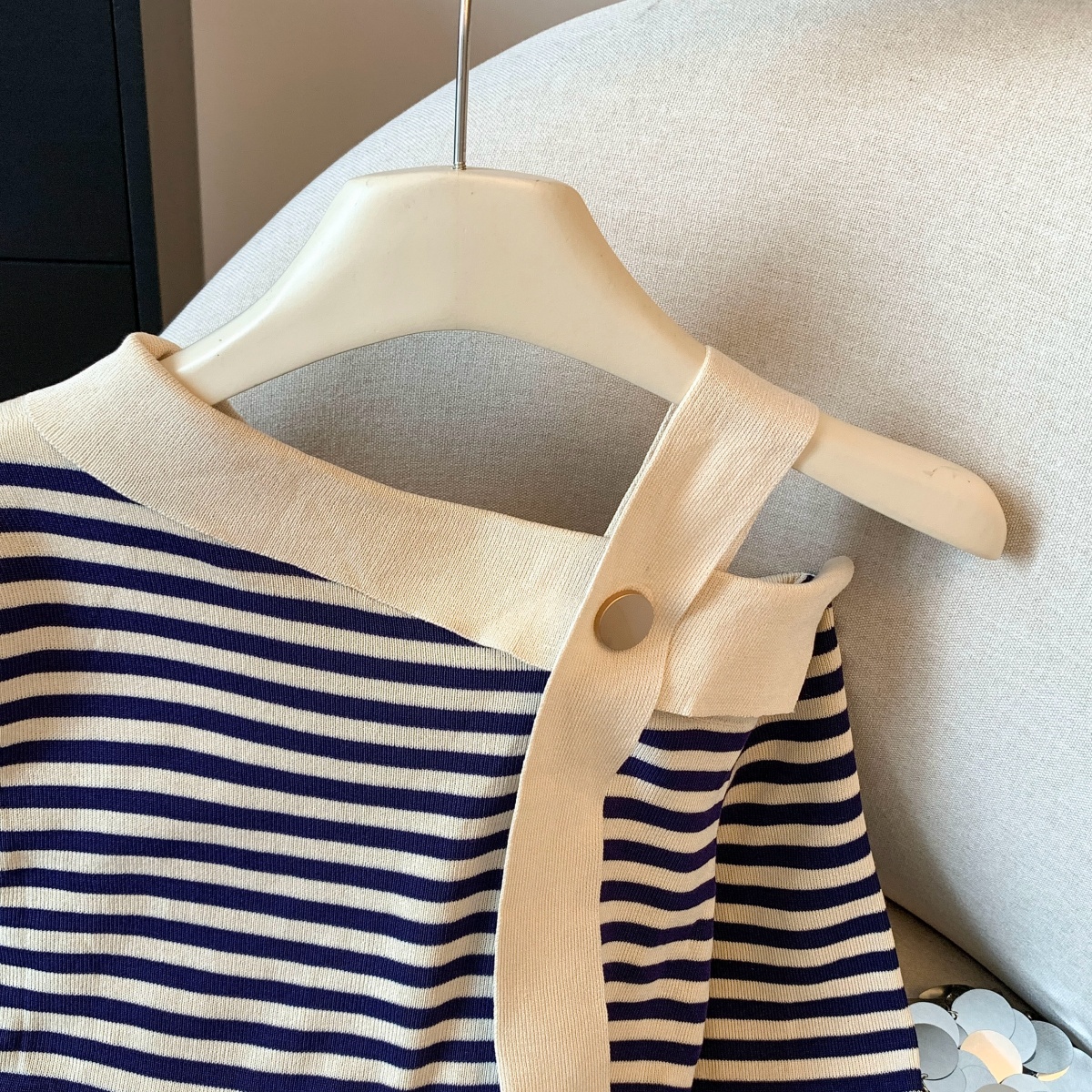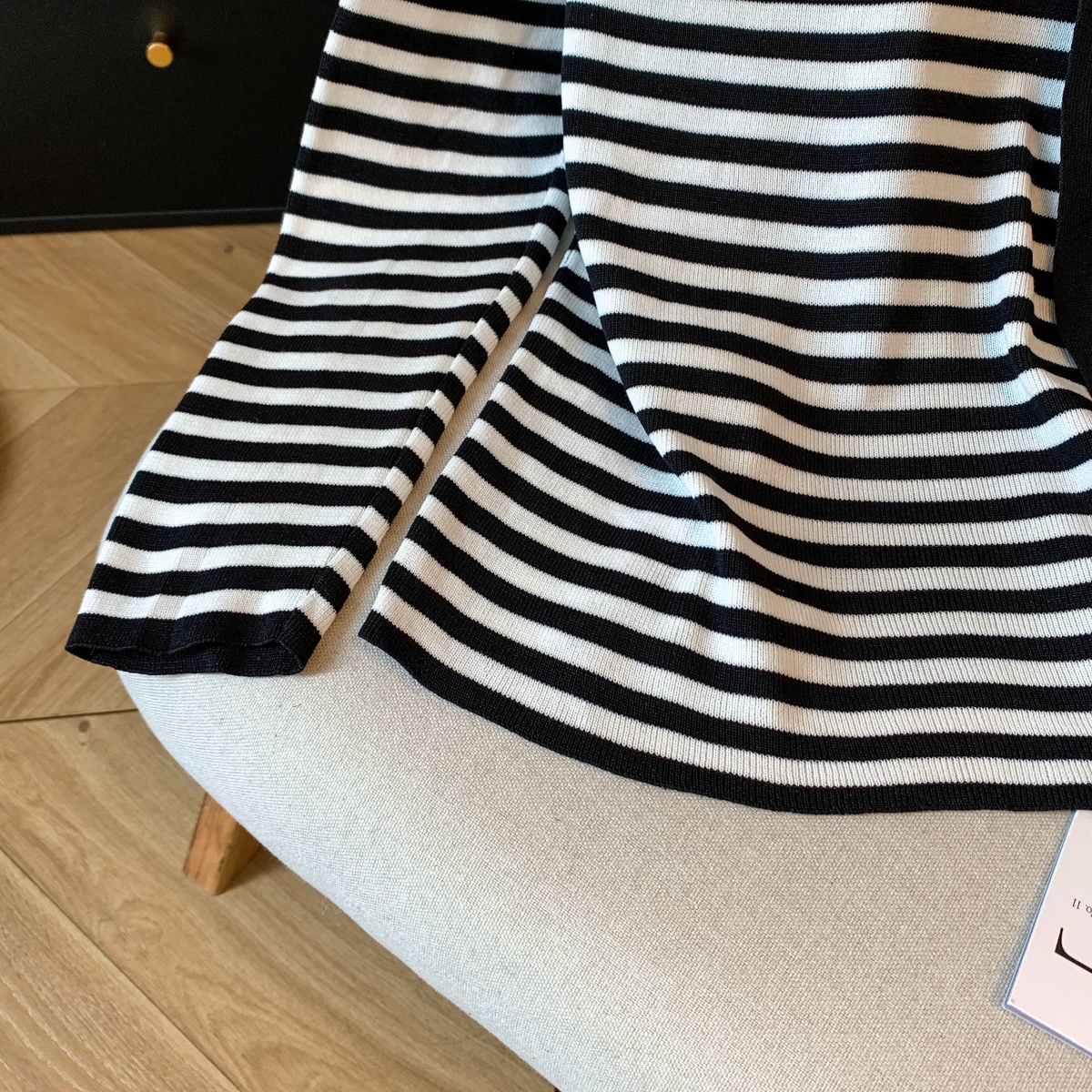 실사 작은 샤넬 스타일 배색 스트라이프 보트넥 오프숄더 니트 스웨터 여성 가을 겨울철 한 부서 분위기 센스 착용 잡아라. 의류
