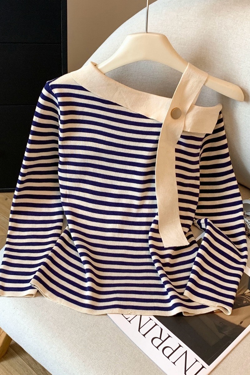 실사 2025 가을 겨울철 새로운 한국 스타일 인터넷 유명인 비스듬한 칼라 오프숄더 몸매 가꾸기 기본 셔츠 니트 스웨터 맨위