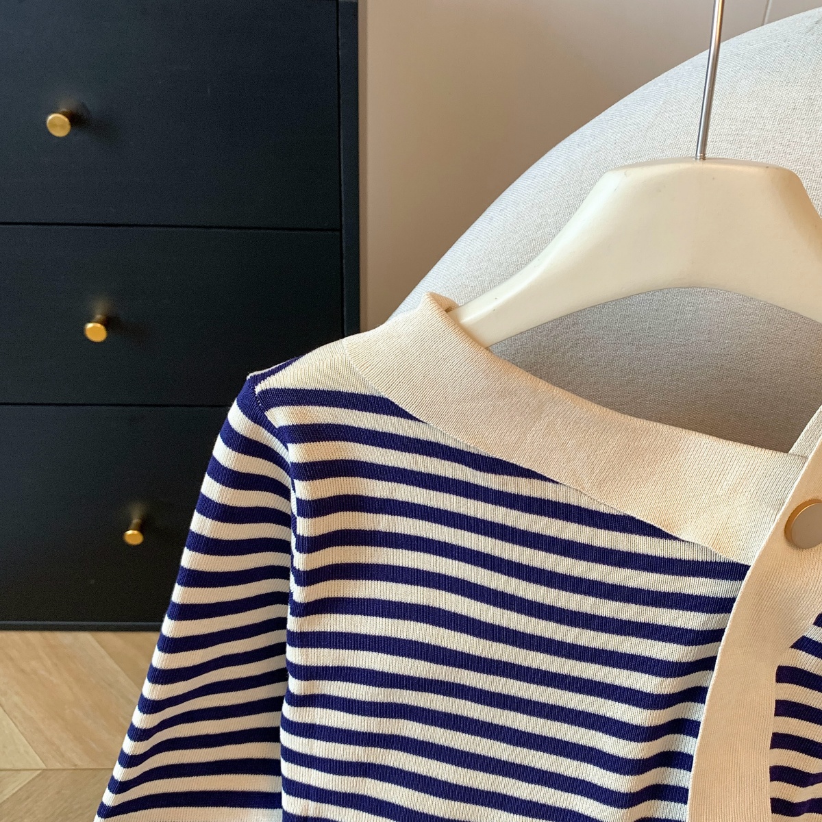 실사 한 부서 작은 청신 품격 다용도 긴팔 어깨 해군 폴로 칼라 스트랩 수평 줄무늬 니트 맨위 풀오버