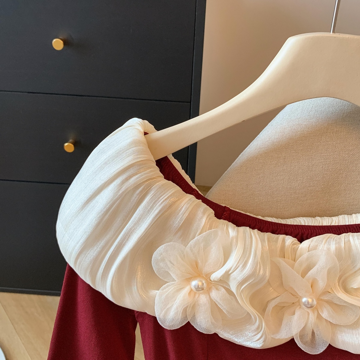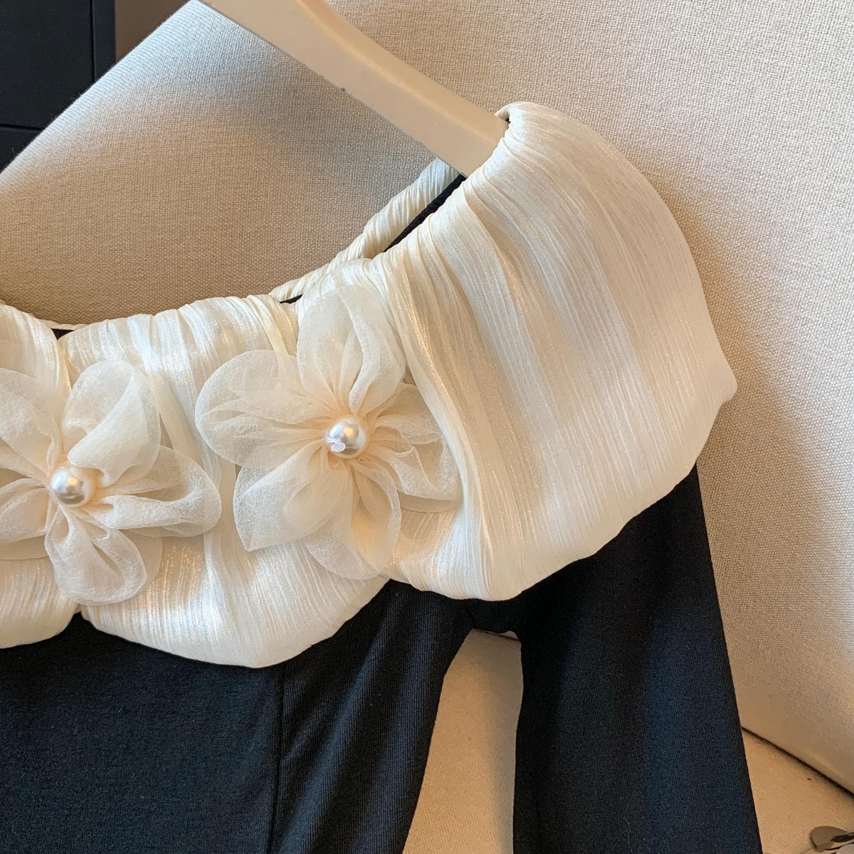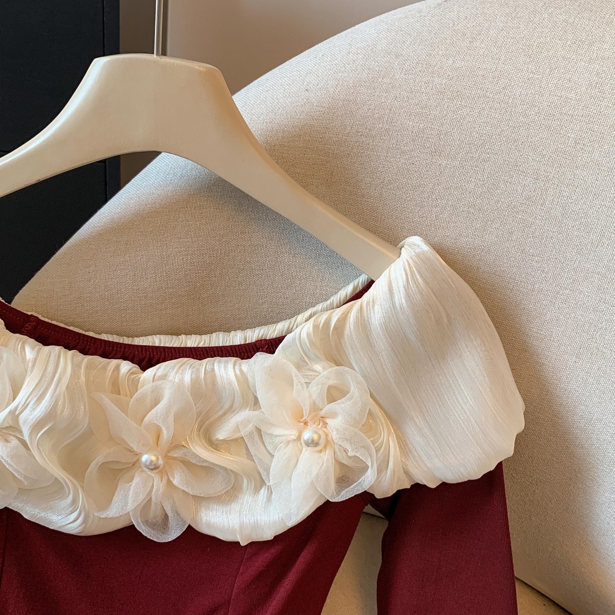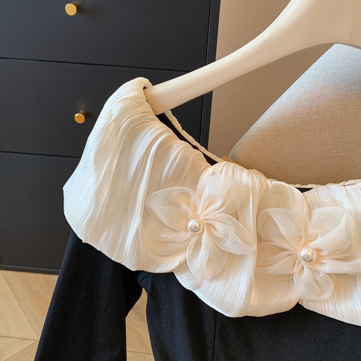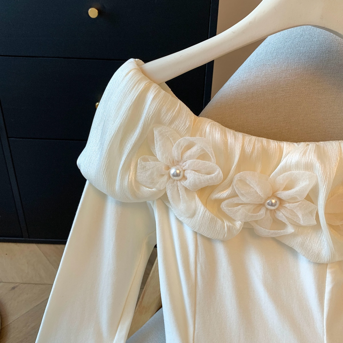 실사 2025 년 새로운 가을 겨울철 쉬폰 오프숄더 달콤함 단색 긴팔 맨위 기본 셔츠