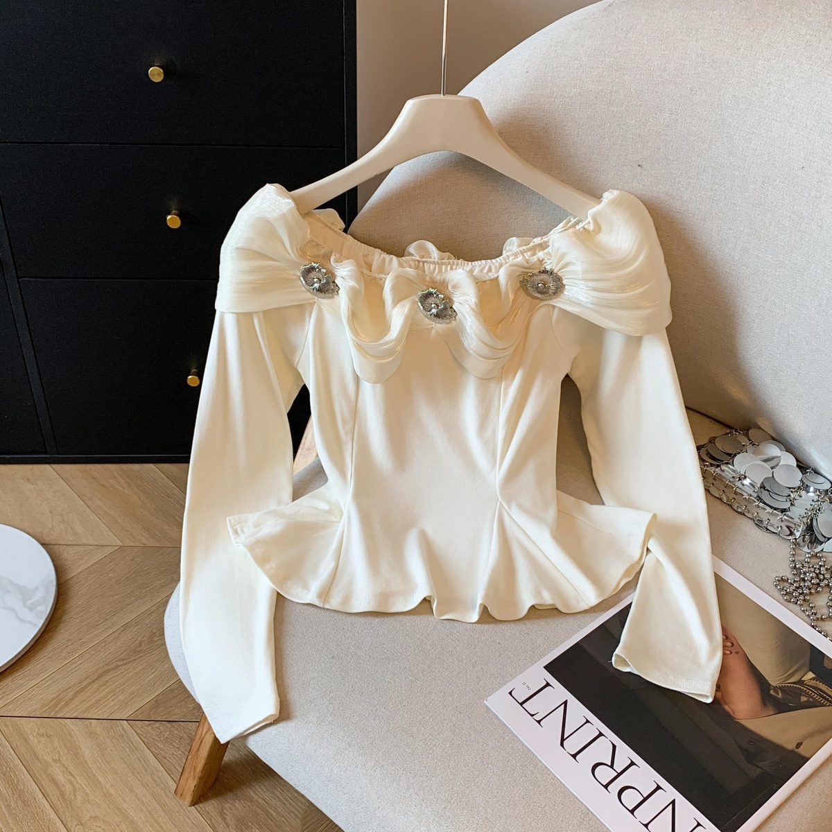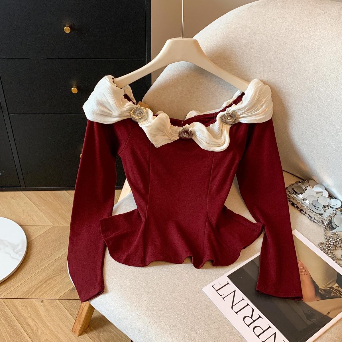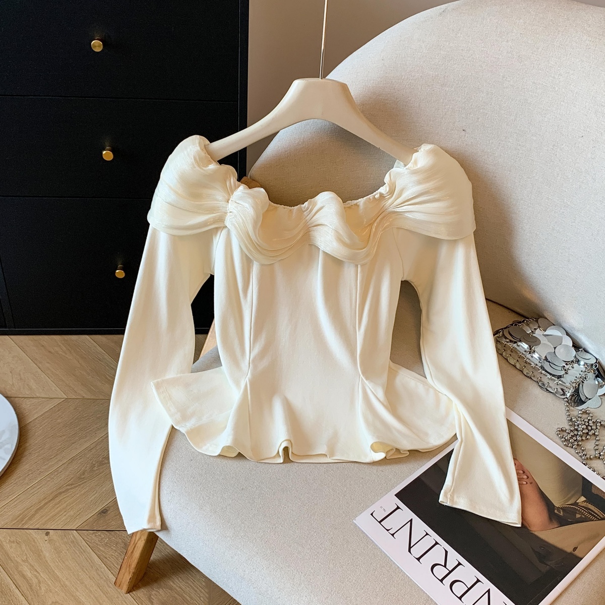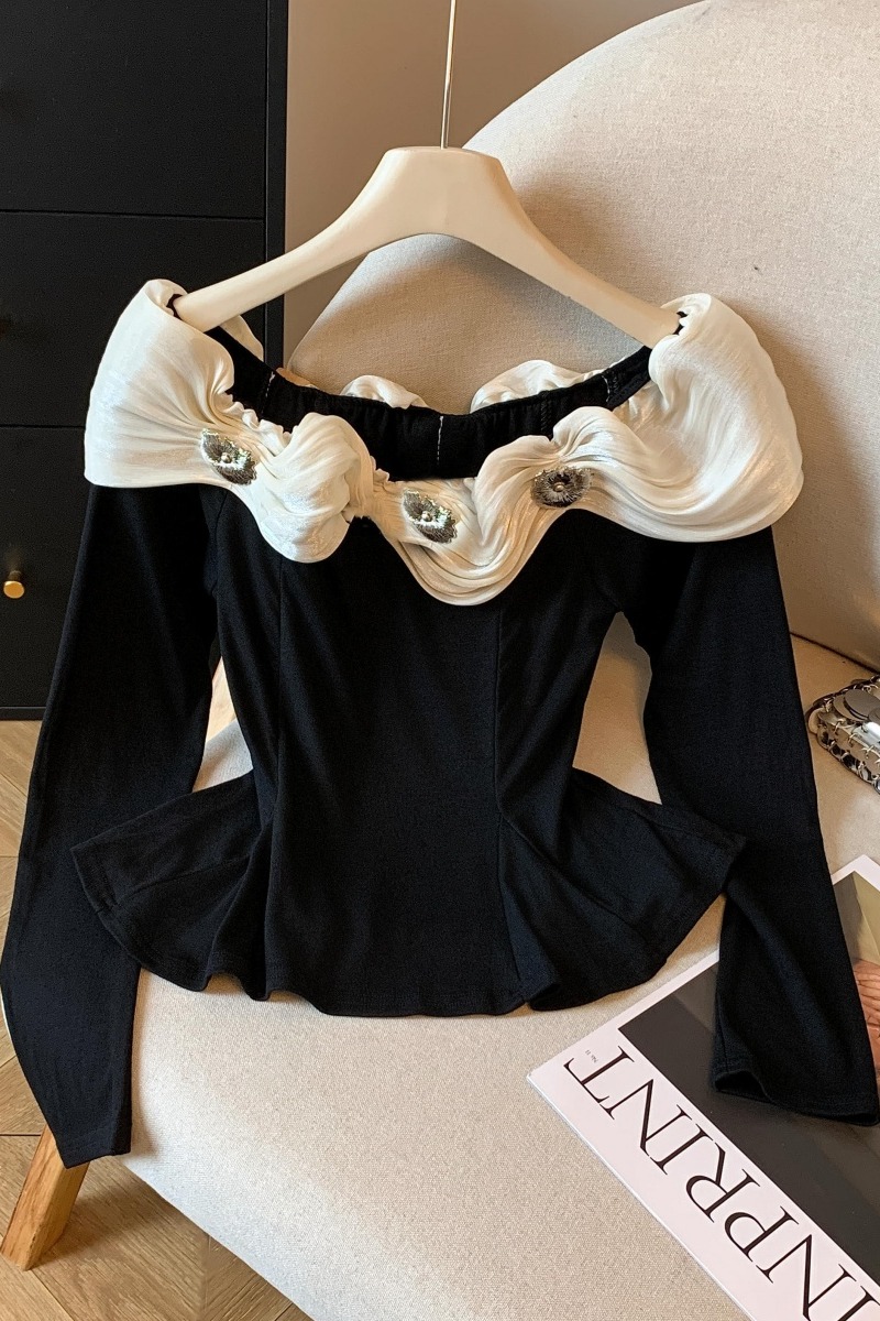 실사 2025 년 새로운 가을 겨울철 쉬폰 오프숄더 달콤함 단색 긴팔 맨위 기본 셔츠