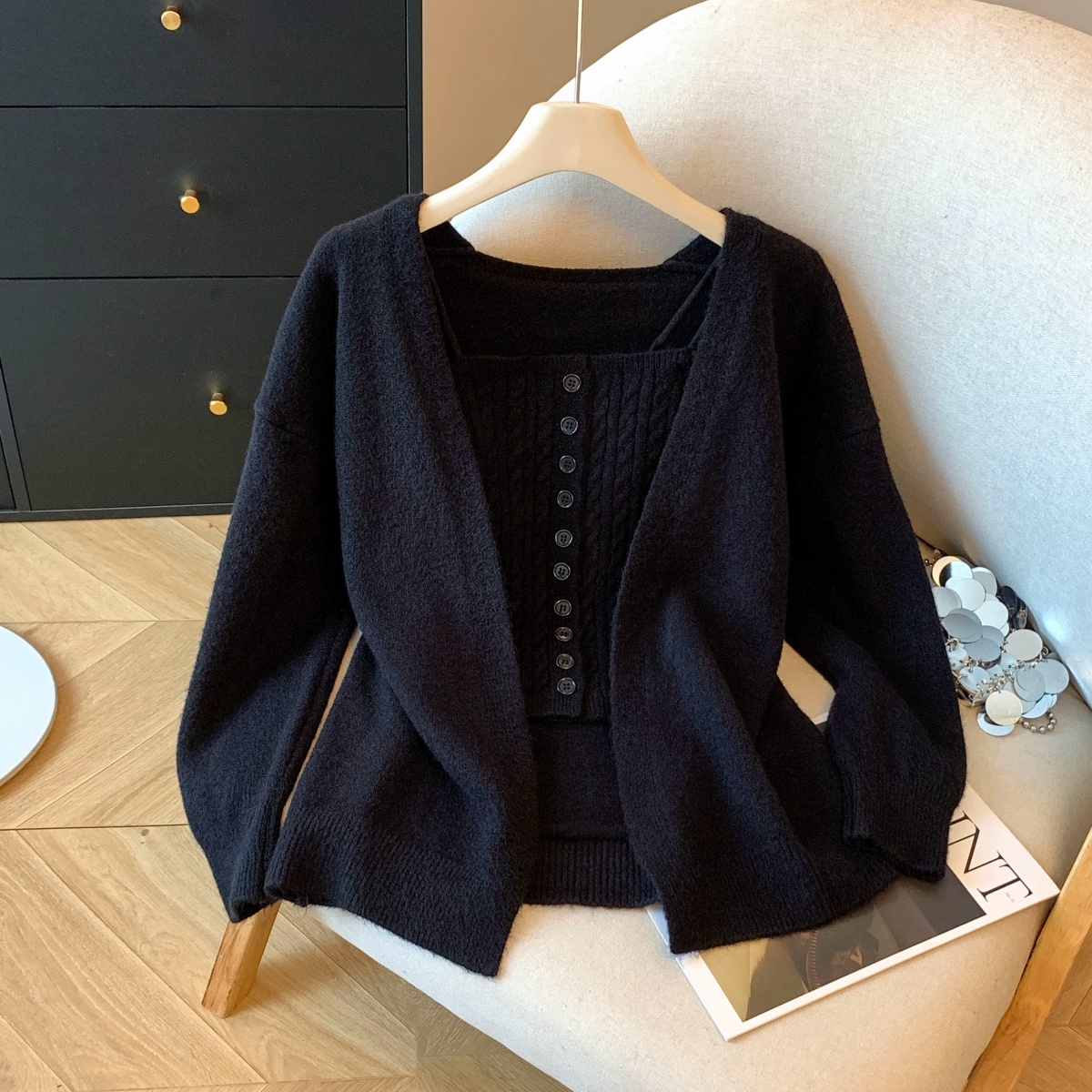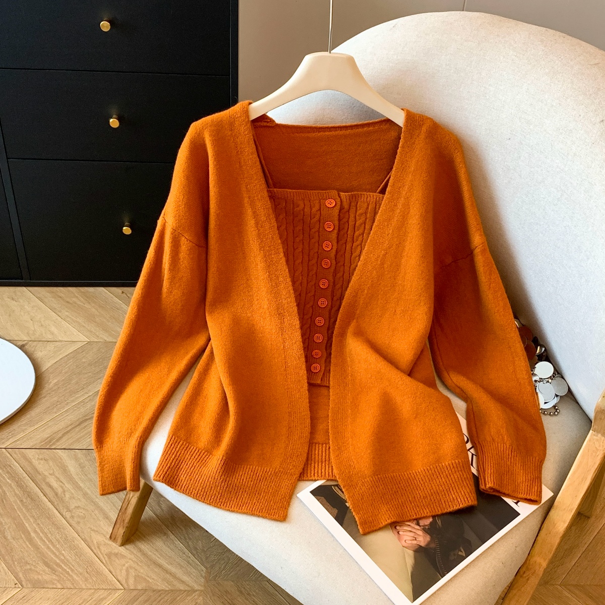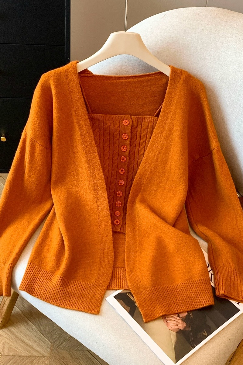 실사 부드러운 바람 화이트 긴팔 니트 오픈 가디건 여성 코트 인사이드 가져 가라. 민소매 꽈배기 캐미솔 세트