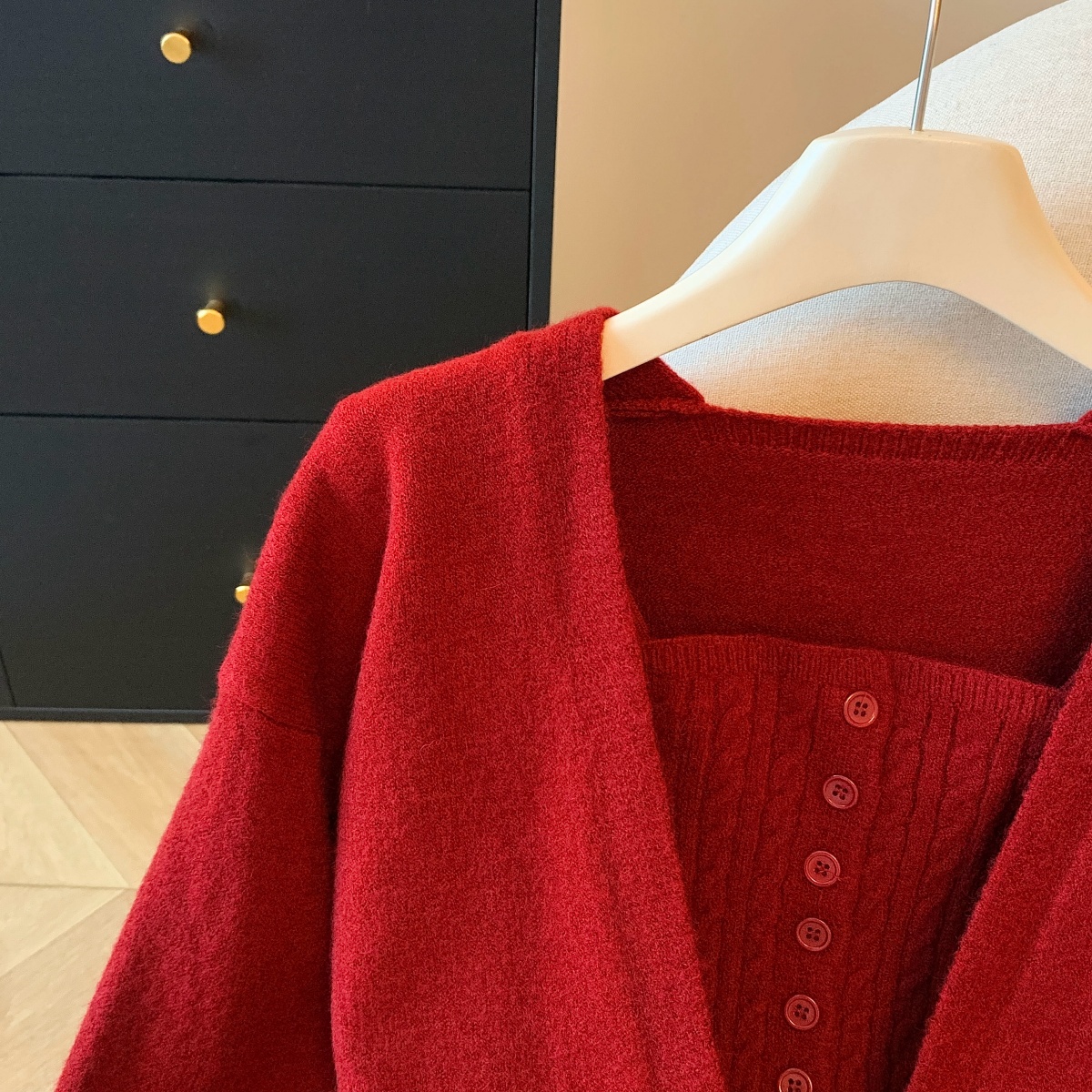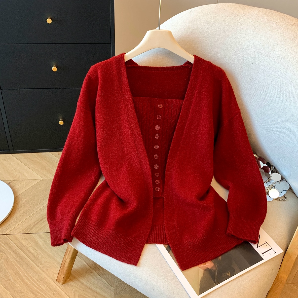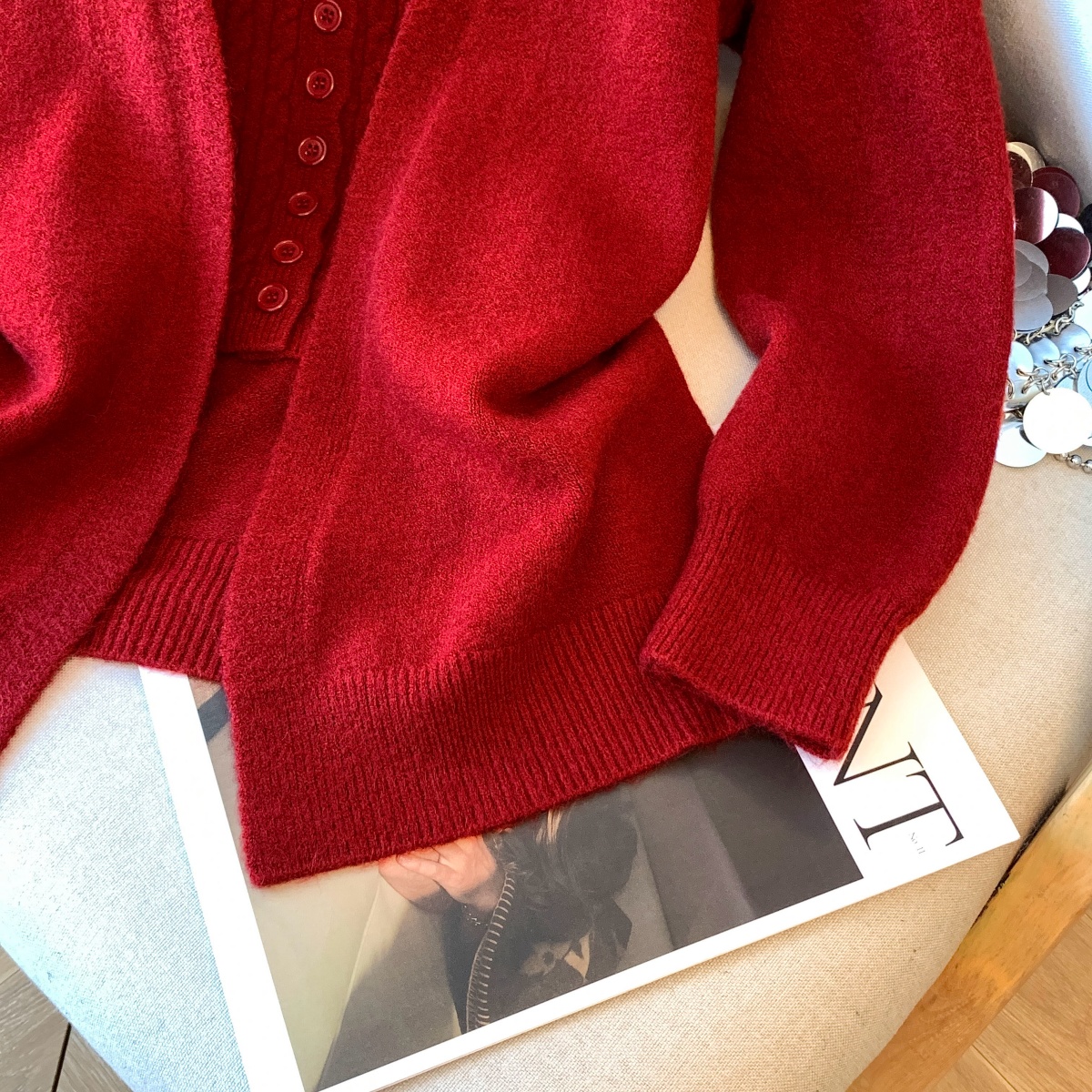 실사 한 부서 레이스 레이스 빨간색 니트 오픈 가디건 여성 가을 겨울 수 있습니다. 외출용 부드러운 루즈핏 스웨터 인사이드 잡아라. 의류